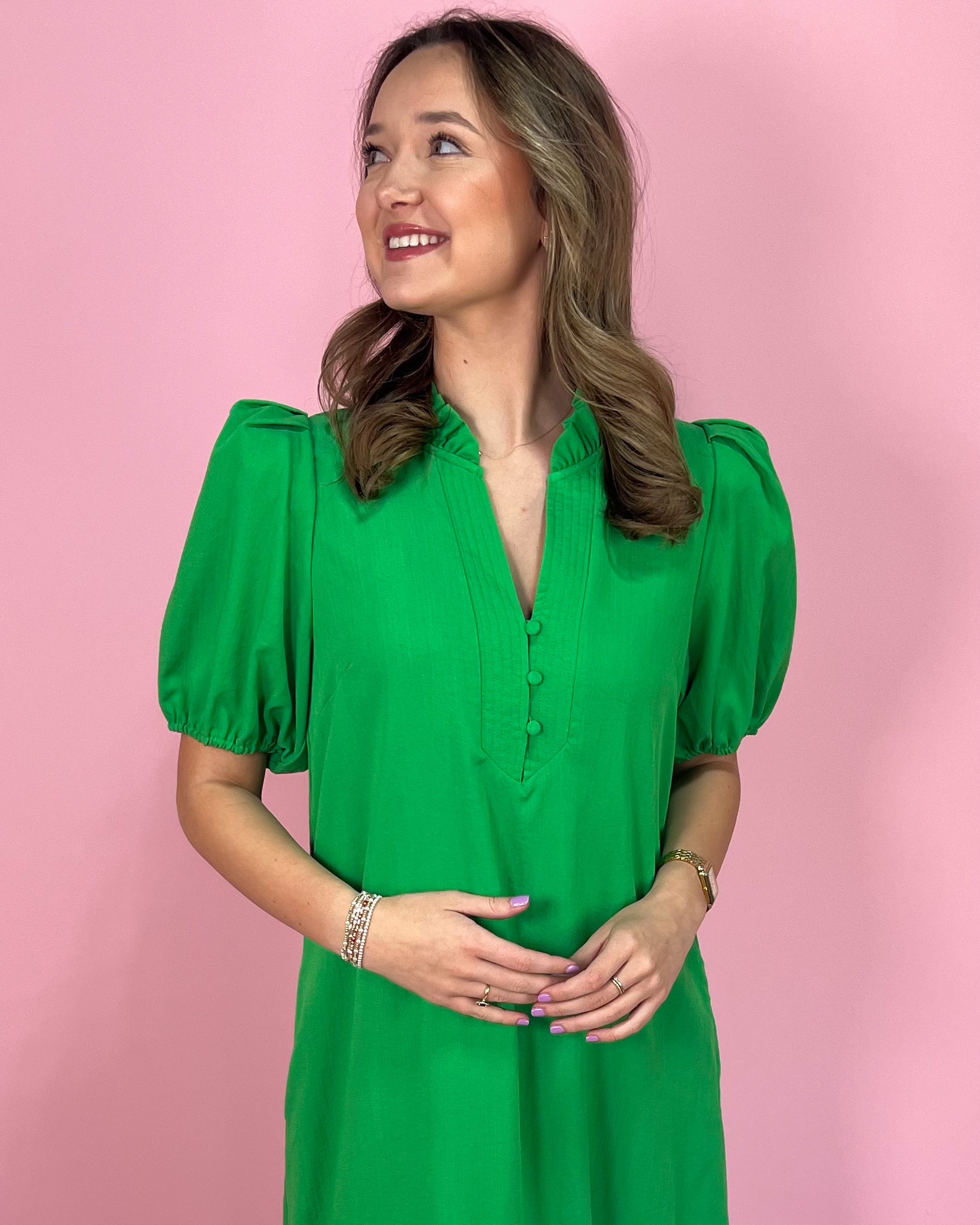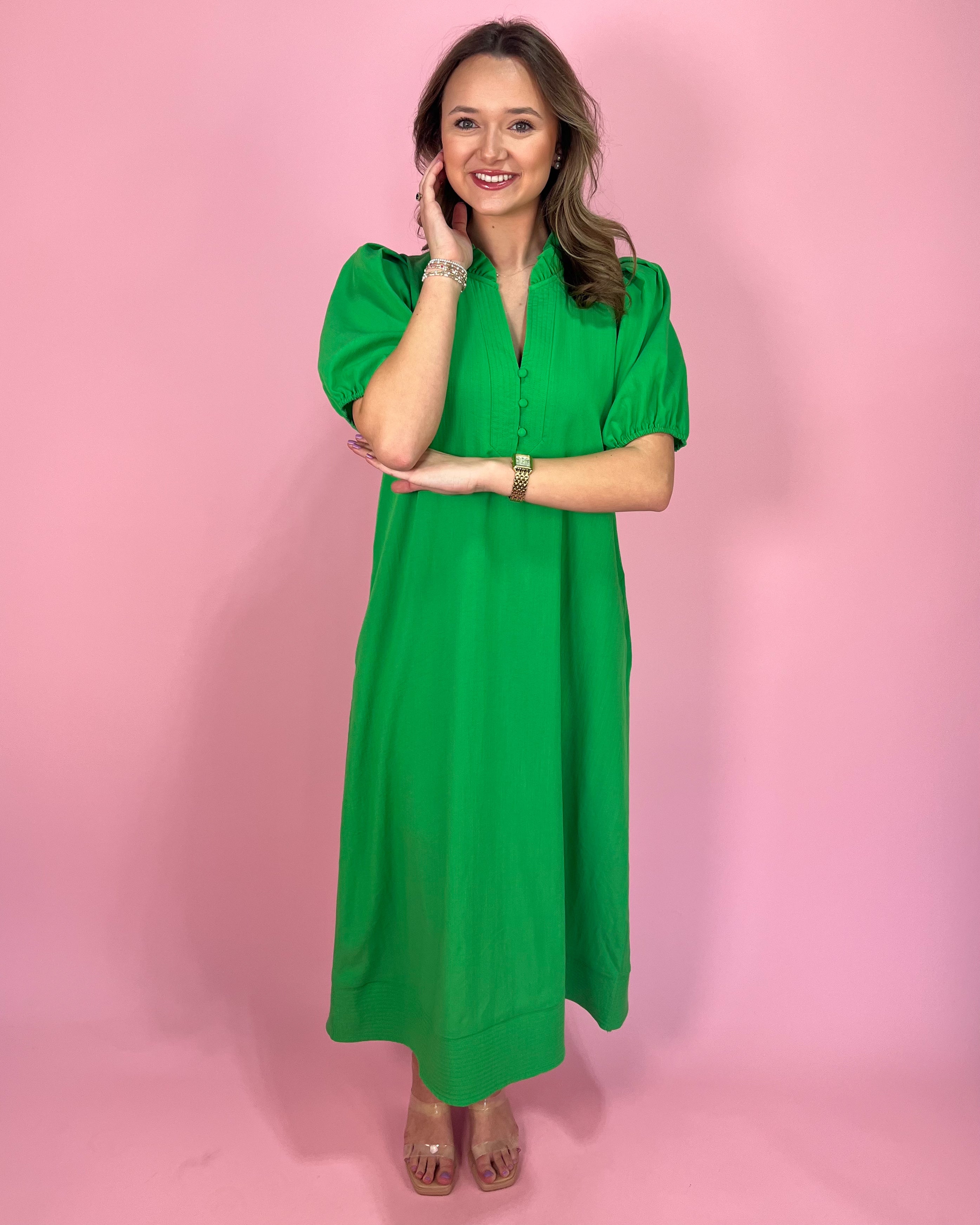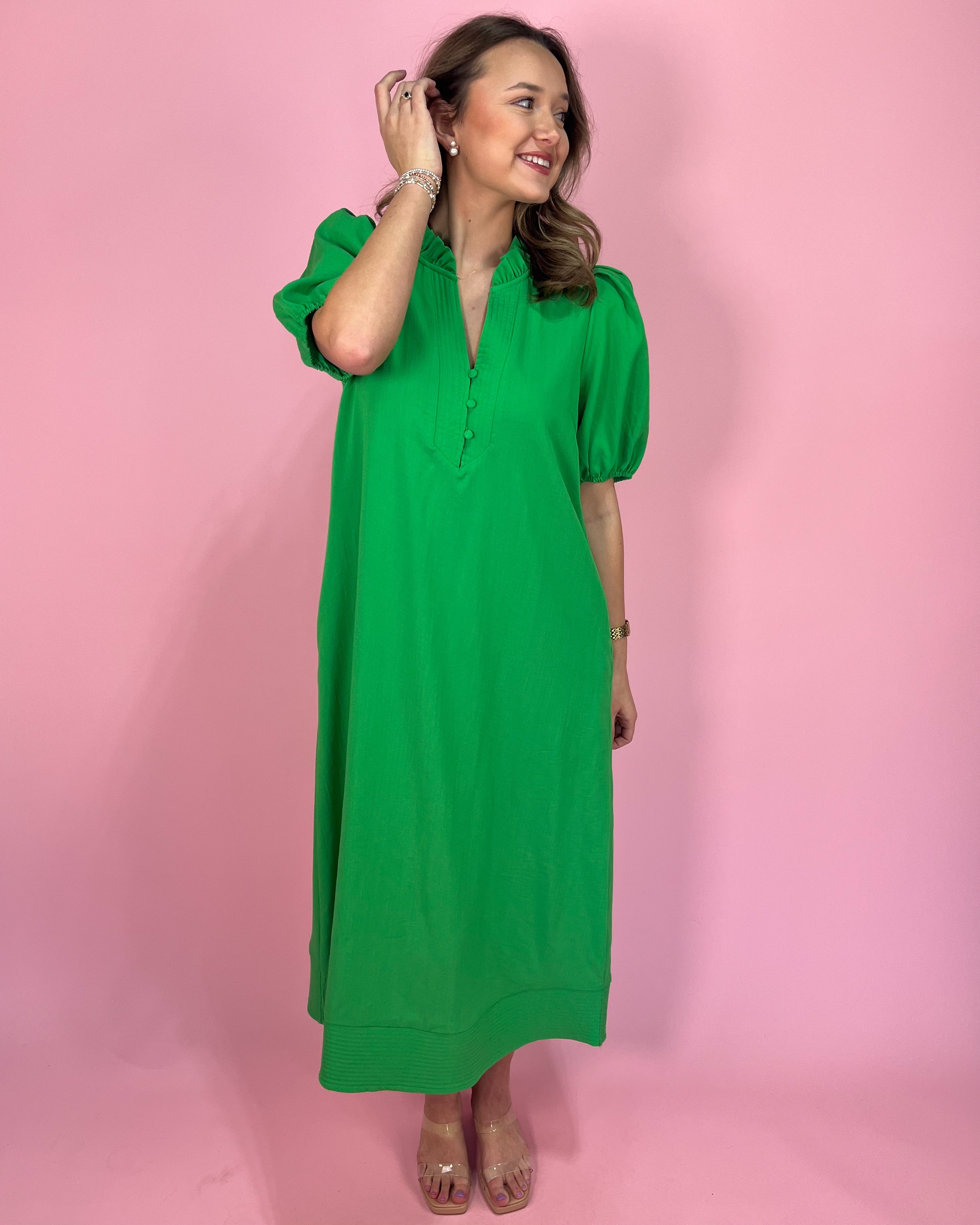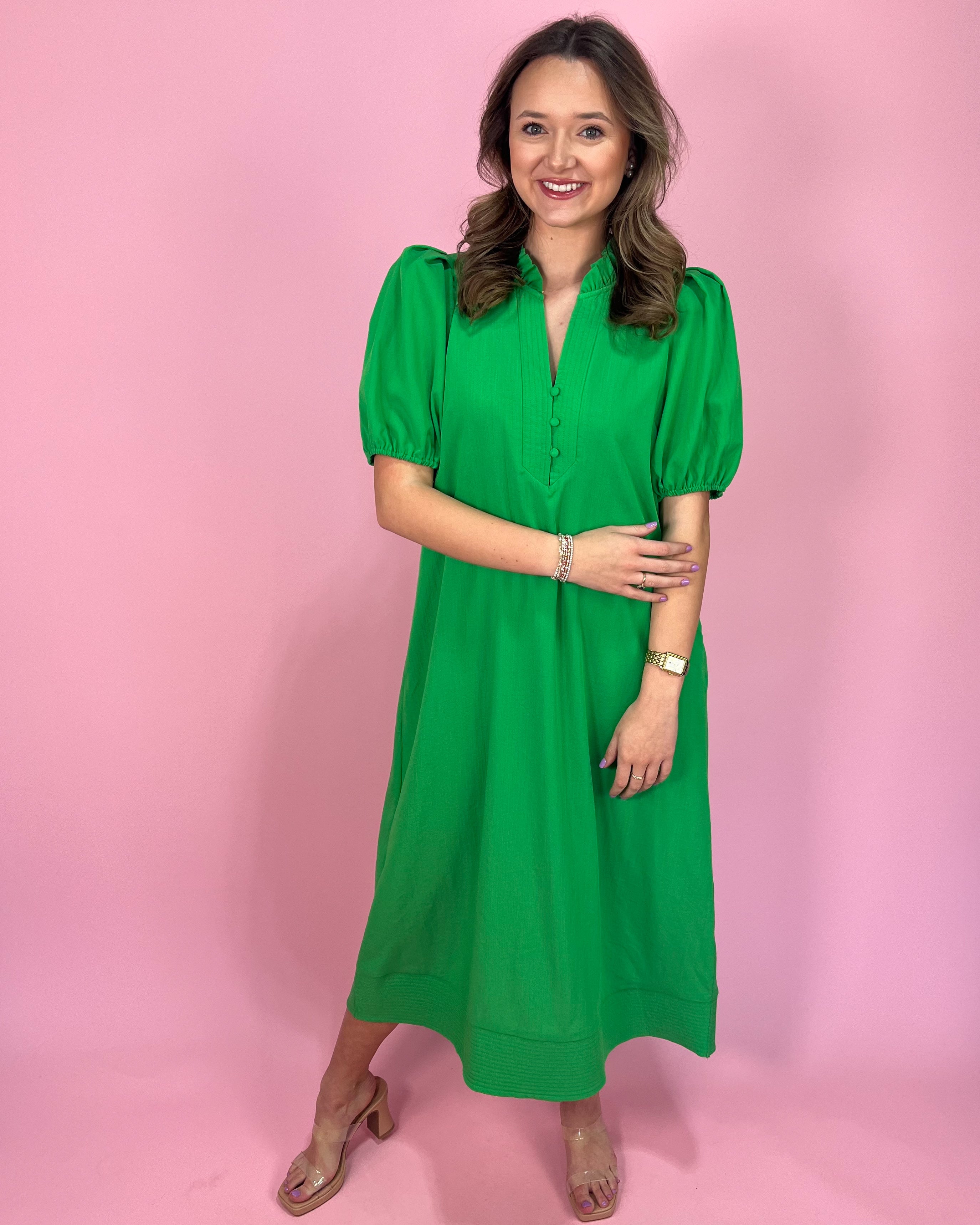 This bold beauty is here to make a statement 💚 The Bright Green Beauty Puff Sleeve Maxi Dress features a vibrant, eye-catching green hue that instantly elevates your wardrobe. The lightweight fabric drapes beautifully, giving you that effortless flow with every step.