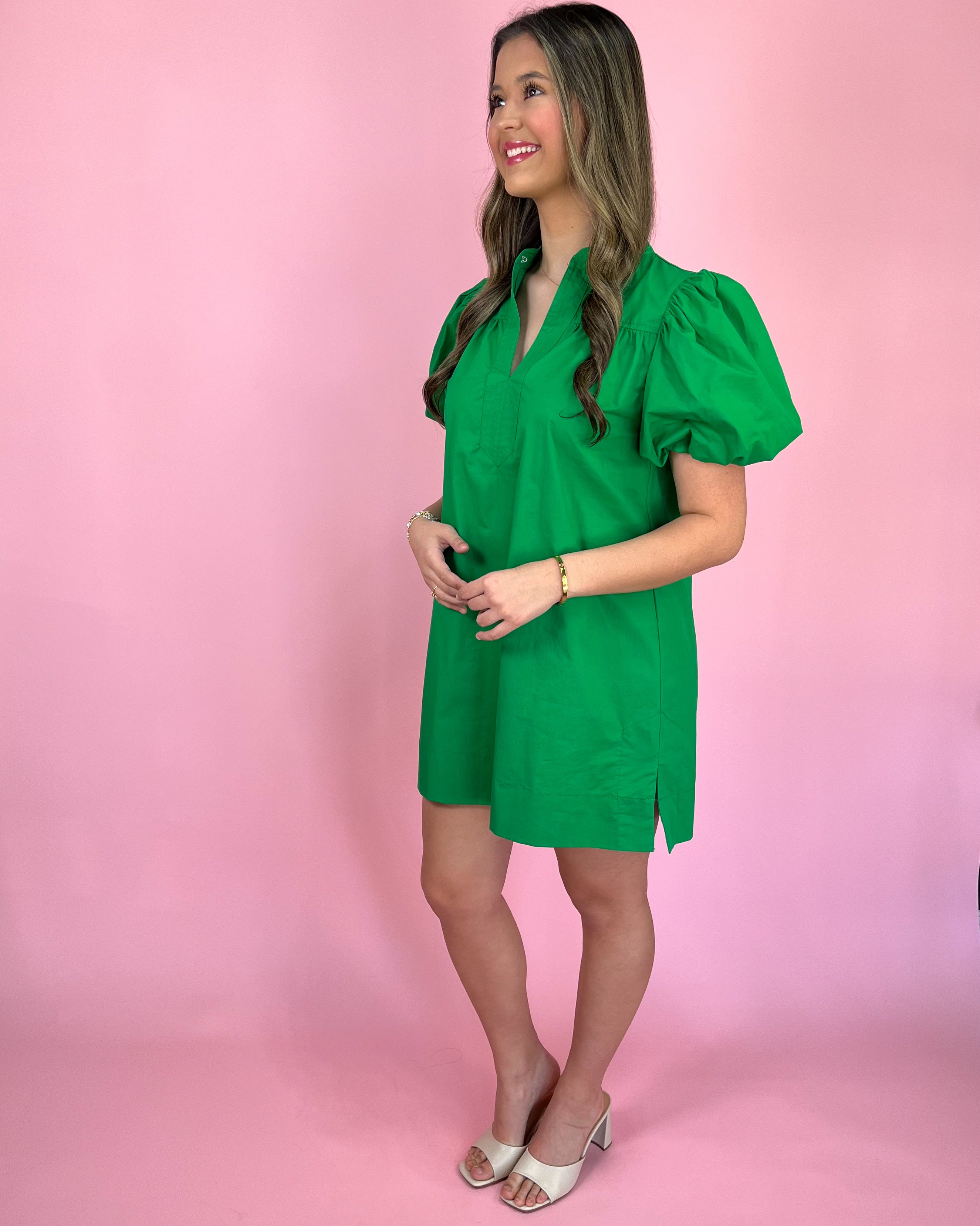 The Enchanted Emerald Mini Dress is flattering, fun, and undeniably eye-catching. From the dramatic sleeves to the rich green color, it’s the kind of dress that makes you feel confident, polished, and ready for anything — no extra styling required.