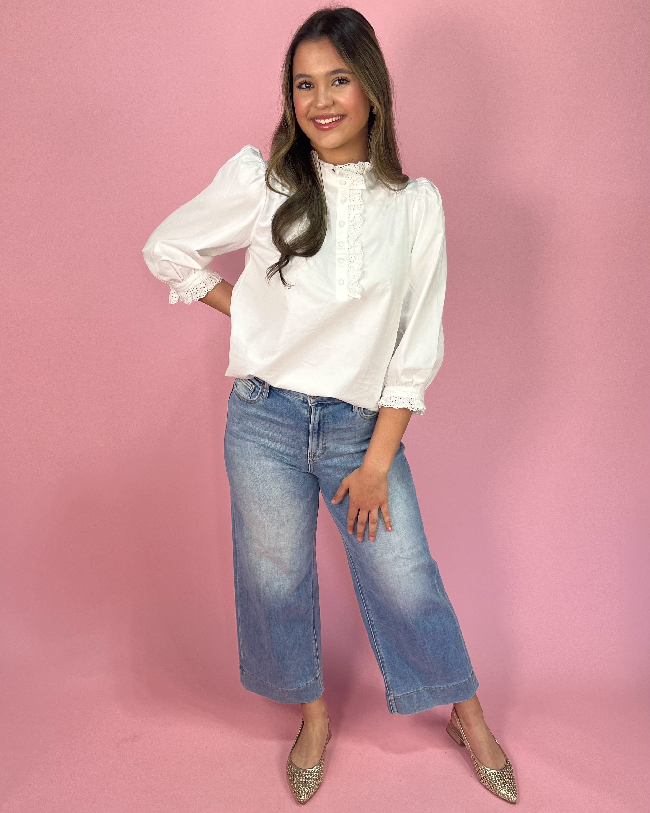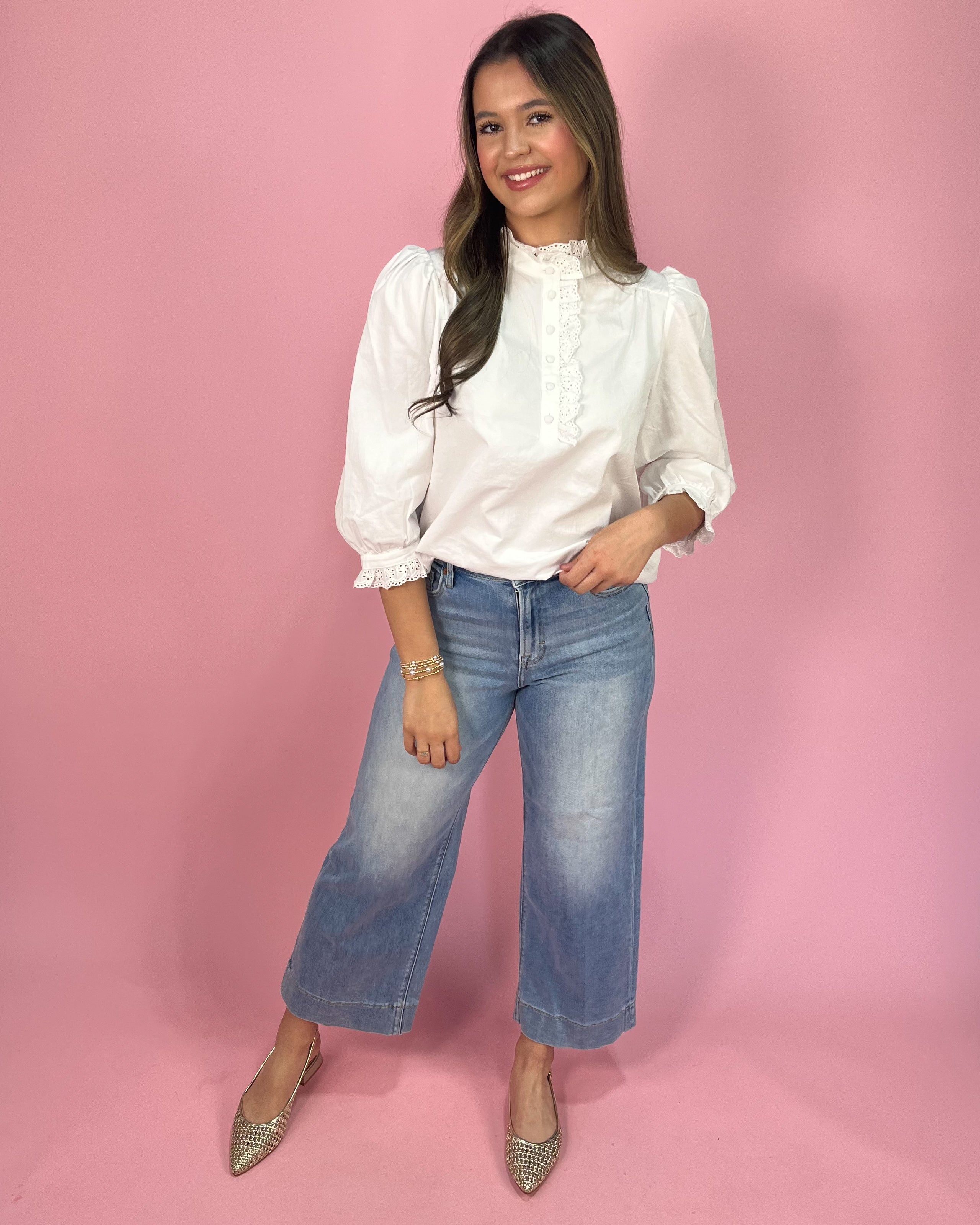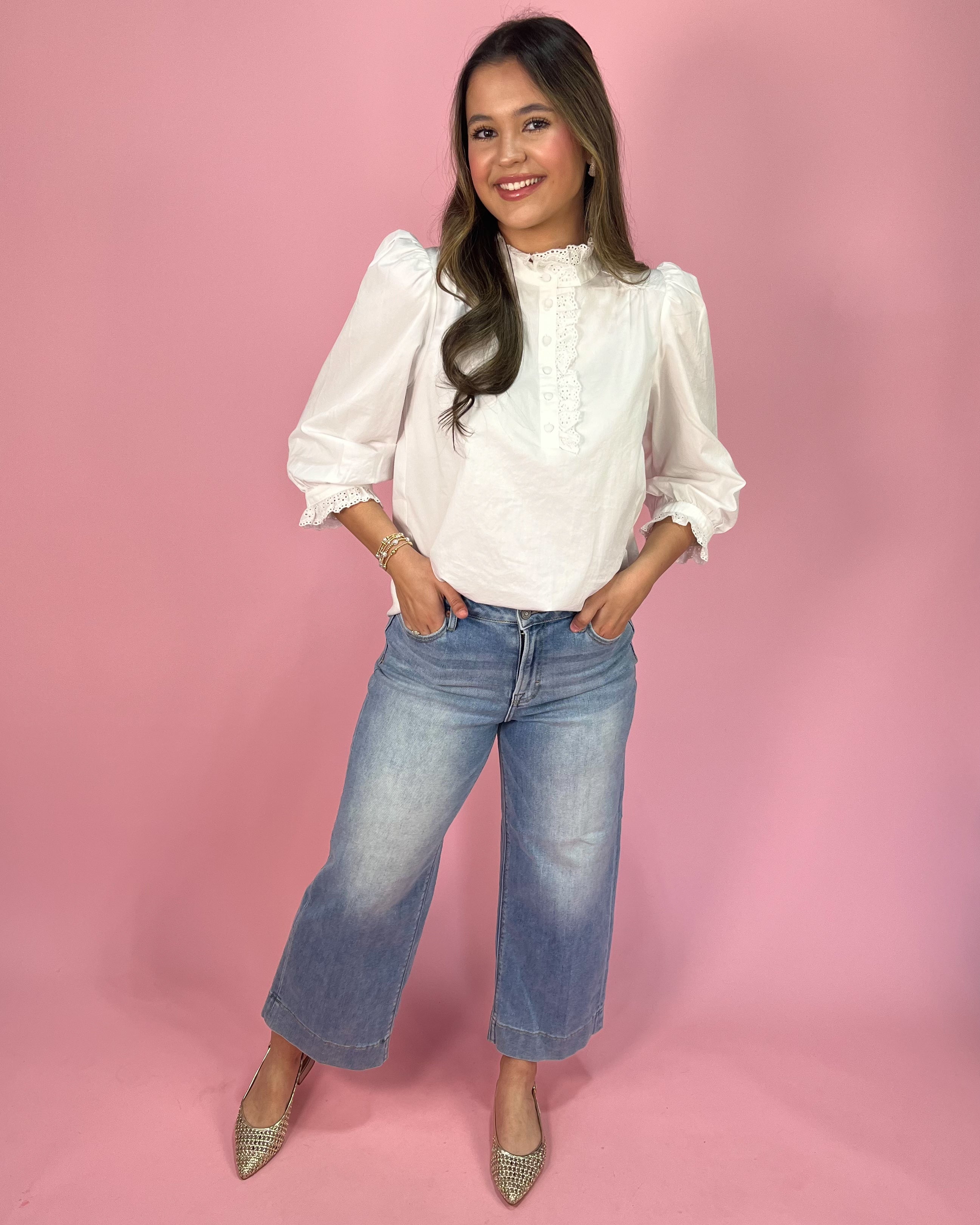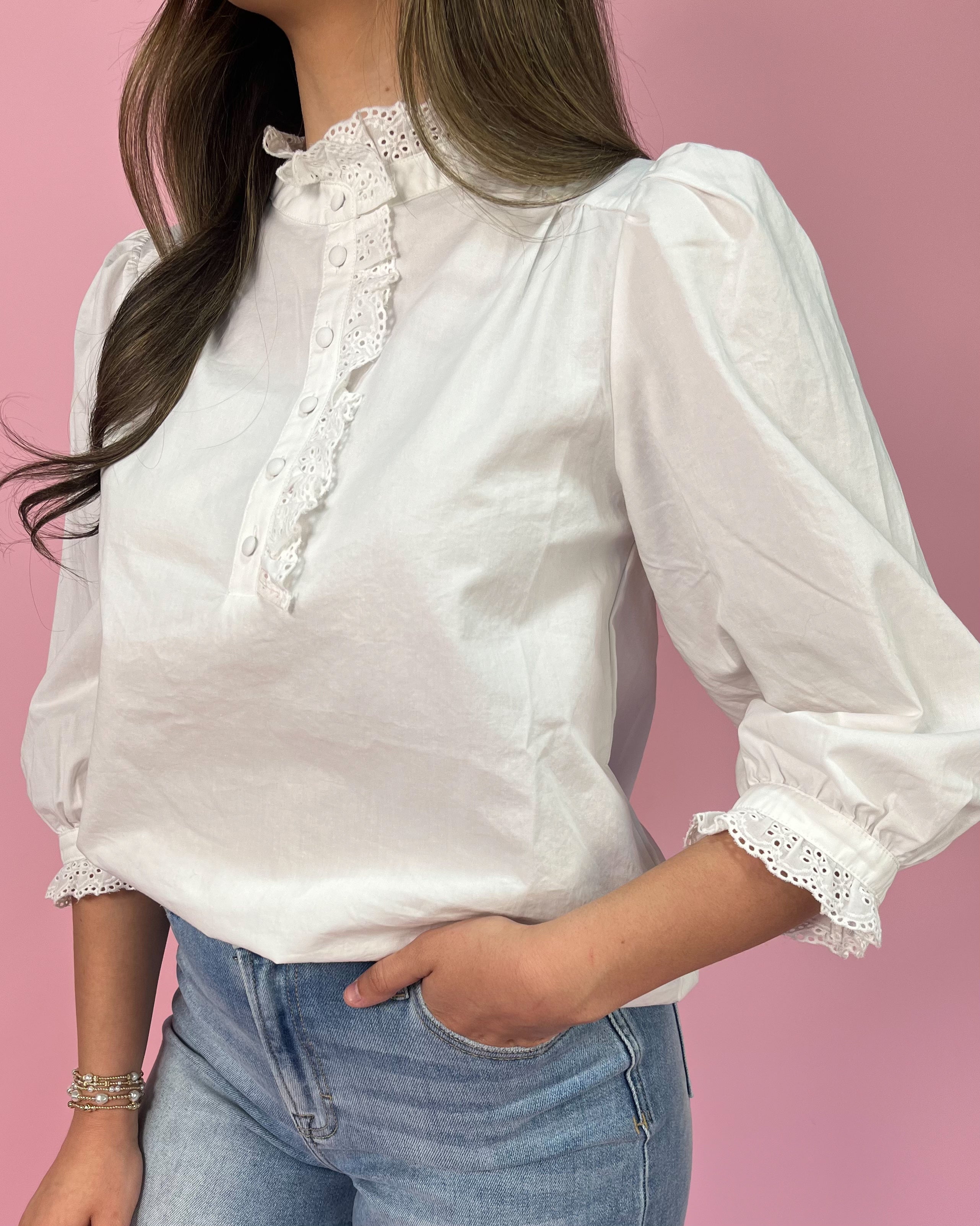 This crisp white blouse is the definition of timeless charm. Designed in 100% cotton, it features delicate eyelet lace trim along the high neckline and down the front placket for a soft, feminine finish. The subtle ruffle detail adds texture without overwhelming the silhouette, making it an easy statement piece you’ll reach for again and again.