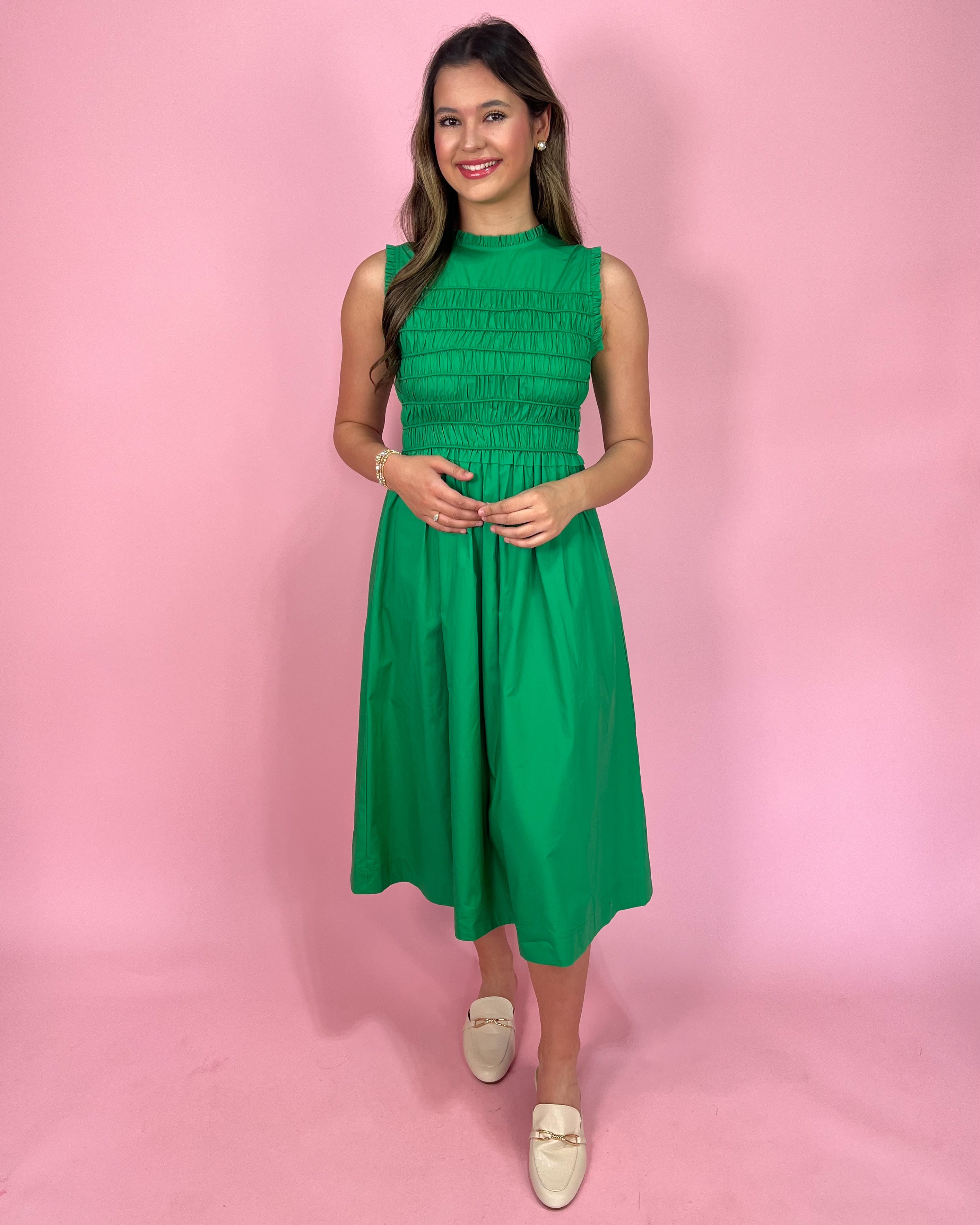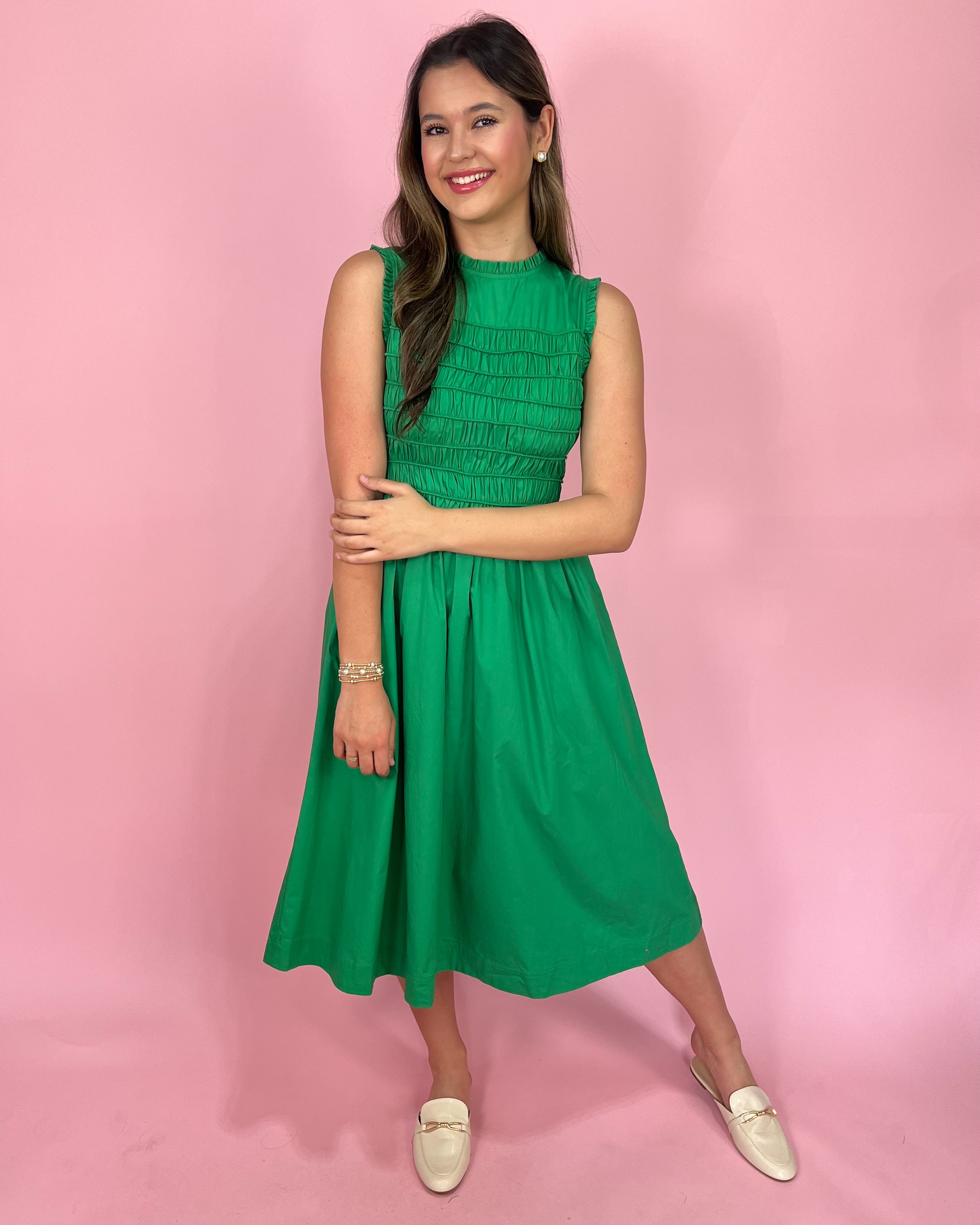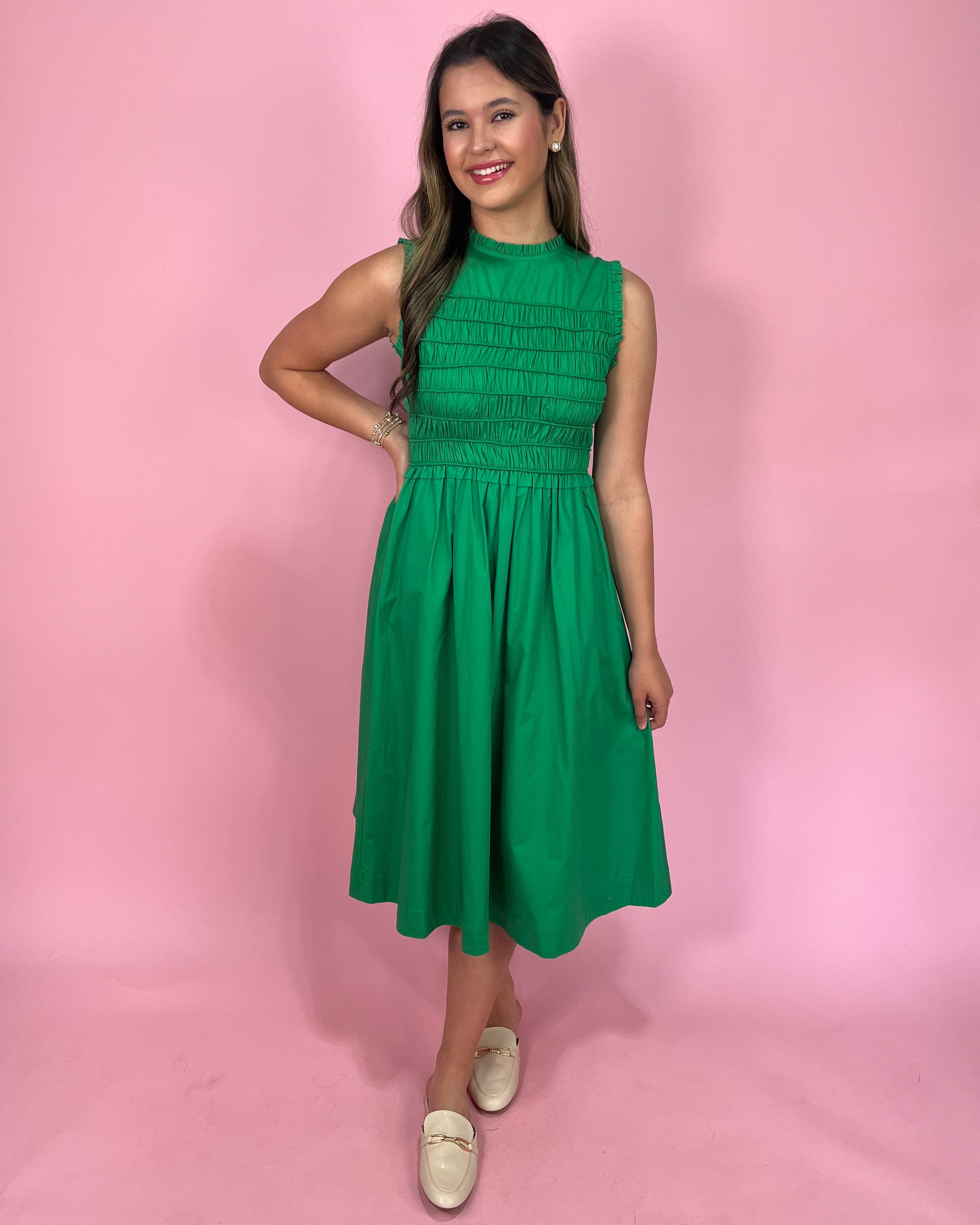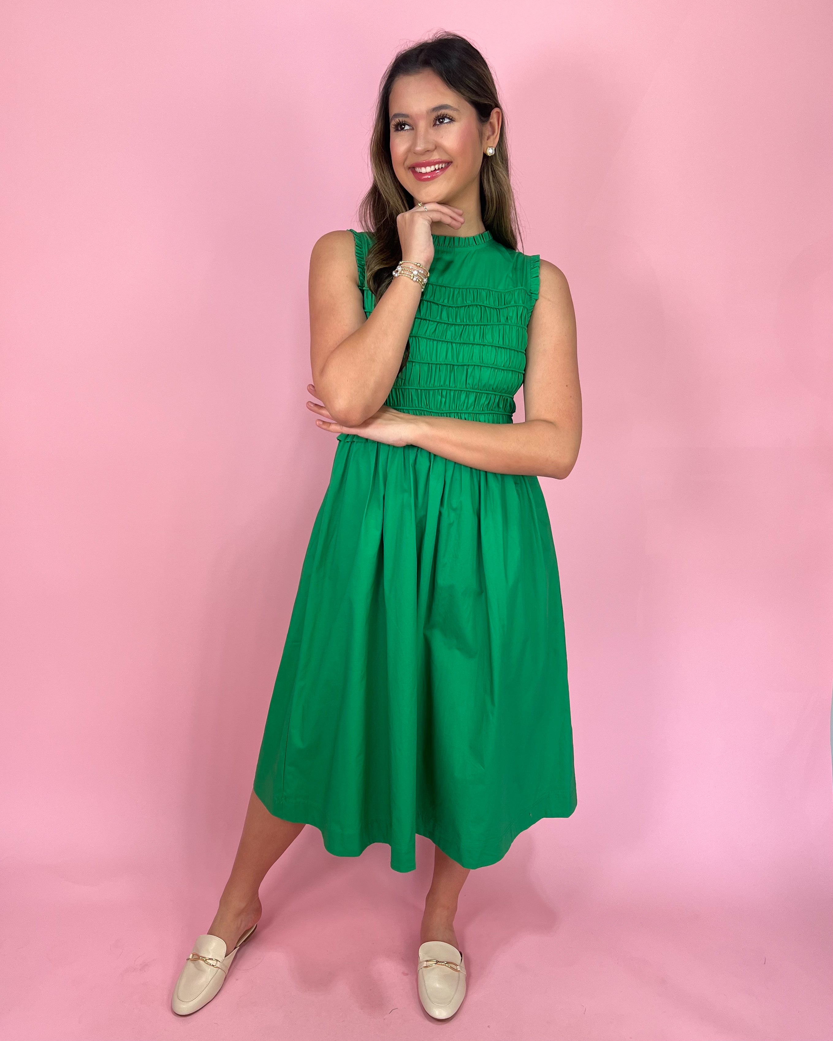 Designed with a flattering smocked bodice that cinches beautifully at the waist, this midi features feminine ruffle trim along the shoulders and neckline for just the right touch of detail. The exposed front zipper adds a modern edge and allows you to adjust the neckline to your liking. The skirt flows into a breezy midi length that moves beautifully with every step.