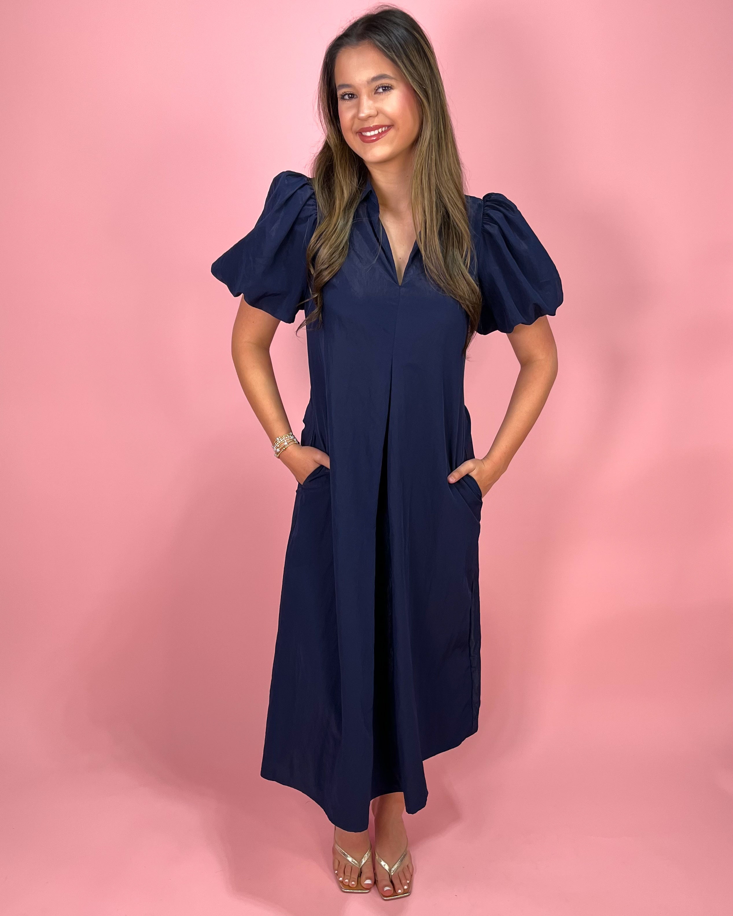 Midnight in Manhattan Collared Puff Sleeve Midi Dress