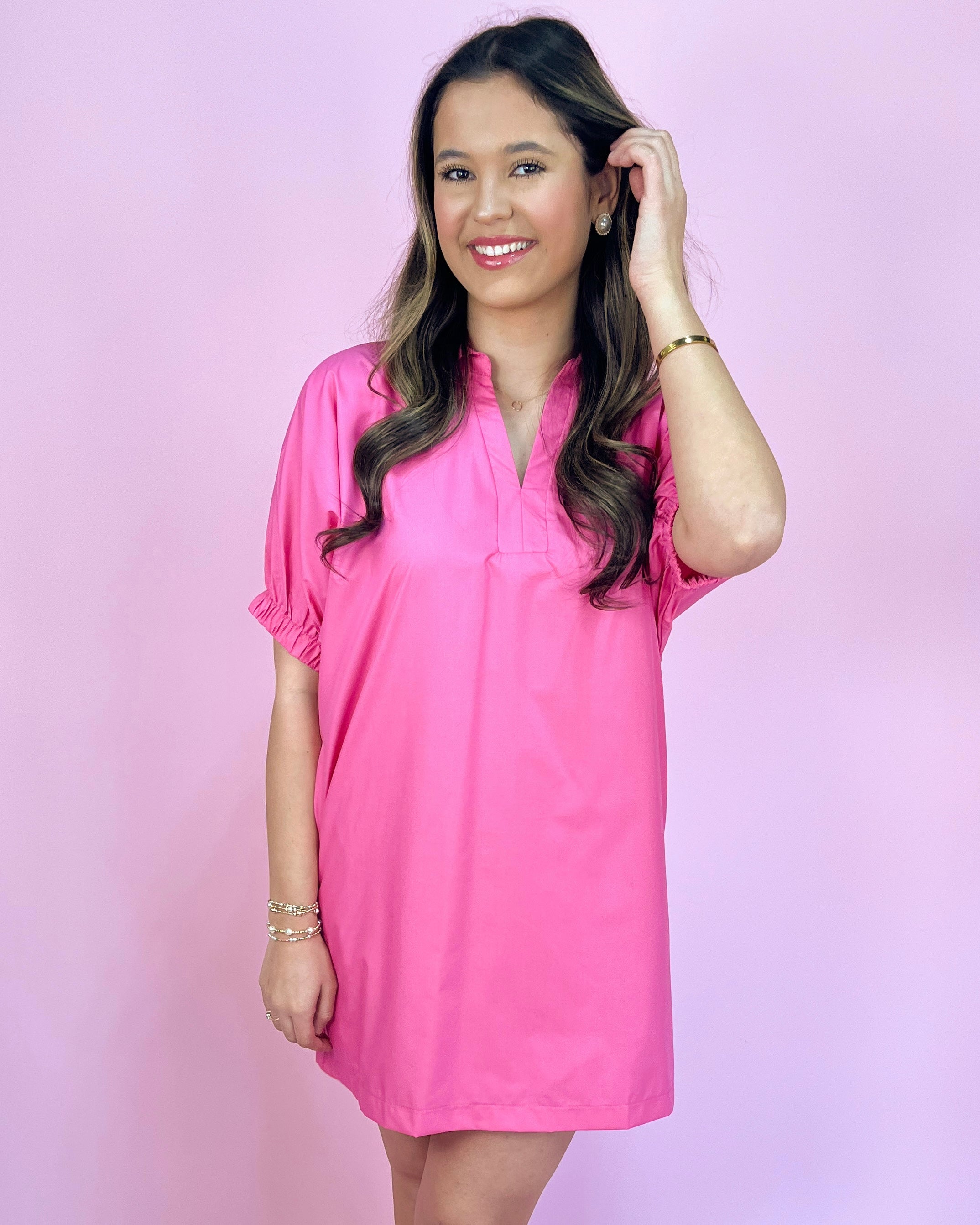 Bold, bright, and impossible to ignore — this magenta dress is your new confidence piece! With its crisp collared neckline and relaxed shift-style fit, it’s equal parts polished and playful. The vibrant pink hue brings instant energy, while the ruched sleeves add a touch of feminine detail ✨ Perfect for when you want to stand out in the sweetest way — from brunch to vacation nights 🌴🍹💖 Details We’re Loving 🌺✨