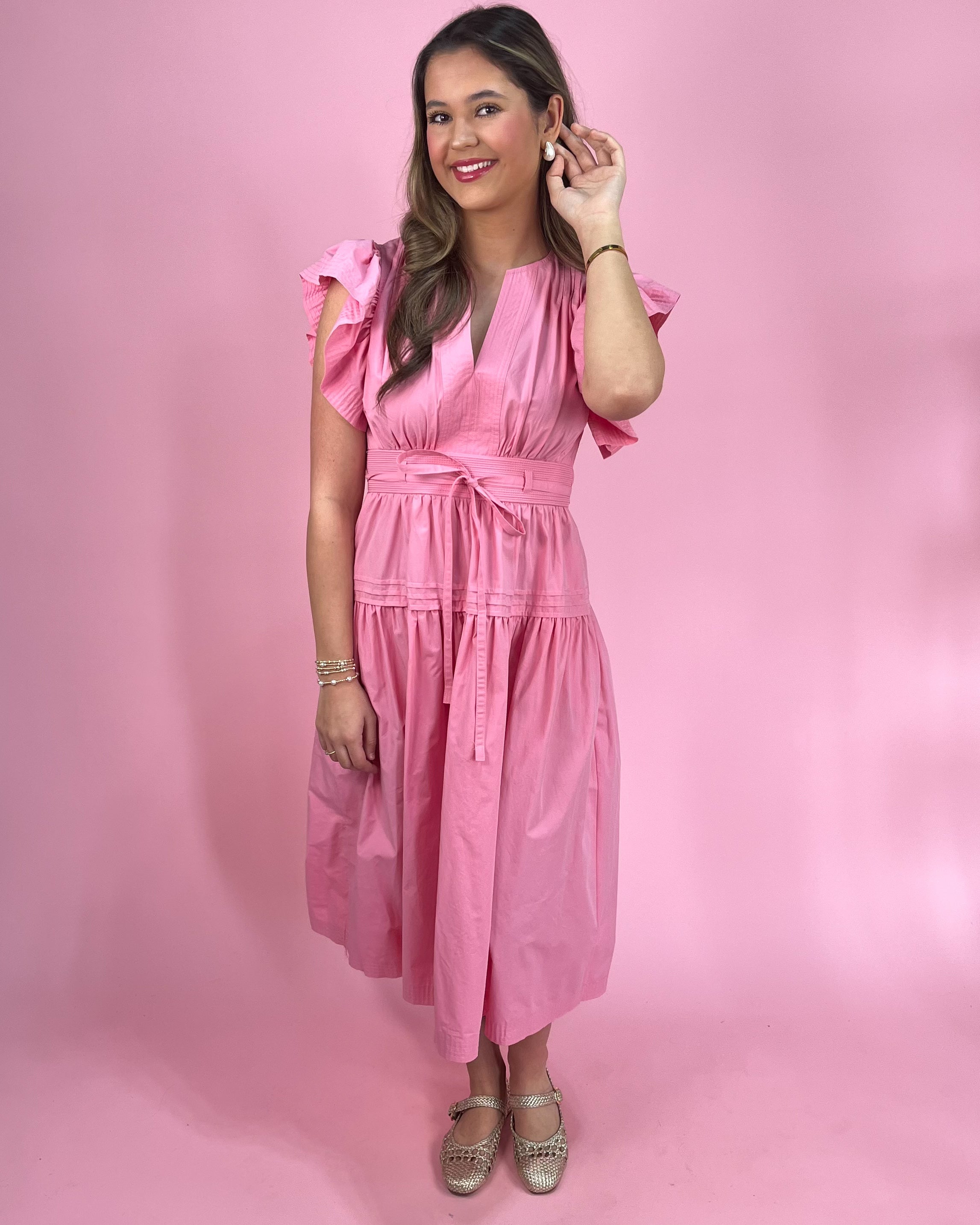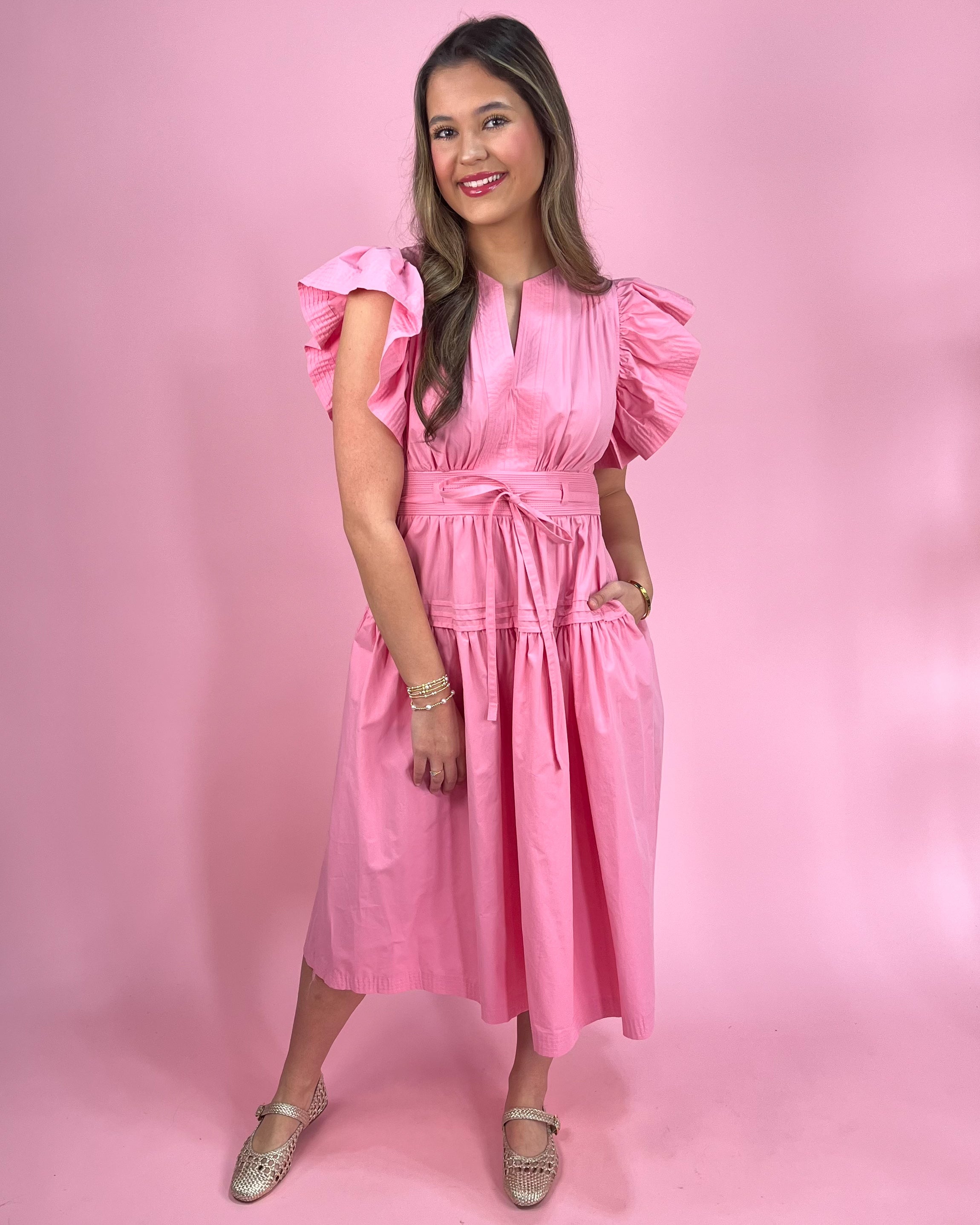 Sweet, feminine, and full of charm — this pink midi dress is made for sunny days and twirl-worthy moments! 💃🌸 Featuring flutter sleeves, a tiered skirt, and the best surprise of all… pockets! 🙌✨ This dress is equal parts pretty and practical, with soft cotton comfort you’ll love all day long. 💕 Whether it’s brunch, showers, or spring celebrations, this dress is pure boutique romance. 👑💗