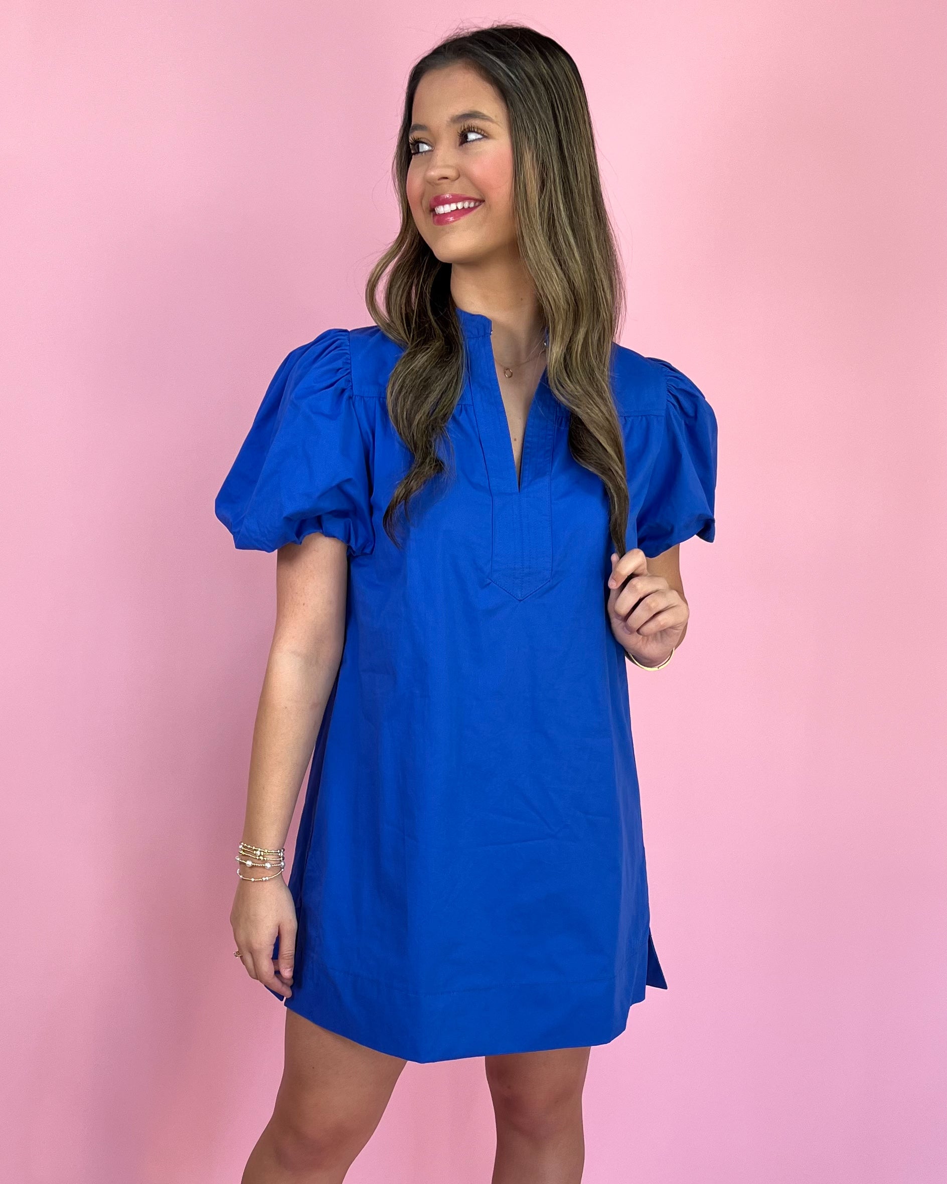 The rich sapphire hue makes a striking statement, the puff sleeves add just the right amount of drama, and the crisp cotton fabric keeps it comfortable and polished. It’s the kind of dress that feels special every time you slip it on.