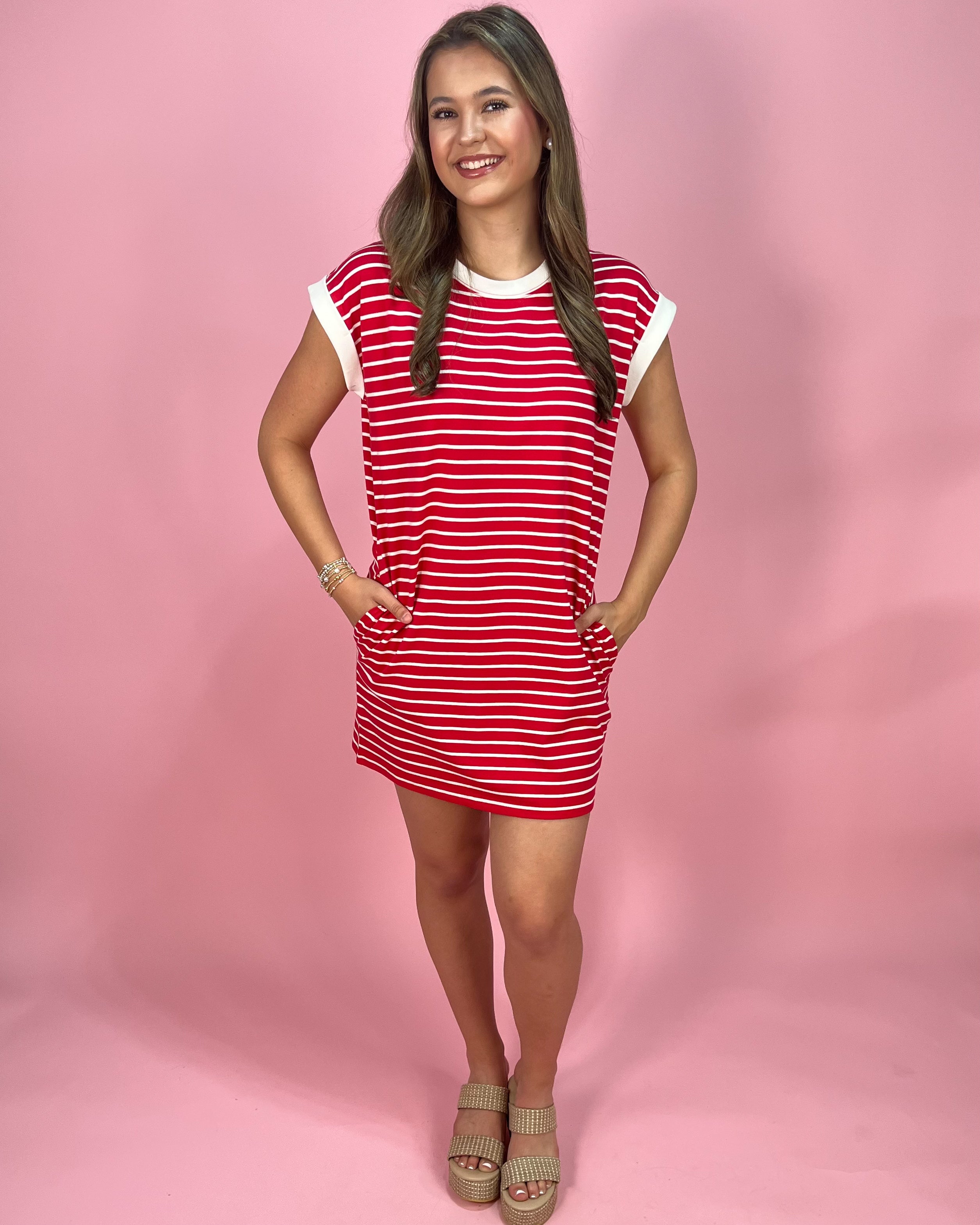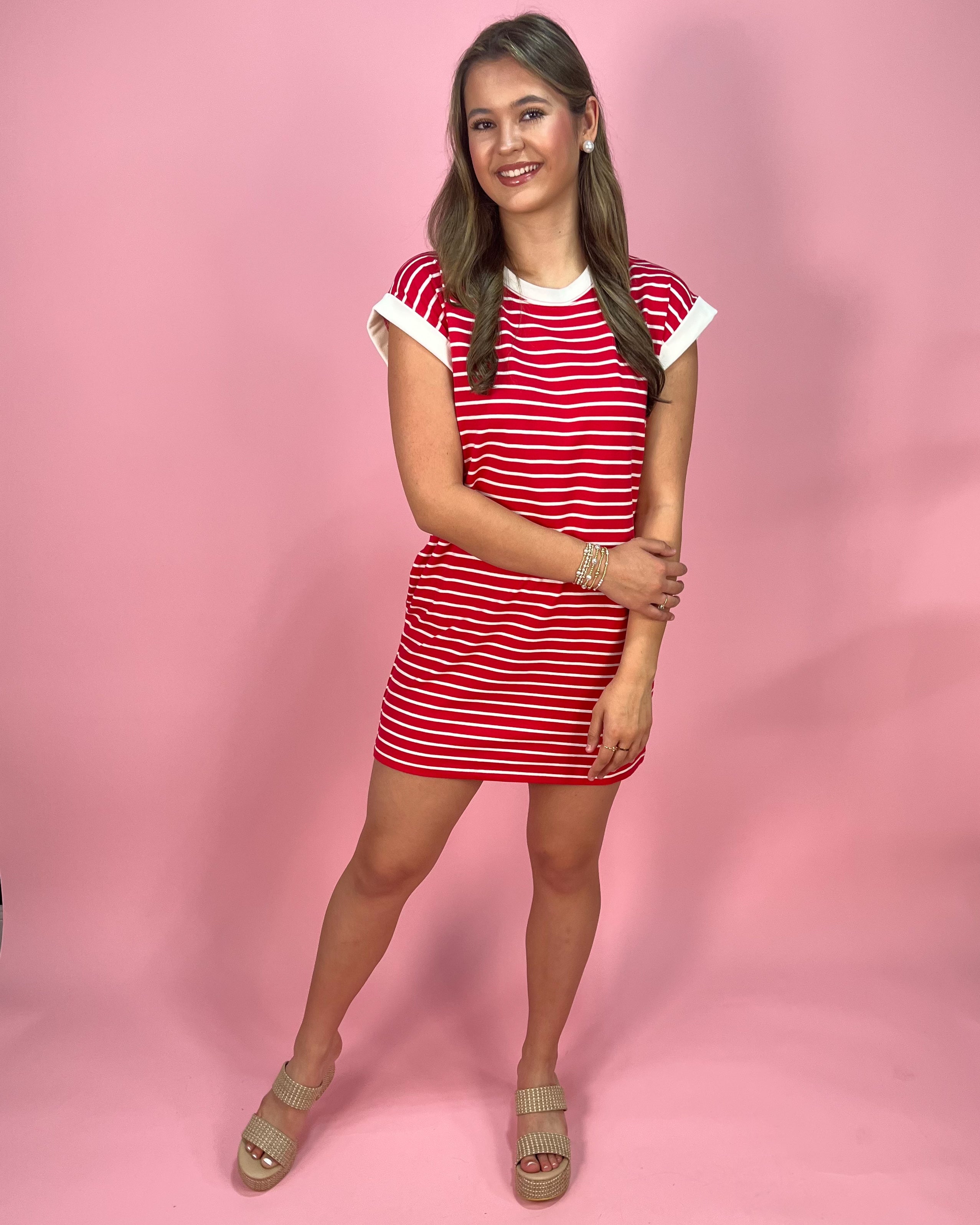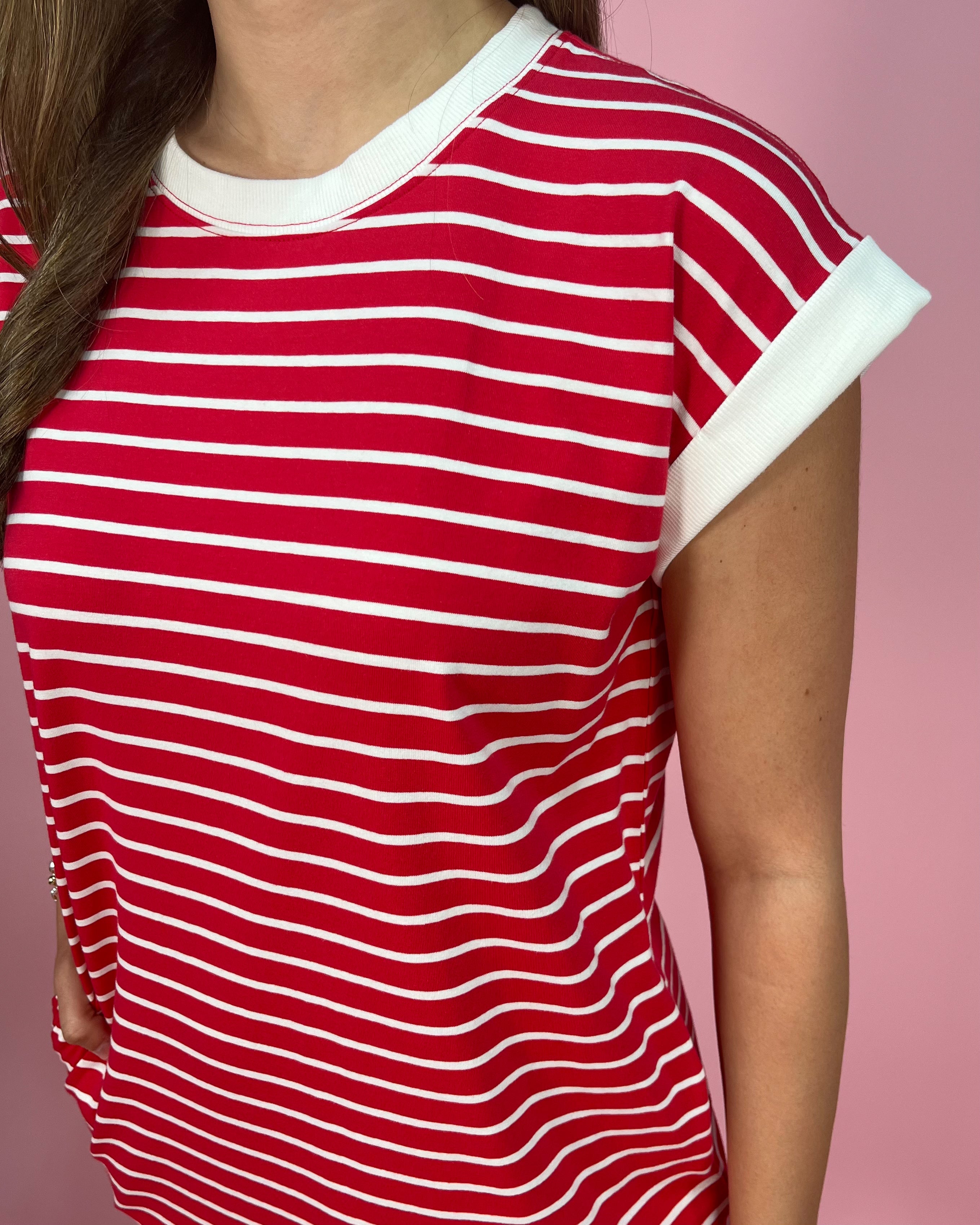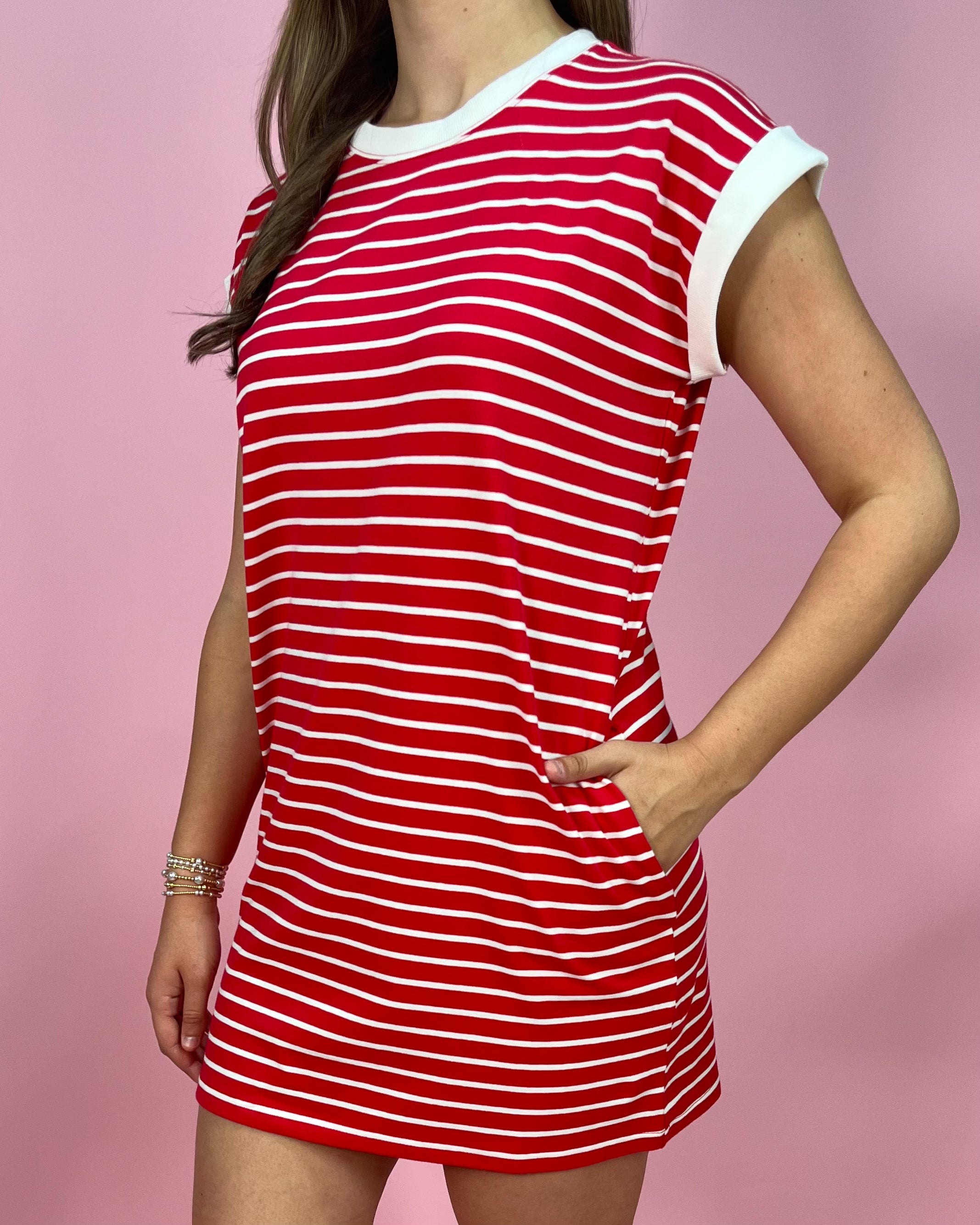 Sporty, bold, and made for easy days, the Sideline Stripe Contrast Trim T-Shirt Dress is the perfect throw-on-and-go piece with standout style. The vibrant red base with crisp white stripes gives it that classic, all-American feel, while the contrast trim at the neckline and sleeves adds a clean, elevated finish.