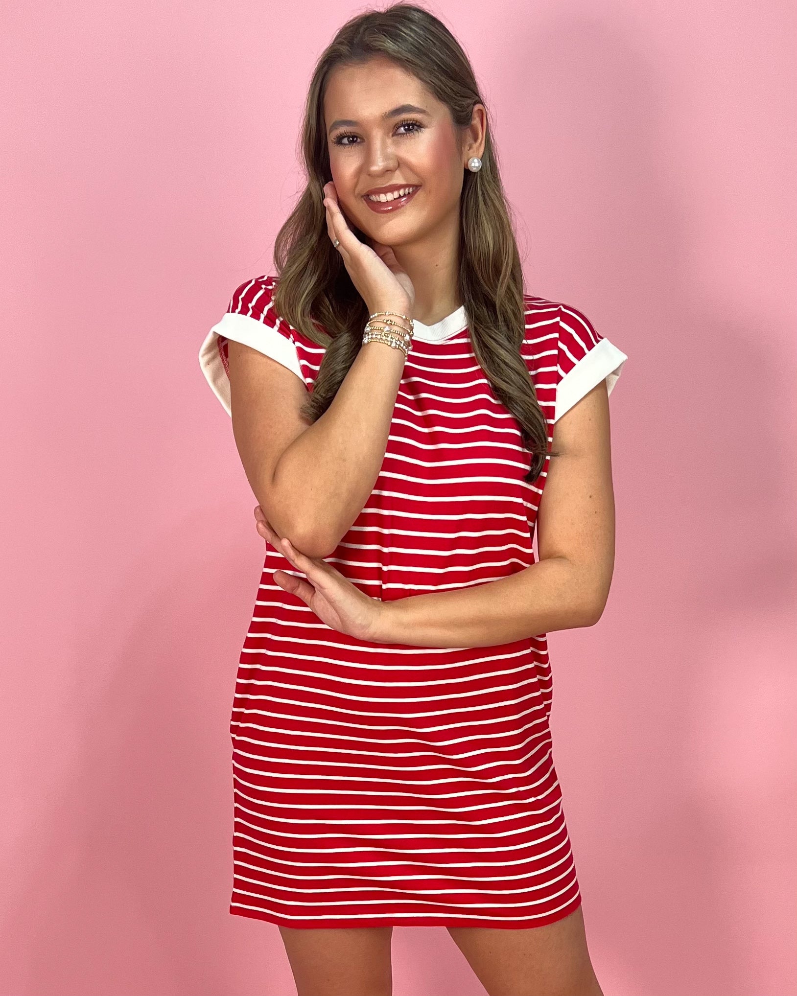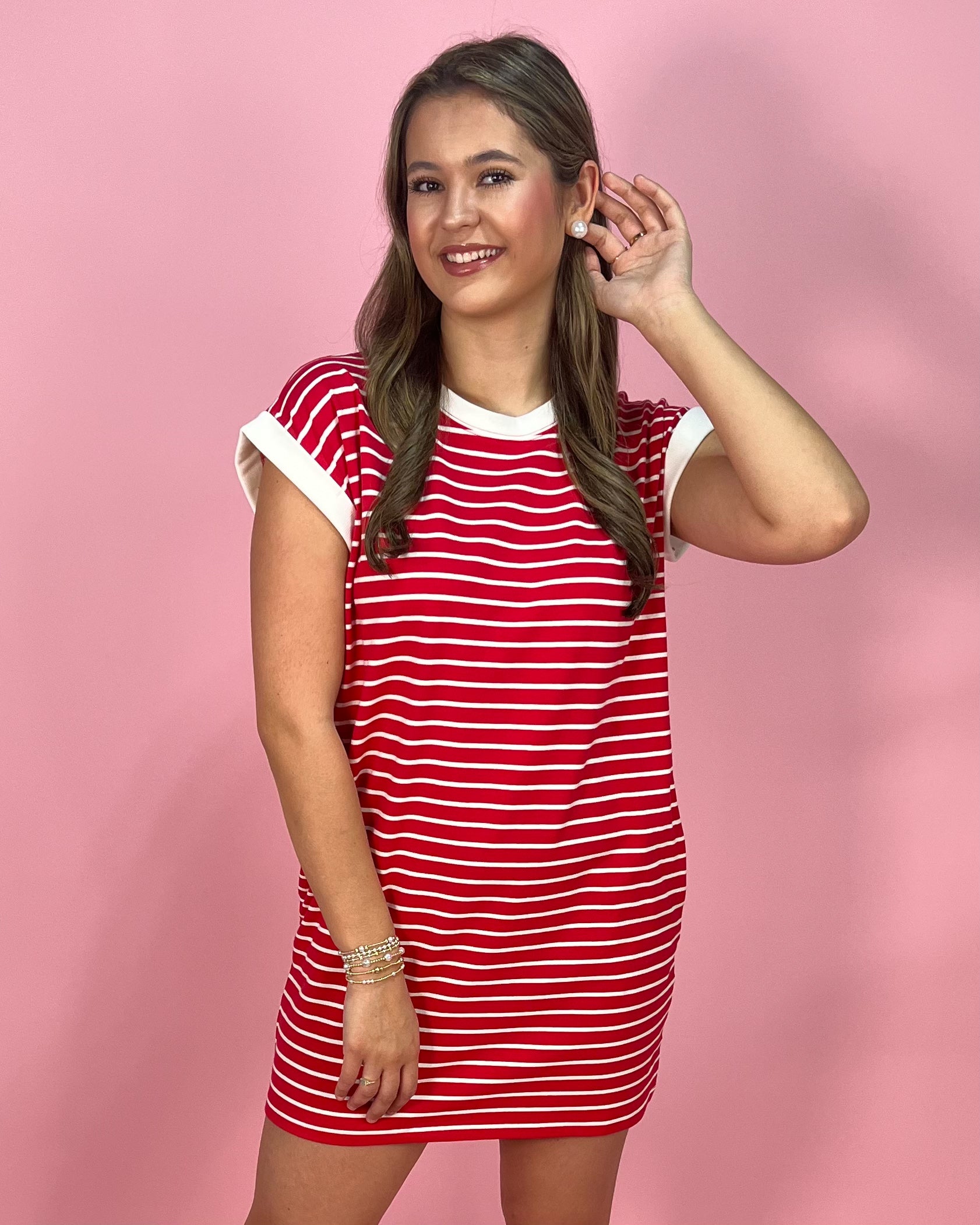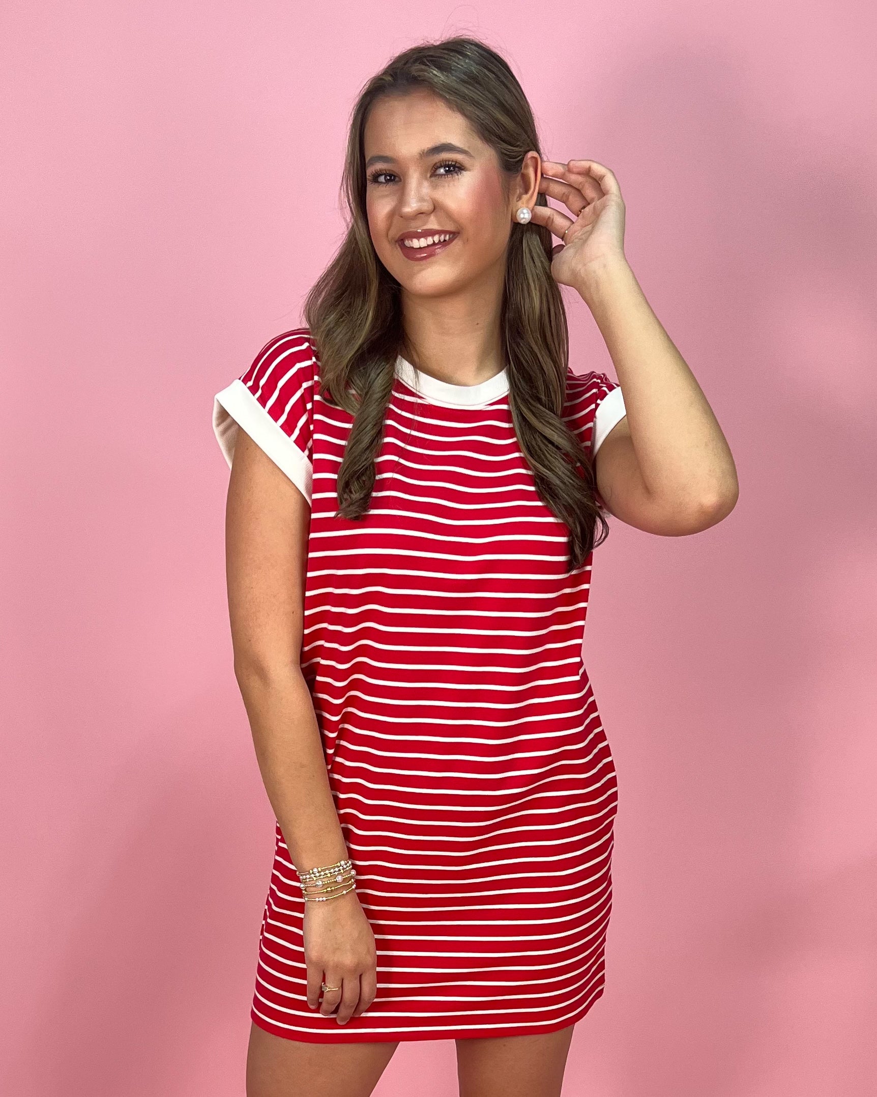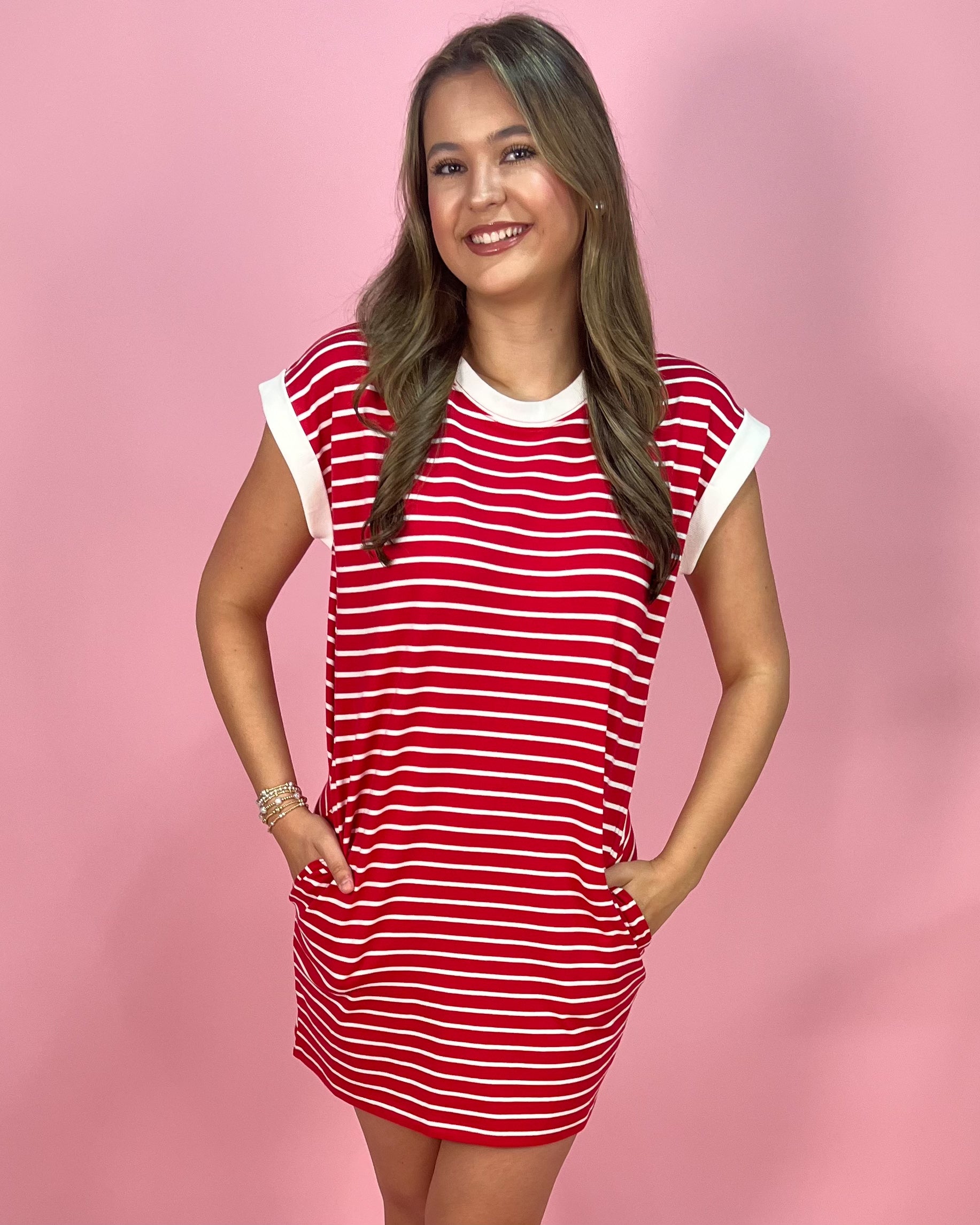 Sporty, bold, and made for easy days, the Sideline Stripe Contrast Trim T-Shirt Dress is the perfect throw-on-and-go piece with standout style. The vibrant red base with crisp white stripes gives it that classic, all-American feel, while the contrast trim at the neckline and sleeves adds a clean, elevated finish.