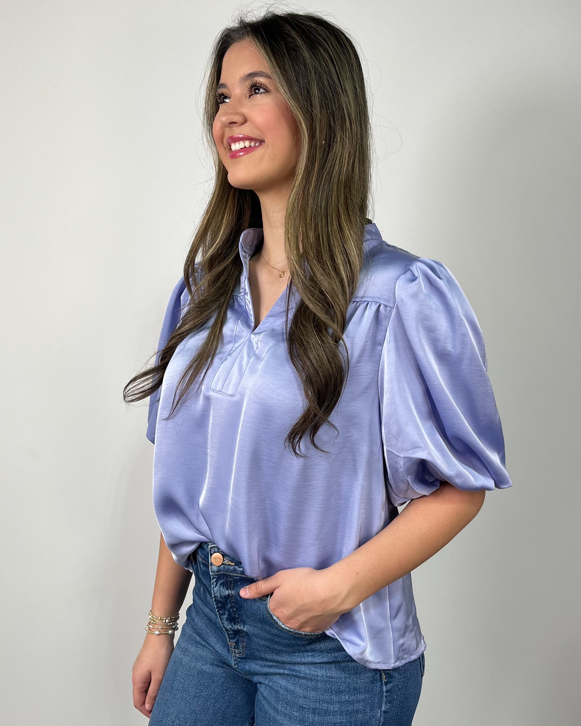 Meet the Something Blue Bubble Sleeve Top — a dreamy, elevated essential that brings soft elegance to your everyday wardrobe. This silky blue blouse features a subtle sheen that instantly elevates your look, giving it that polished, boutique feel while still being effortless enough for day-to-day wear. The calming blue hue is timeless and flattering, making it an easy piece to reach for season after season.