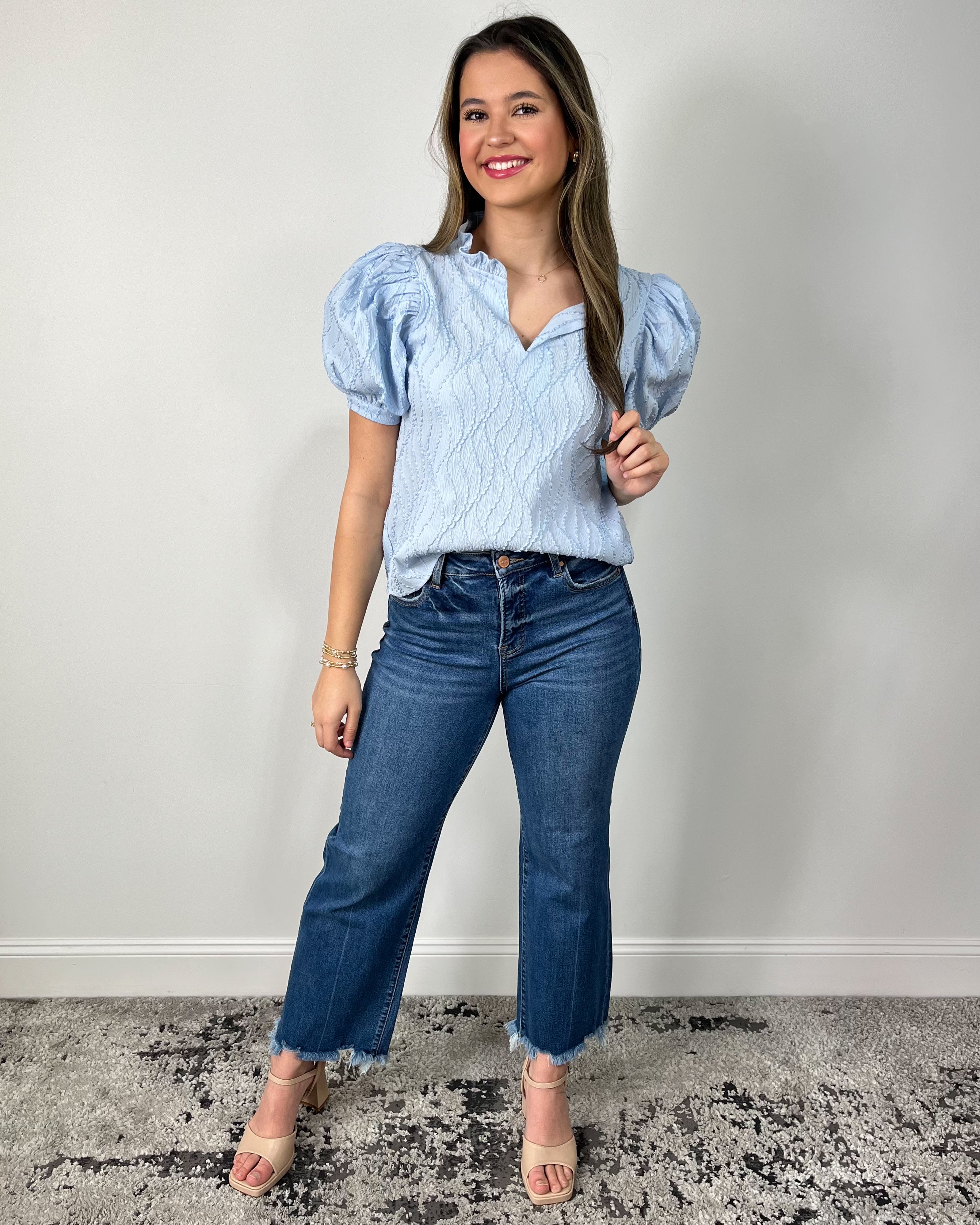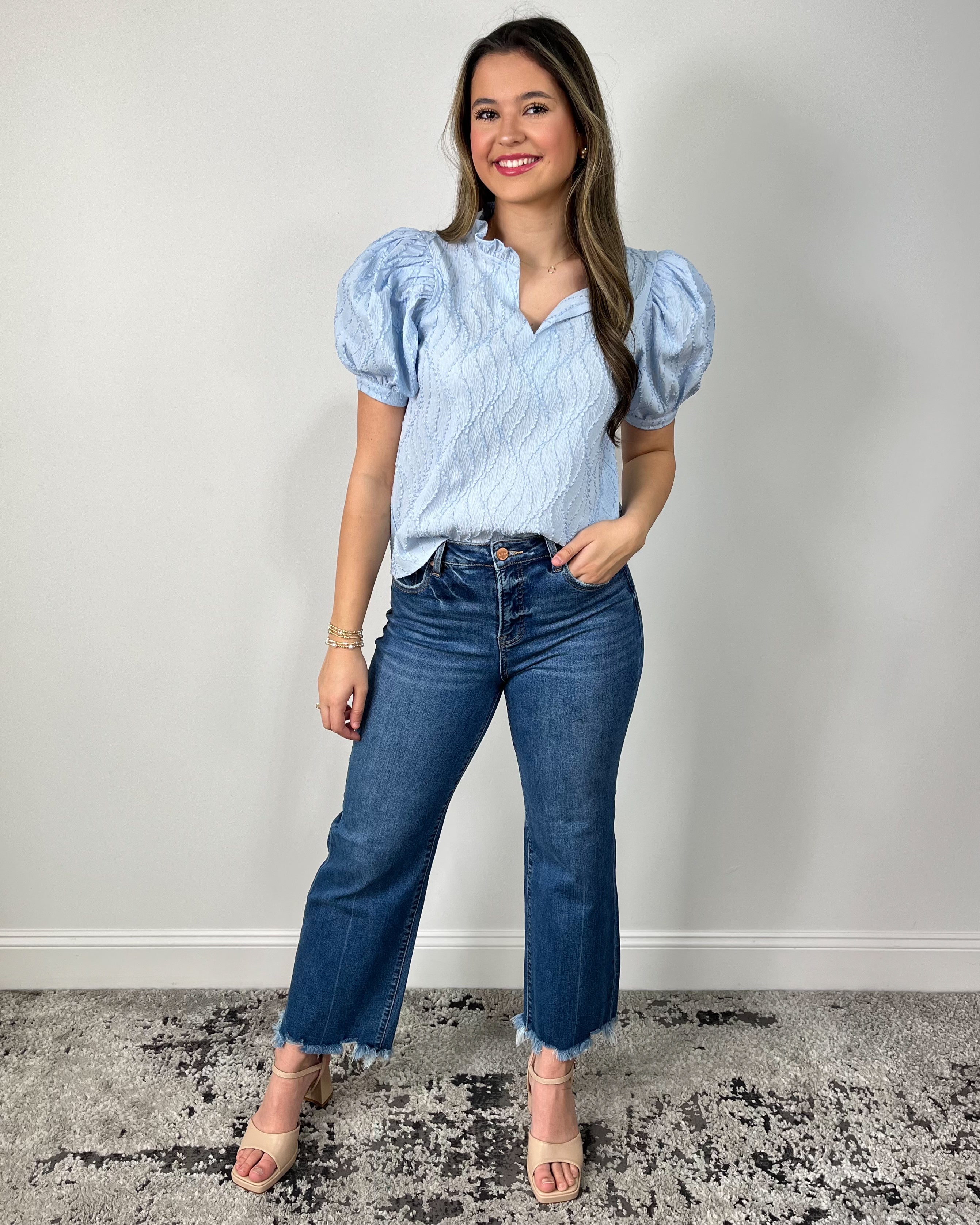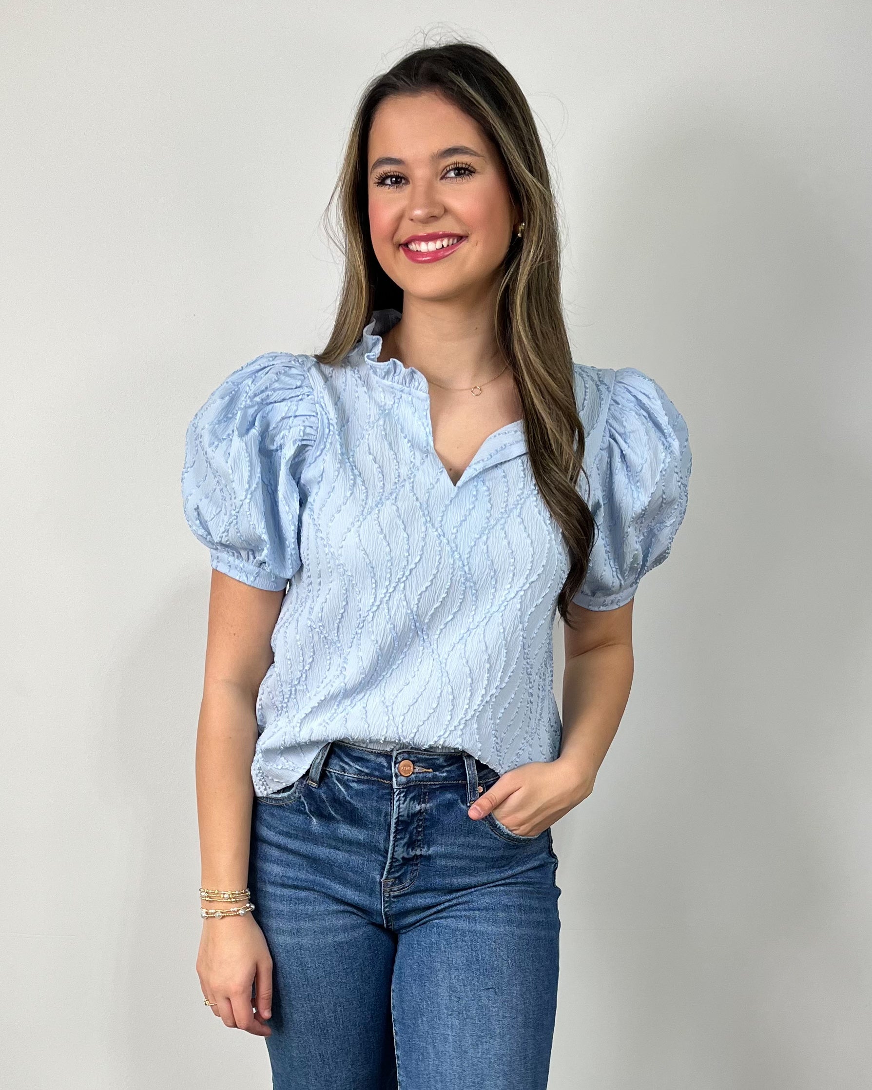 Meet the Sweet Serene Puff Sleeve Top — a dreamy, elevated staple designed to make every day outfits feel extra special 🤍✨ This soft blue beauty features an allover textured wave pattern that adds subtle dimension and boutique charm, giving it that polished yet effortless look you love. The lightweight fabric catches the light just right, creating a soft, serene glow that feels fresh and feminine.