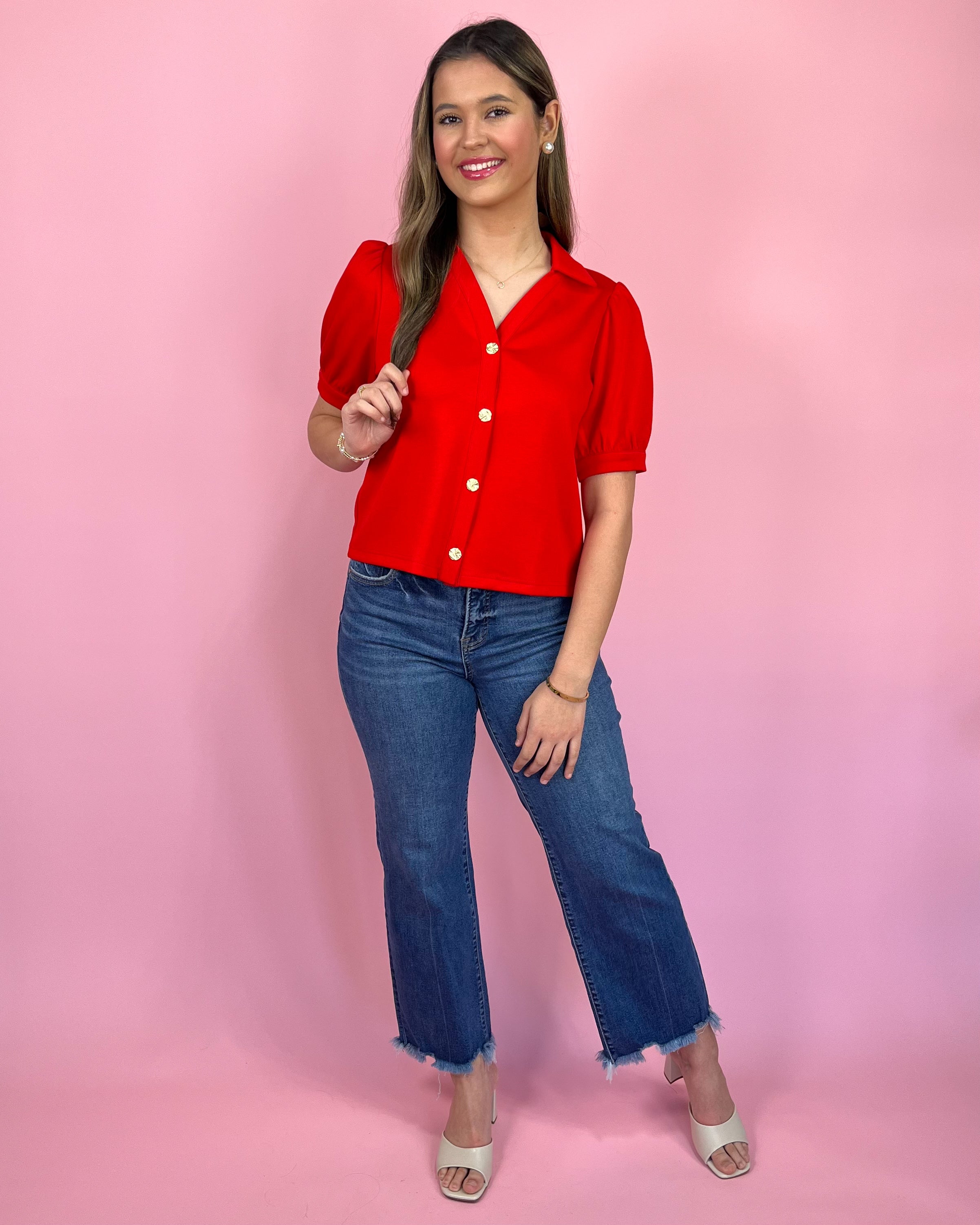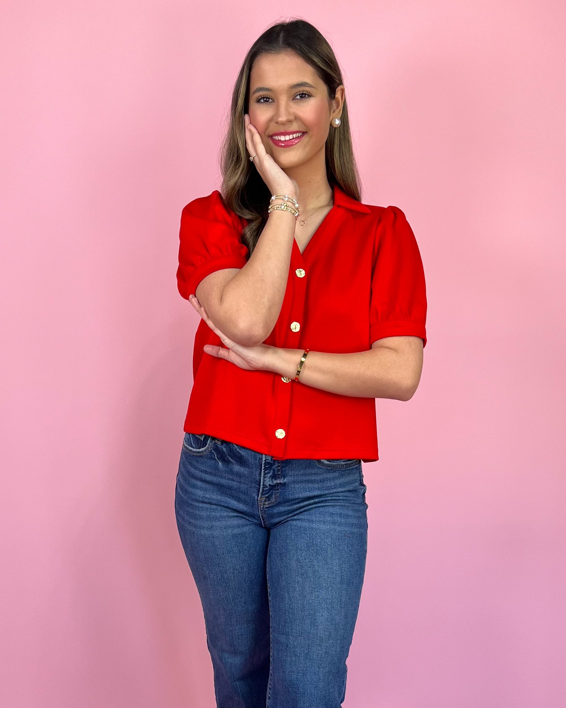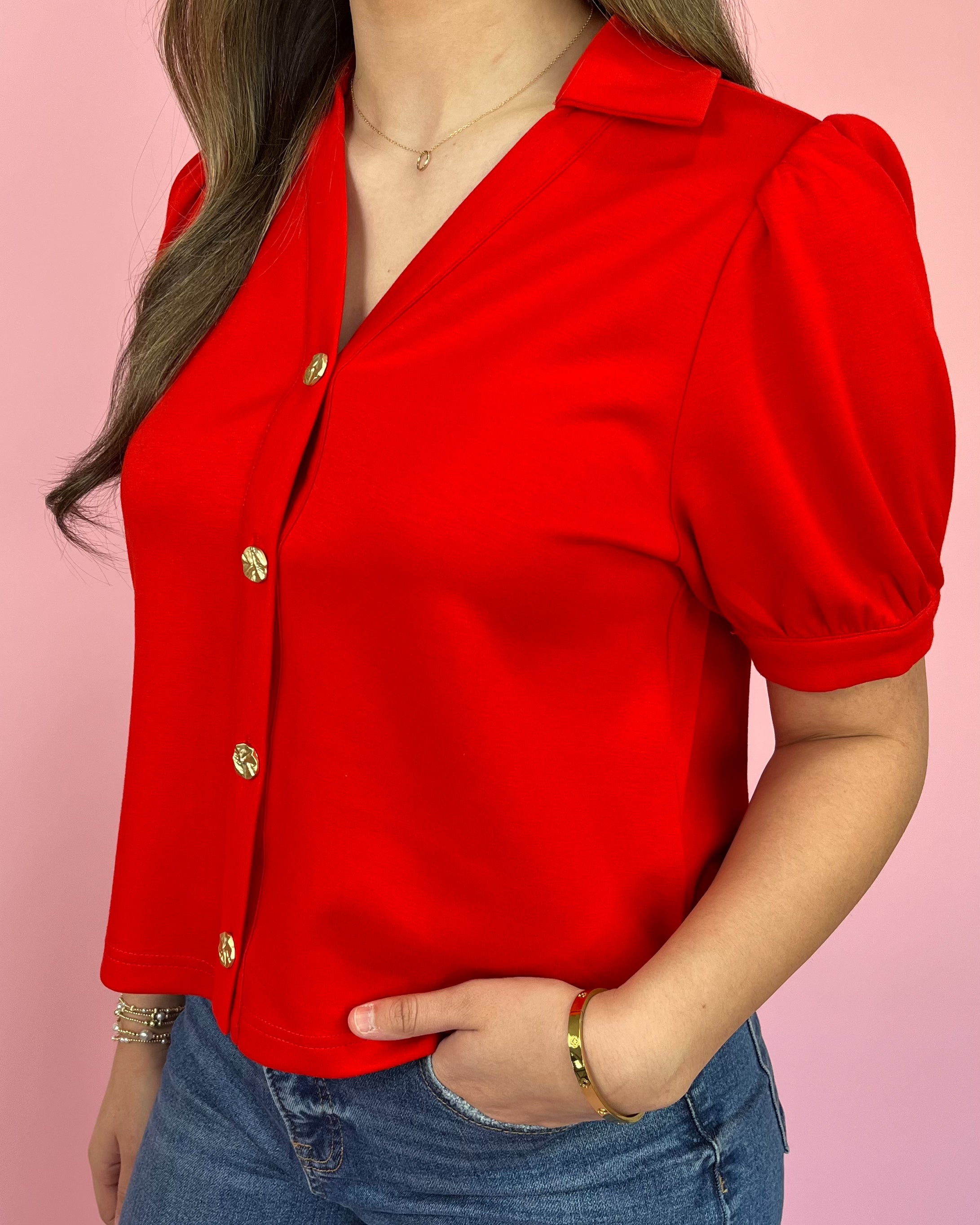 ❤️ With its vibrant red color, luxe gold statement buttons, and chic collared neckline, this top brings major designer-inspired energy without the designer price tag. The puff sleeves add the prettiest touch of drama, making it feel feminine, fun, and just the right amount of extra.