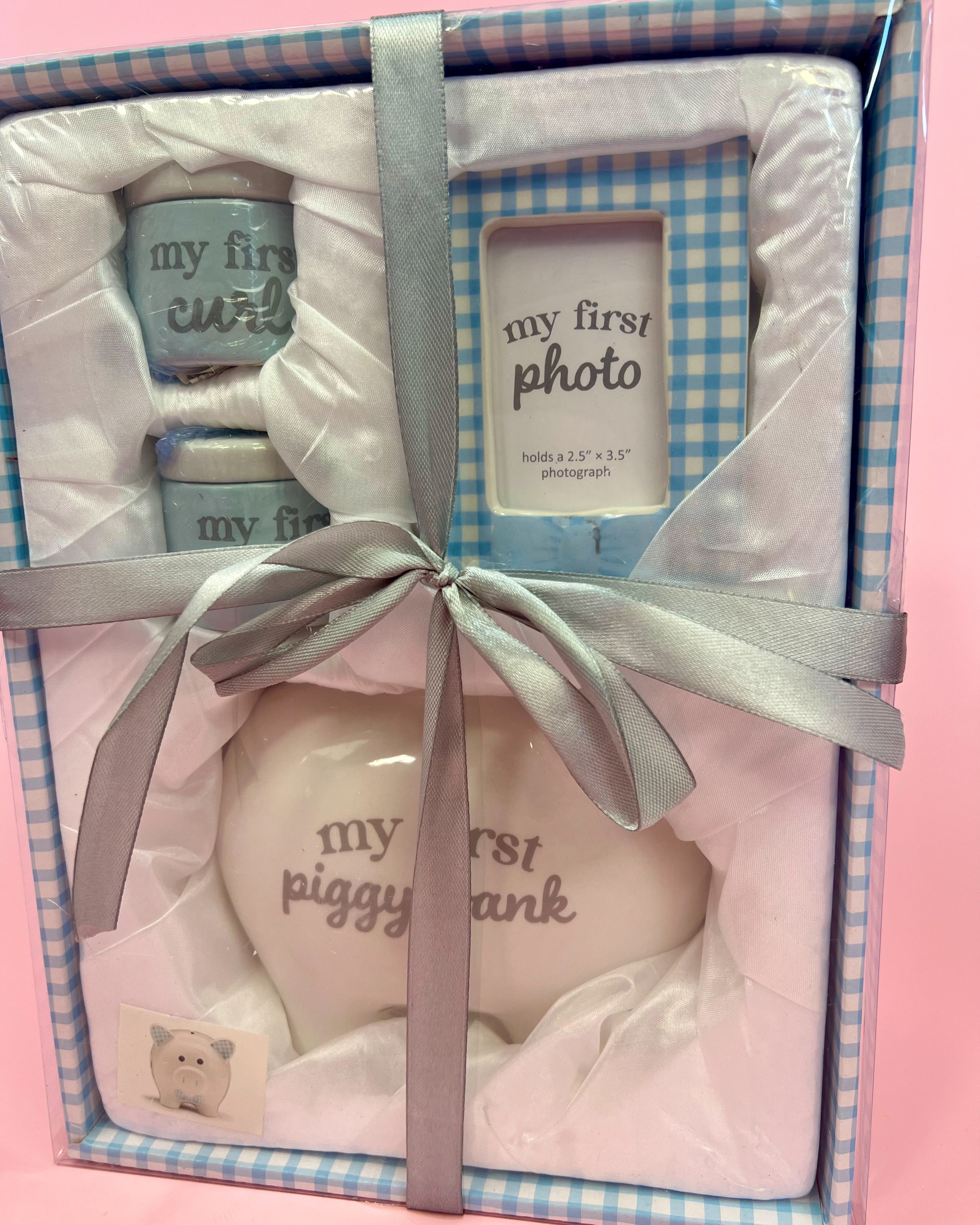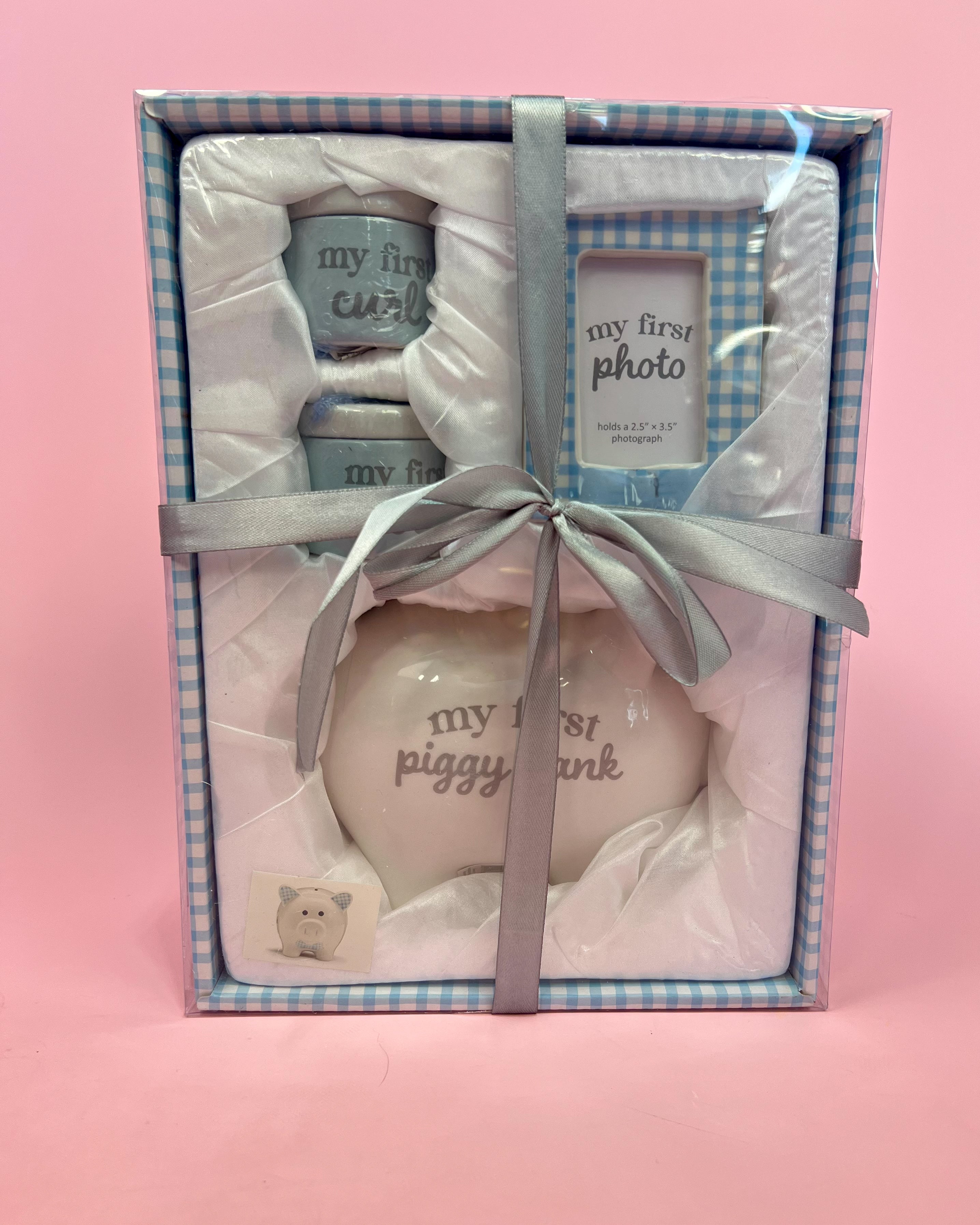Sweet, sentimental, and perfectly gift-ready, the Baby Boy Bank Gift Set is a keepsake collection made to celebrate all of baby’s precious firsts. Beautifully packaged in a pink or blue gingham keepsake box and tied with a soft satin ribbon, this charming set makes the perfect baby shower or newborn gift.