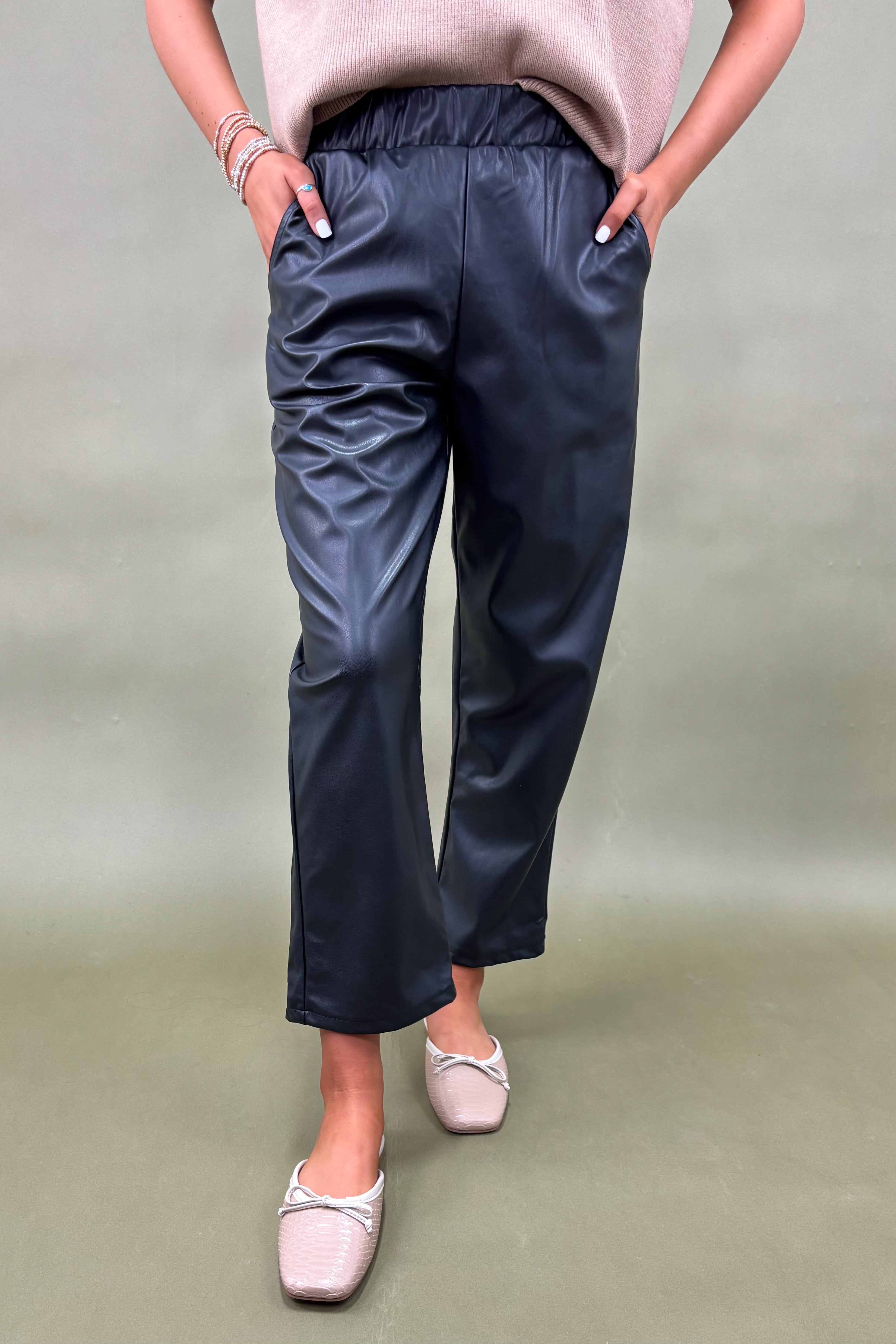 Bring serious attitude to your everyday style with our new black faux leather straight leg pants. These sleek pants combine comfort and cool with a soft faux leather finish, high-stretch waistband, and relaxed jogger silhouette. Dress them up with heels or keep it casual with sneakers—wither way, you're serving looks. From cozy coffee runs to cocktails with the girls, these joggers are your new go-to for bold and versatile fashion.