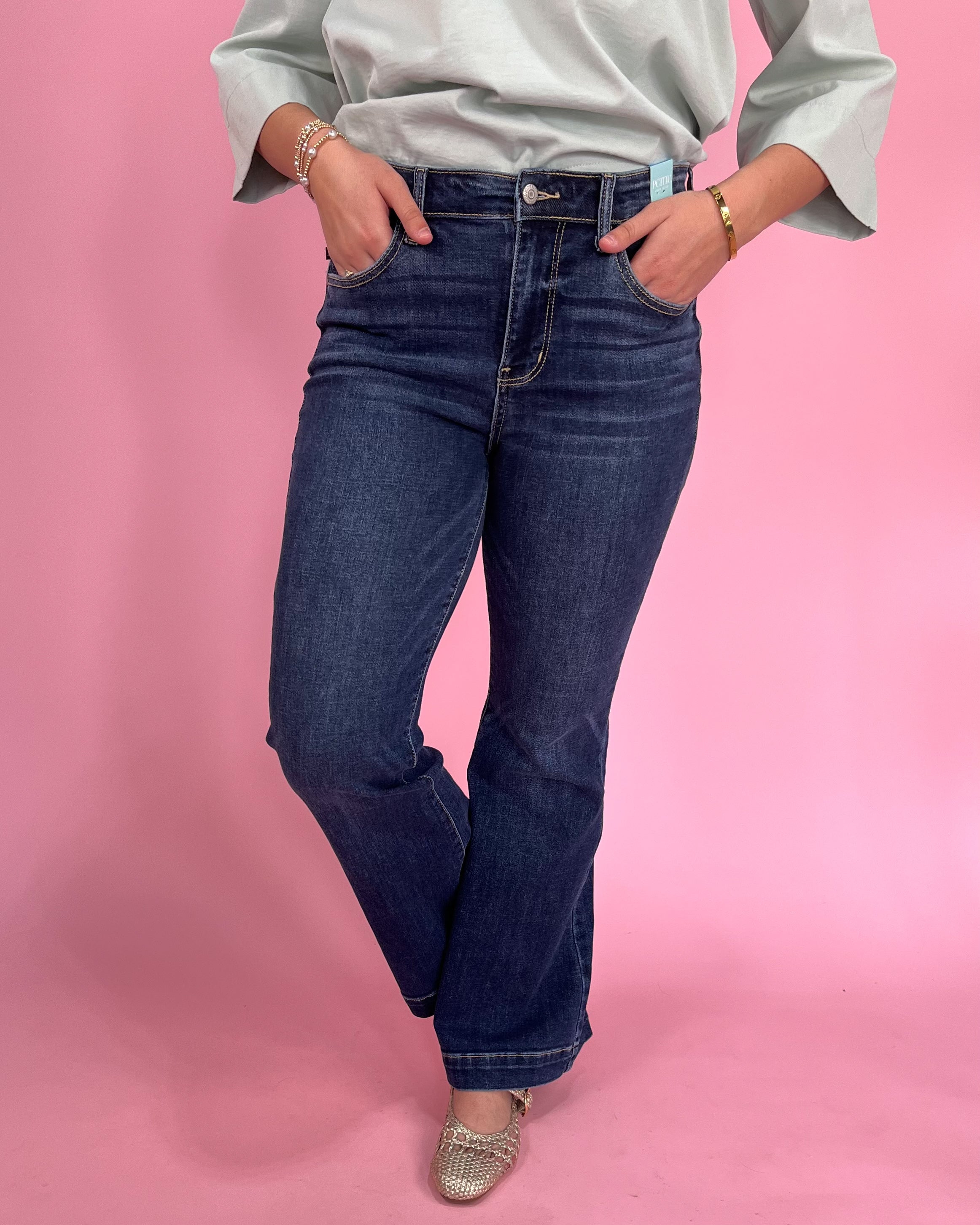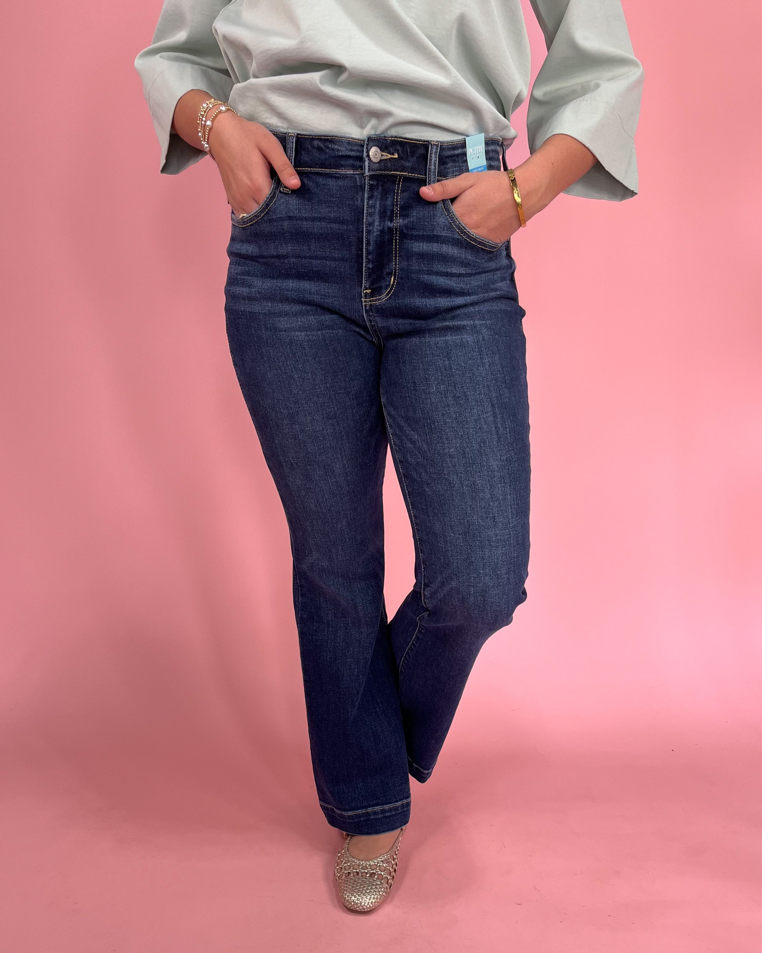 Style: Petite High Waist • Trouser Flare • Dark Wash Denim Jeans 💙✨Model Stats: Grace is wearing a size 5/27. See size chart for more info.