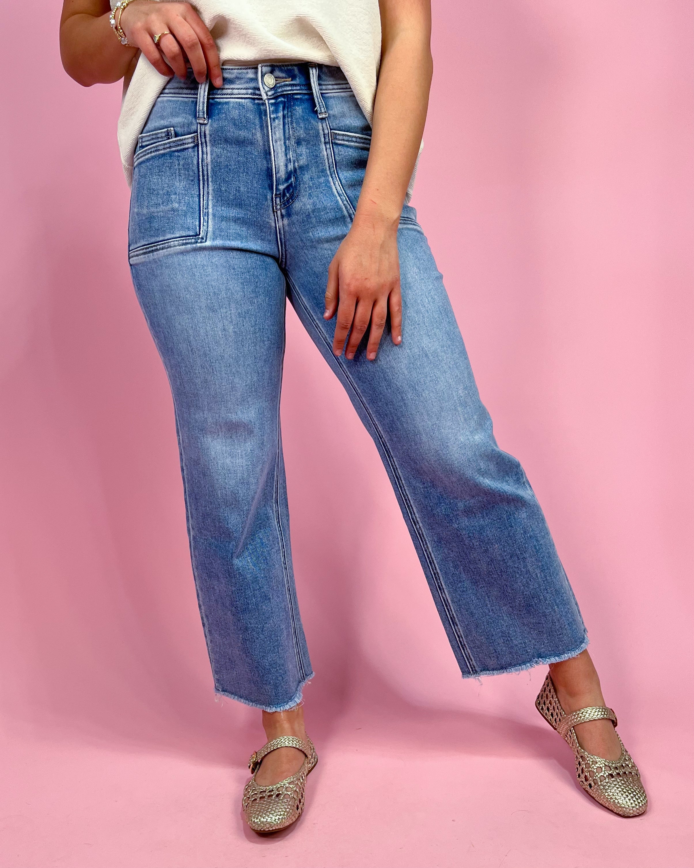 A fresh take on the classic wide leg — these feature a flattering high rise with a slim wide silhouette that gives you shape through the hips and thigh before opening up at the leg. The light wash keeps them casual and easy for everyday wear, while the subtle front seam detail elongates the leg beautifully. The raw hem adds just the right amount of edge without feeling overdone.
