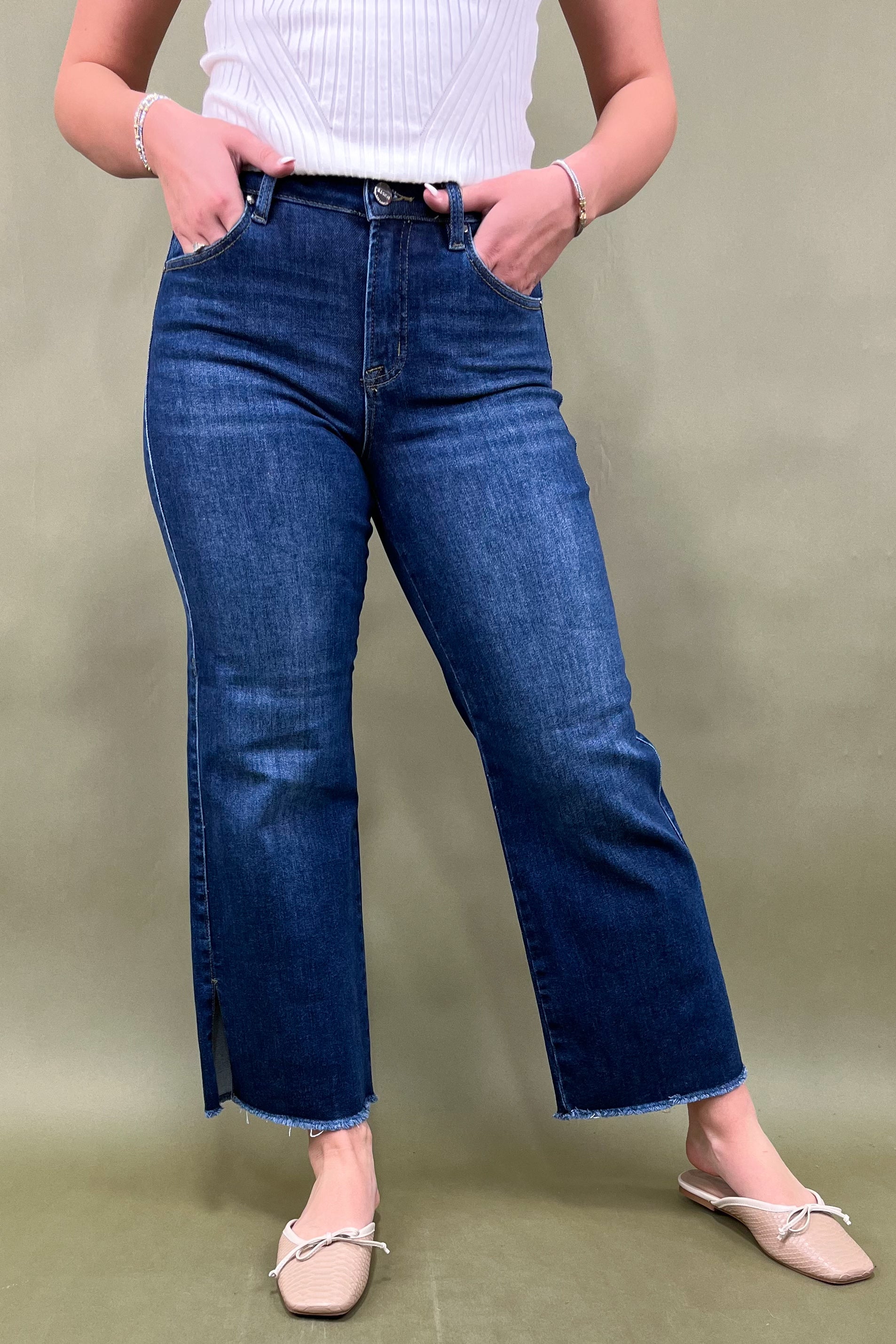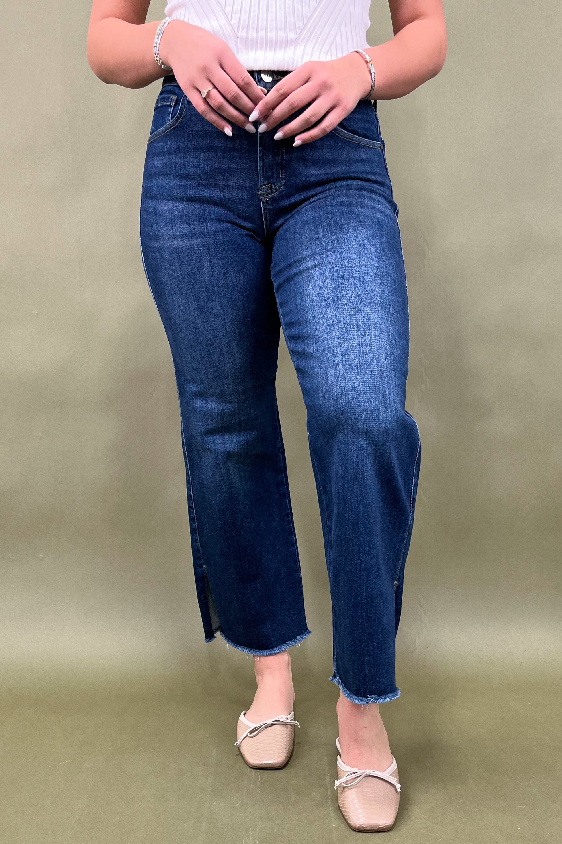 💙 Style: Dark Wash Mid-Rise Crop Wide Leg Jean with Side Slit Detail