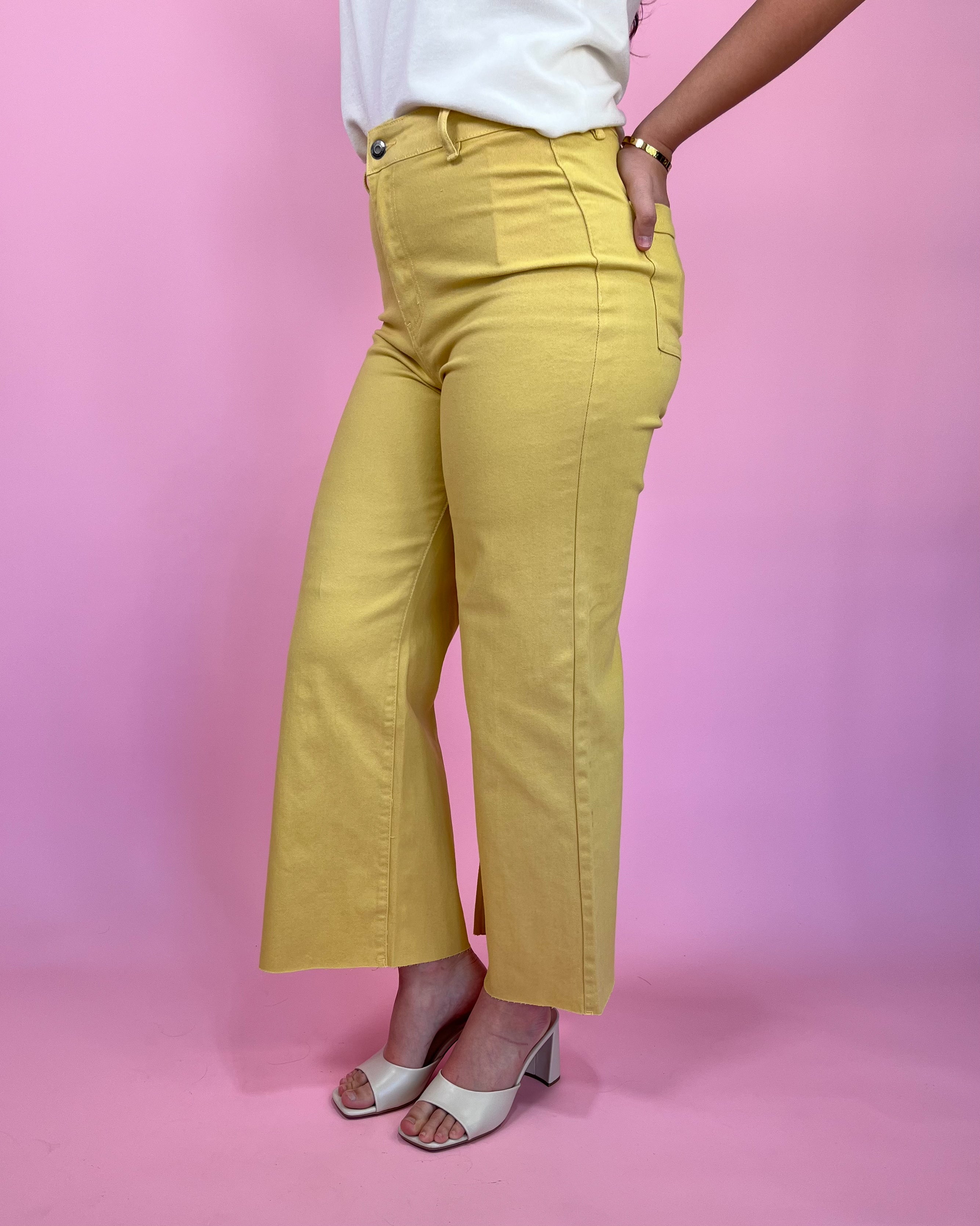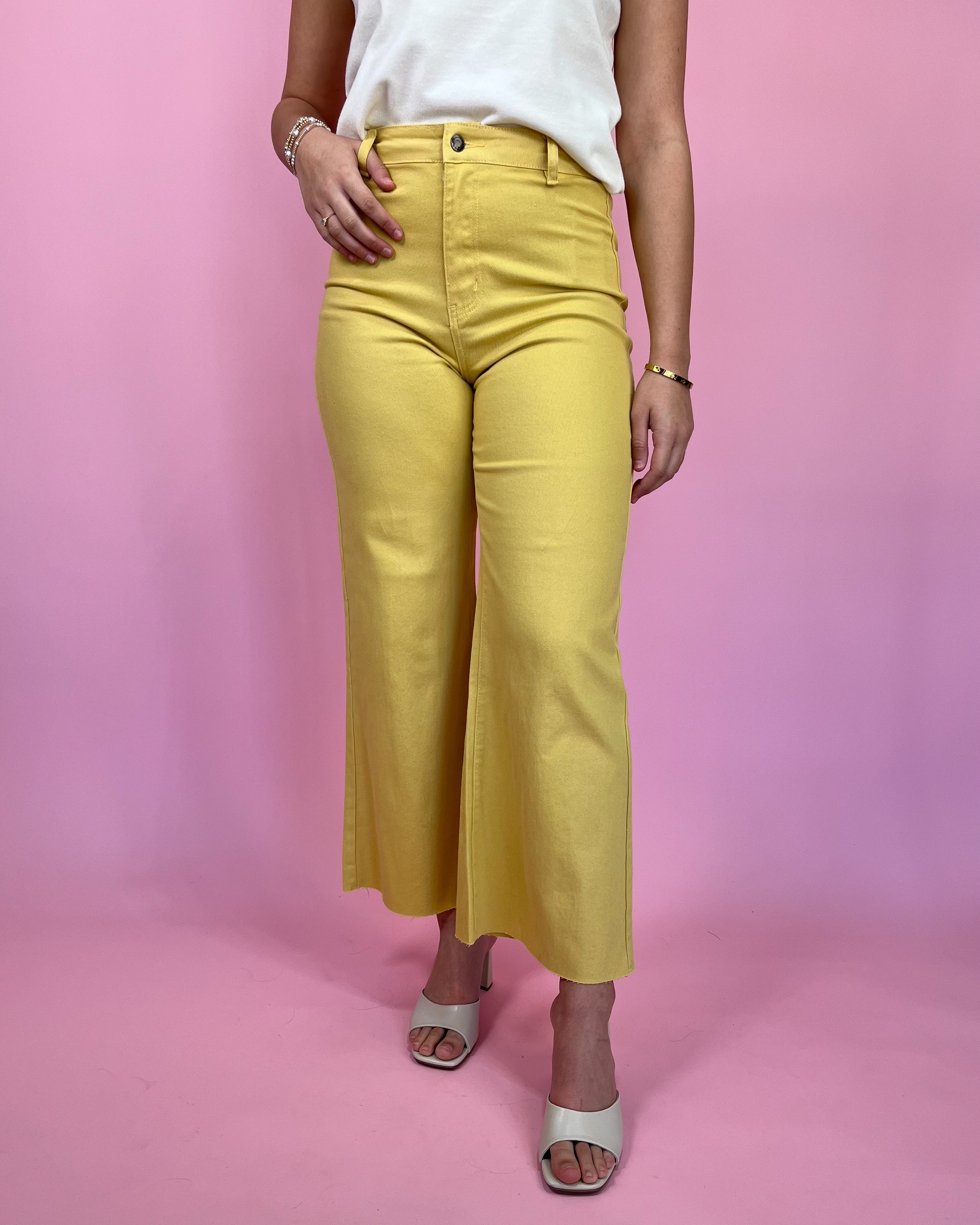 Model Stats: Grace is wearing a size Medium. See size chart for more info.Meet The Maisie HR Wide Leg Jeans — your sunshine-ready statement denim that instantly makes every outfit feel happier 💛✨. This bold mustard-yellow hue is the kind of fun pop your closet has been begging for, and it’s surprisingly easy to style with basics you already own.