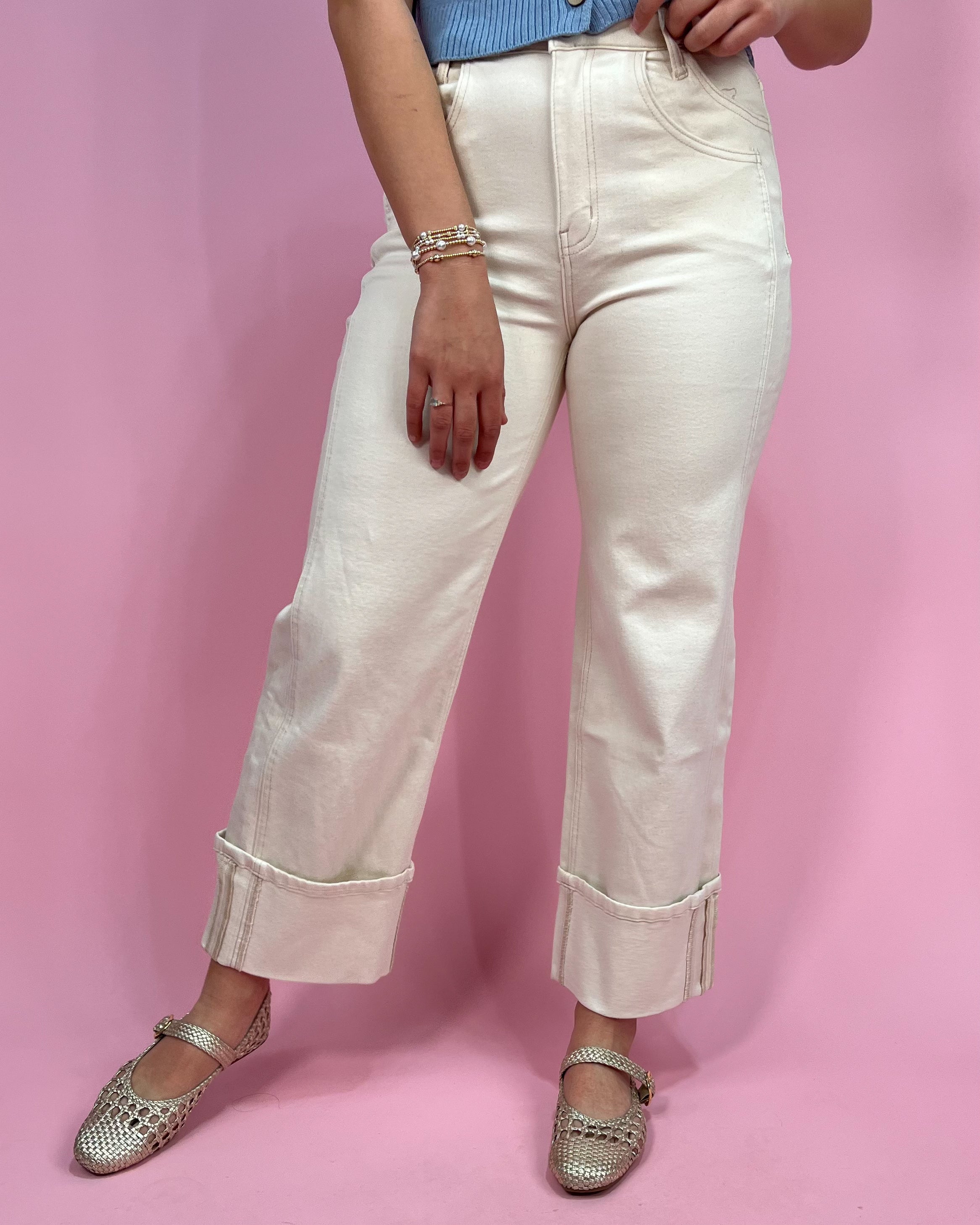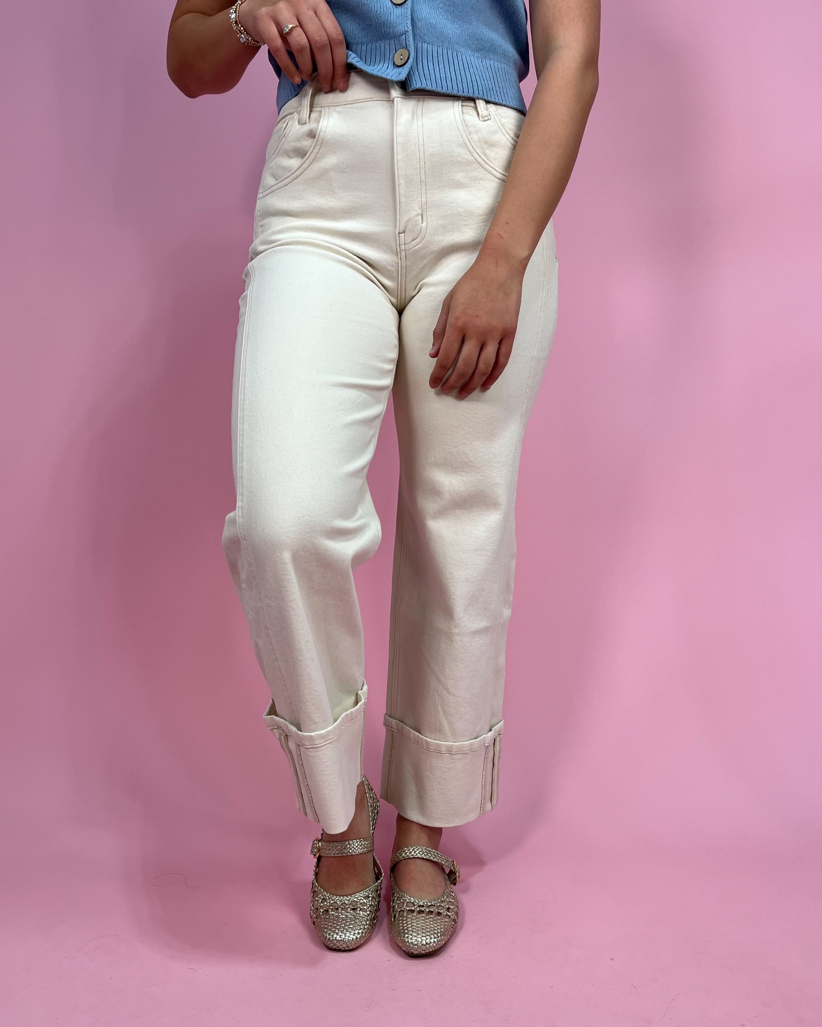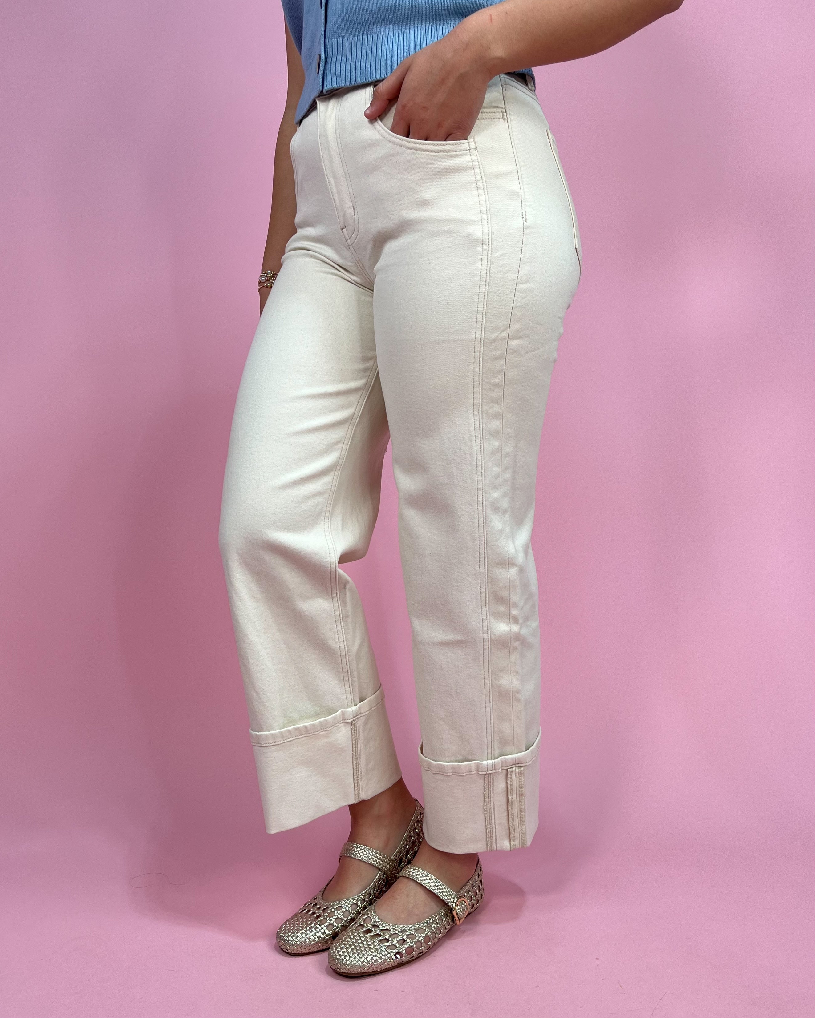 Style: High Rise • Off White • Cuffed Wide Leg Jeans