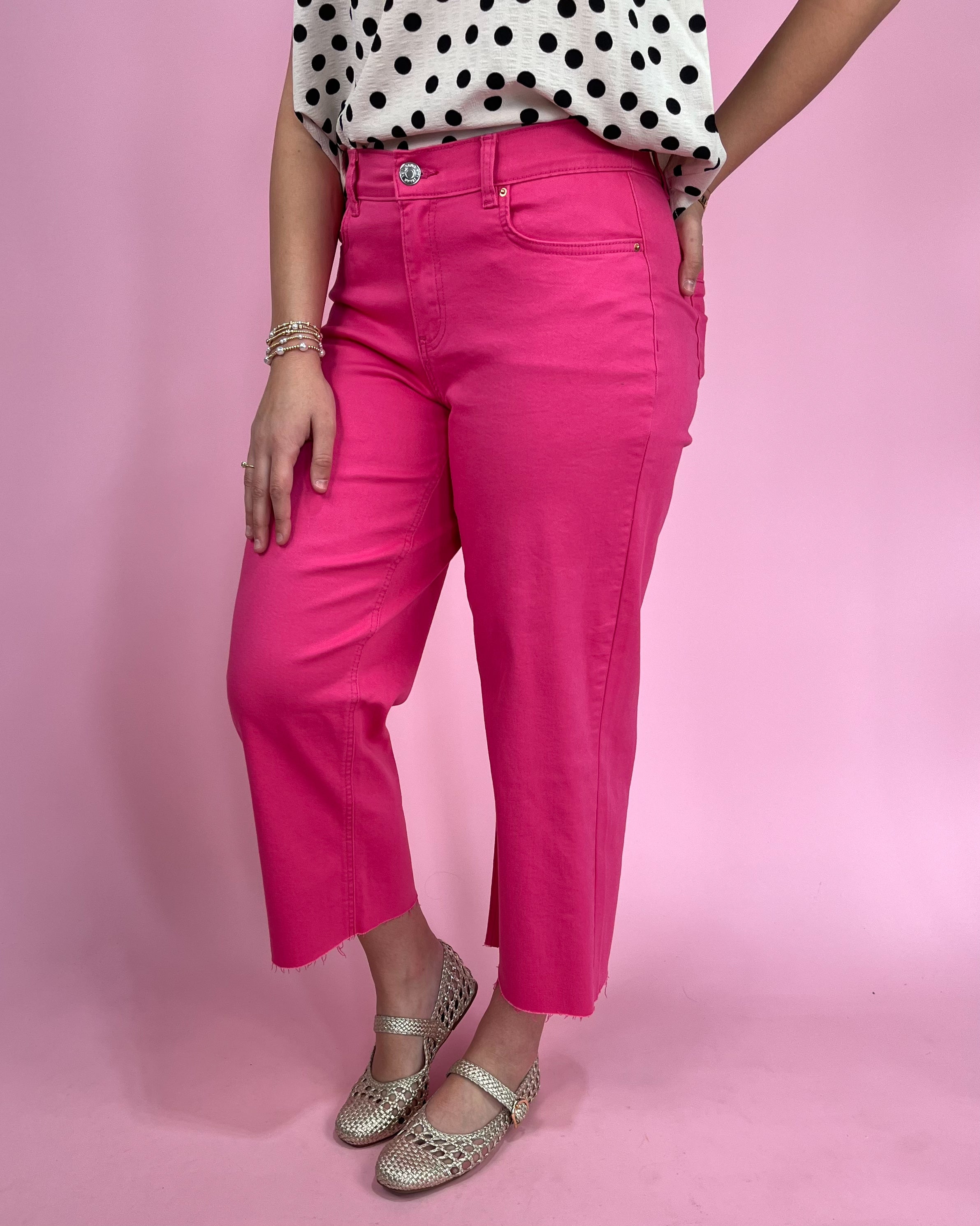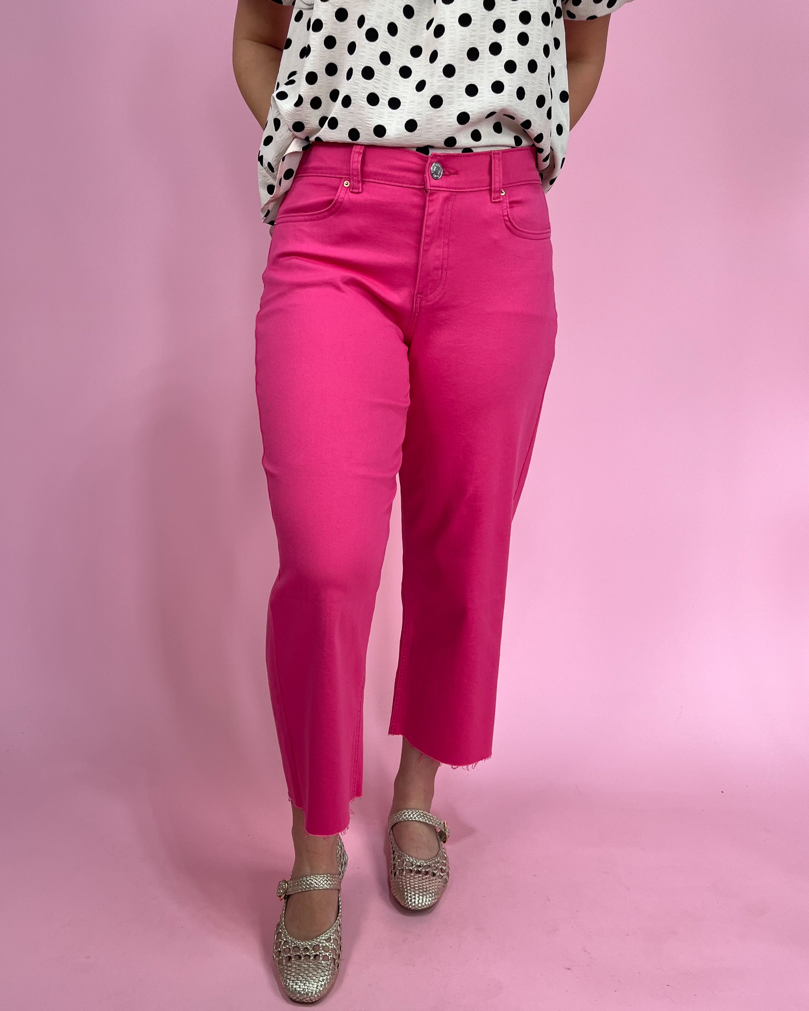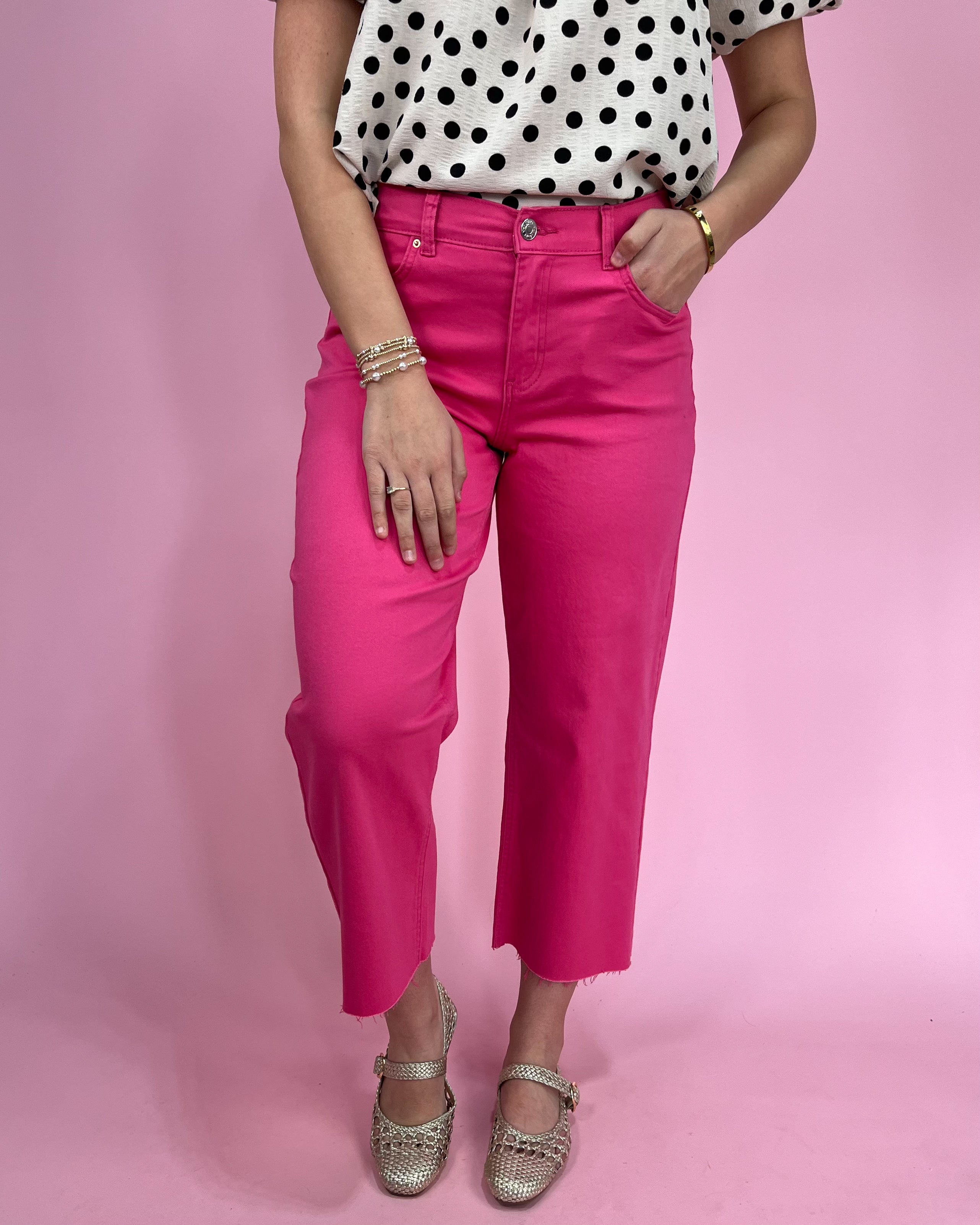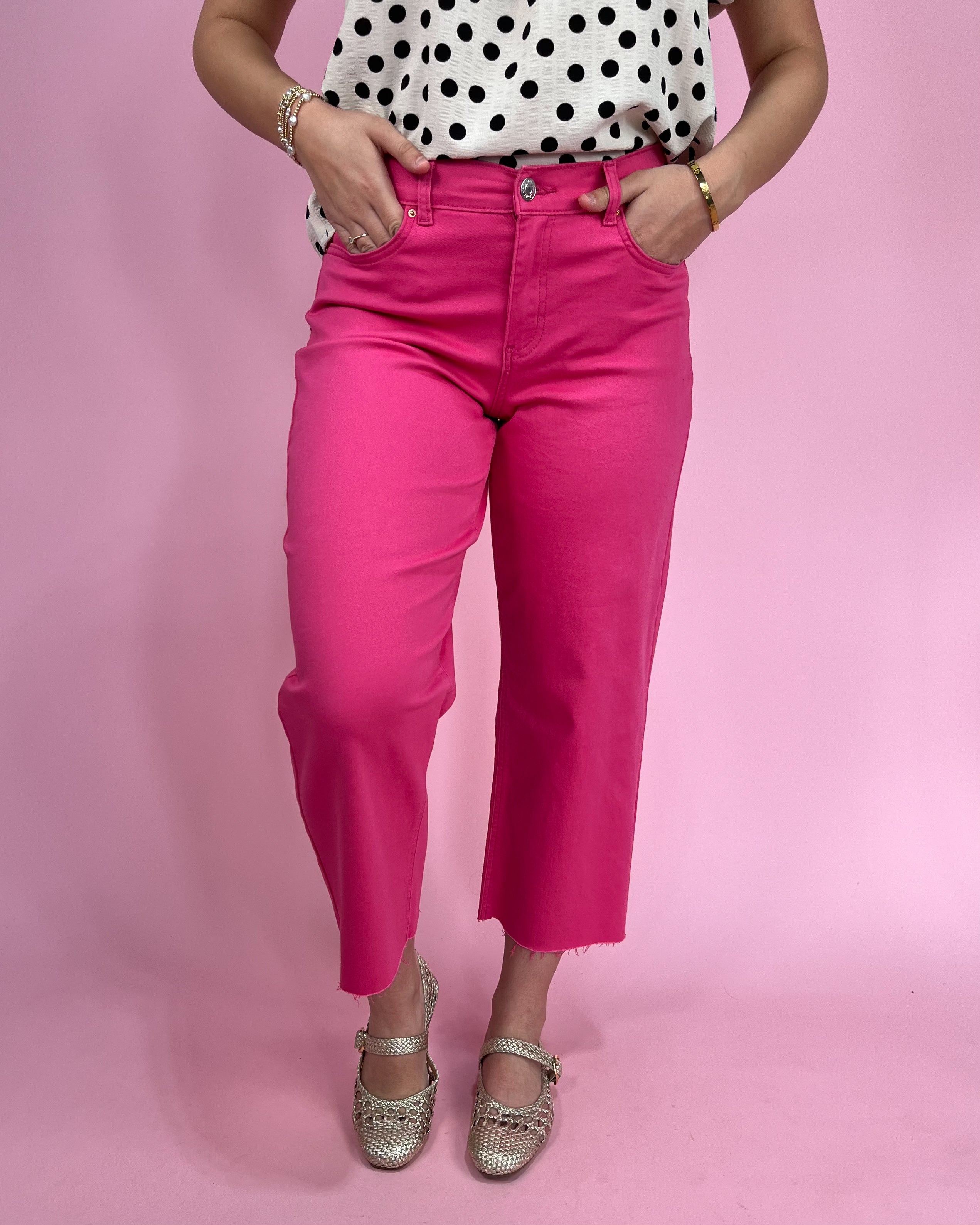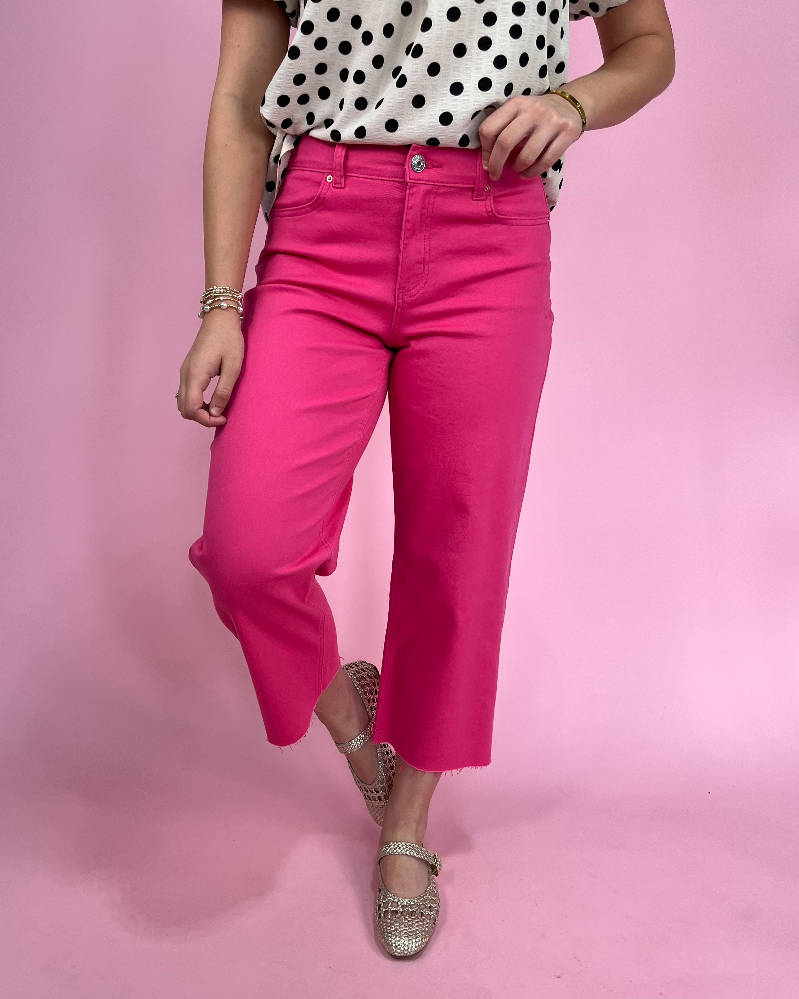 Meet The Veronica Pink Cropped Wide Leg Jeans — the ultimate statement denim that brings all the bold, fun energy to your wardrobe 💖✨. This vibrant pink wash is the kind of color that instantly elevates even the simplest outfit and makes you feel confident the second you slip them on.