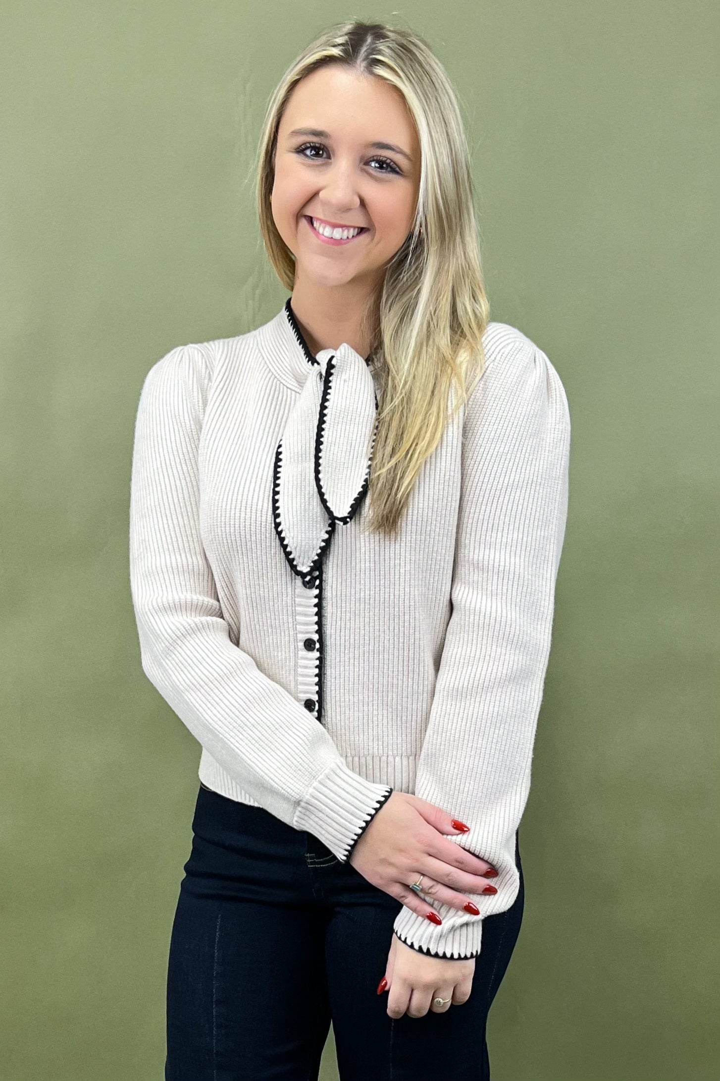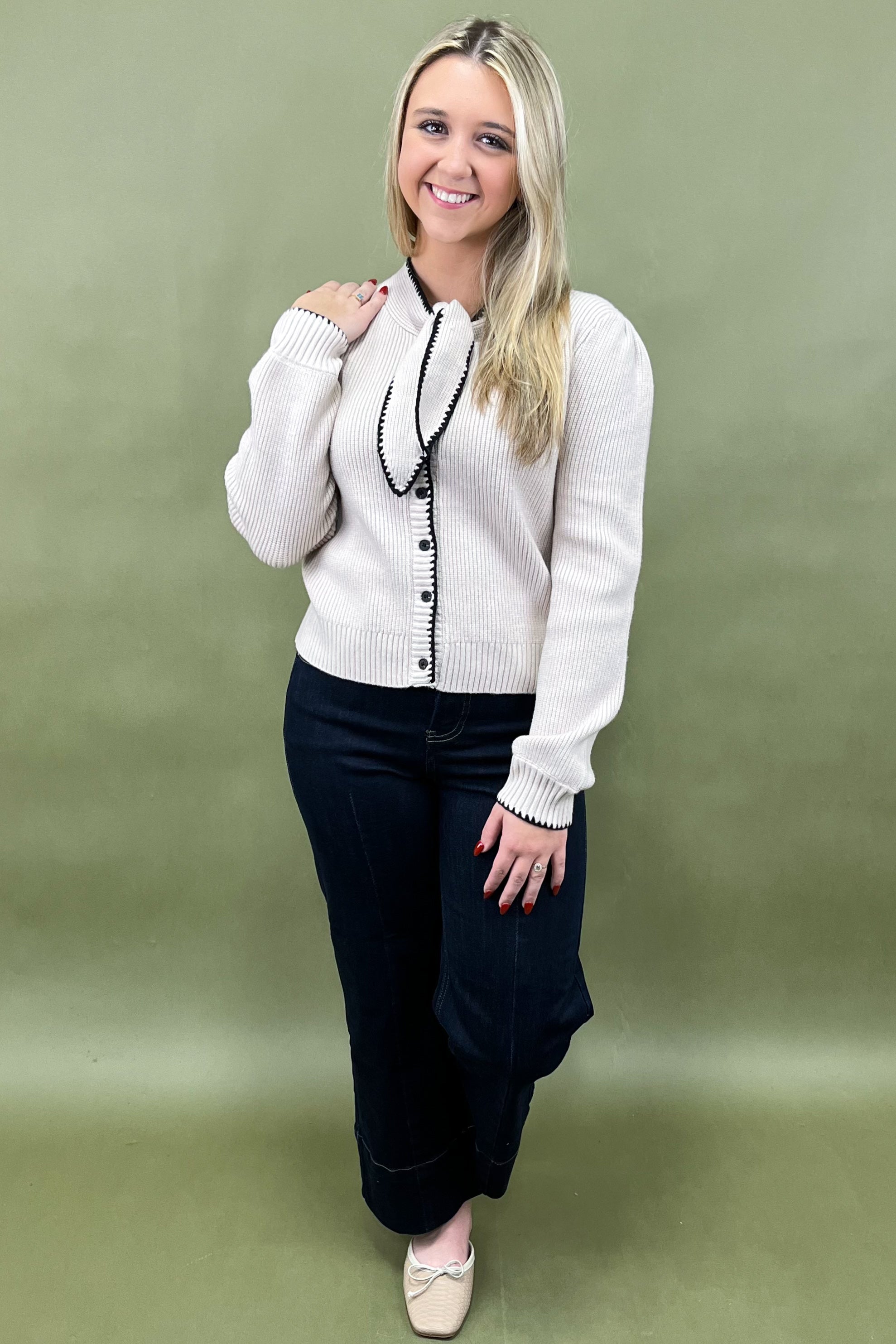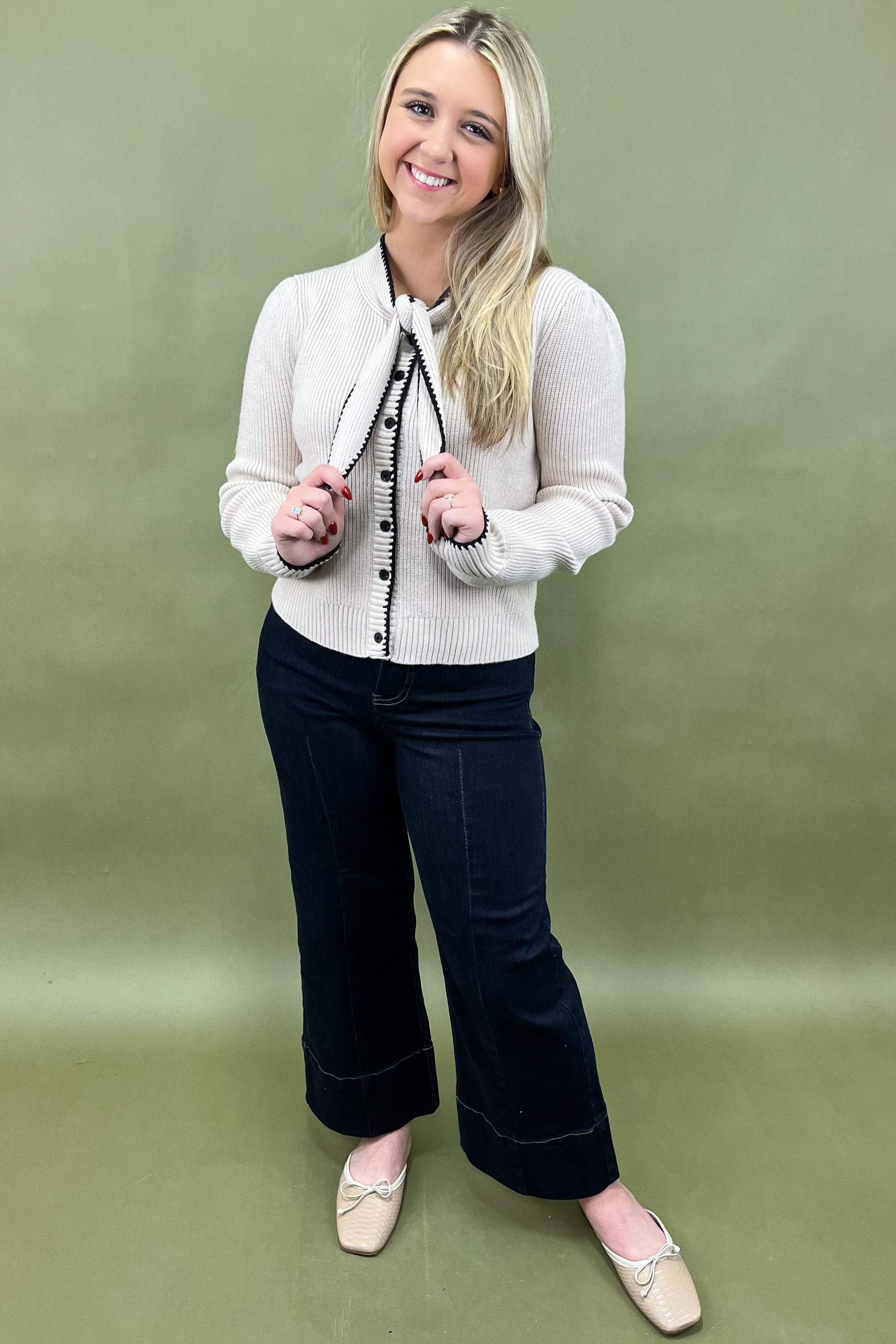 Let’s talk about those details, because they truly make this cardigan shine. The contrast black trim outlines every edge, from the hem to the cuffs, for a perfectly tailored finish that pops just enough. The real star, though? That darling tie-front neckline 🤍. Whether you loop it into a neat bow for that Parisian-polished moment or leave it draped for an effortlessly undone look, it’s giving classy, feminine, and a little flirty.