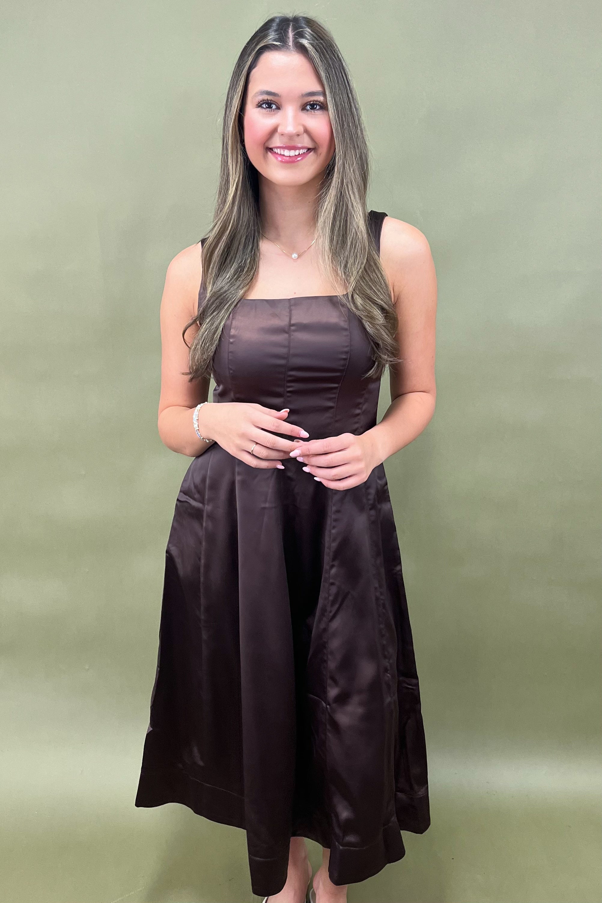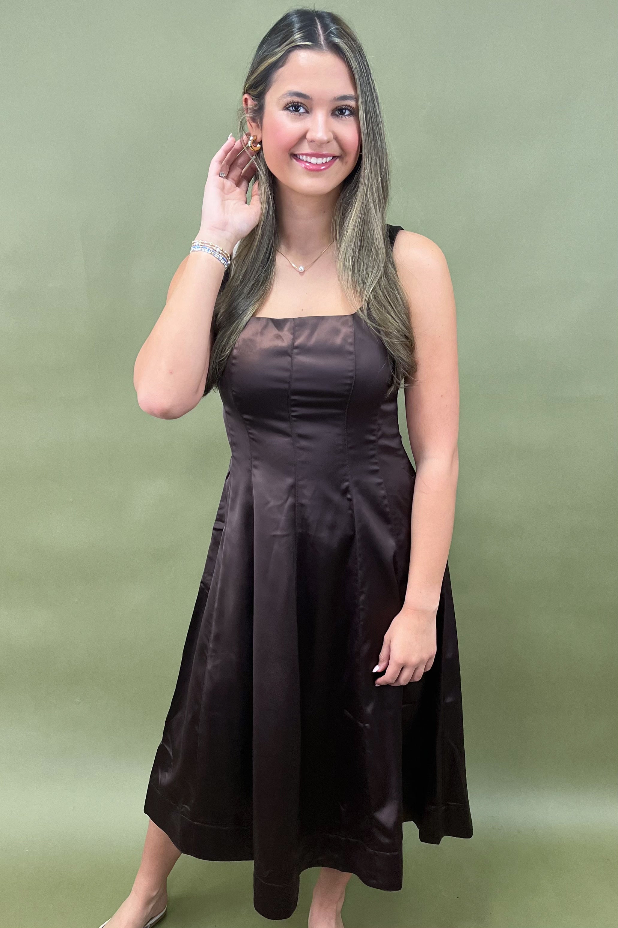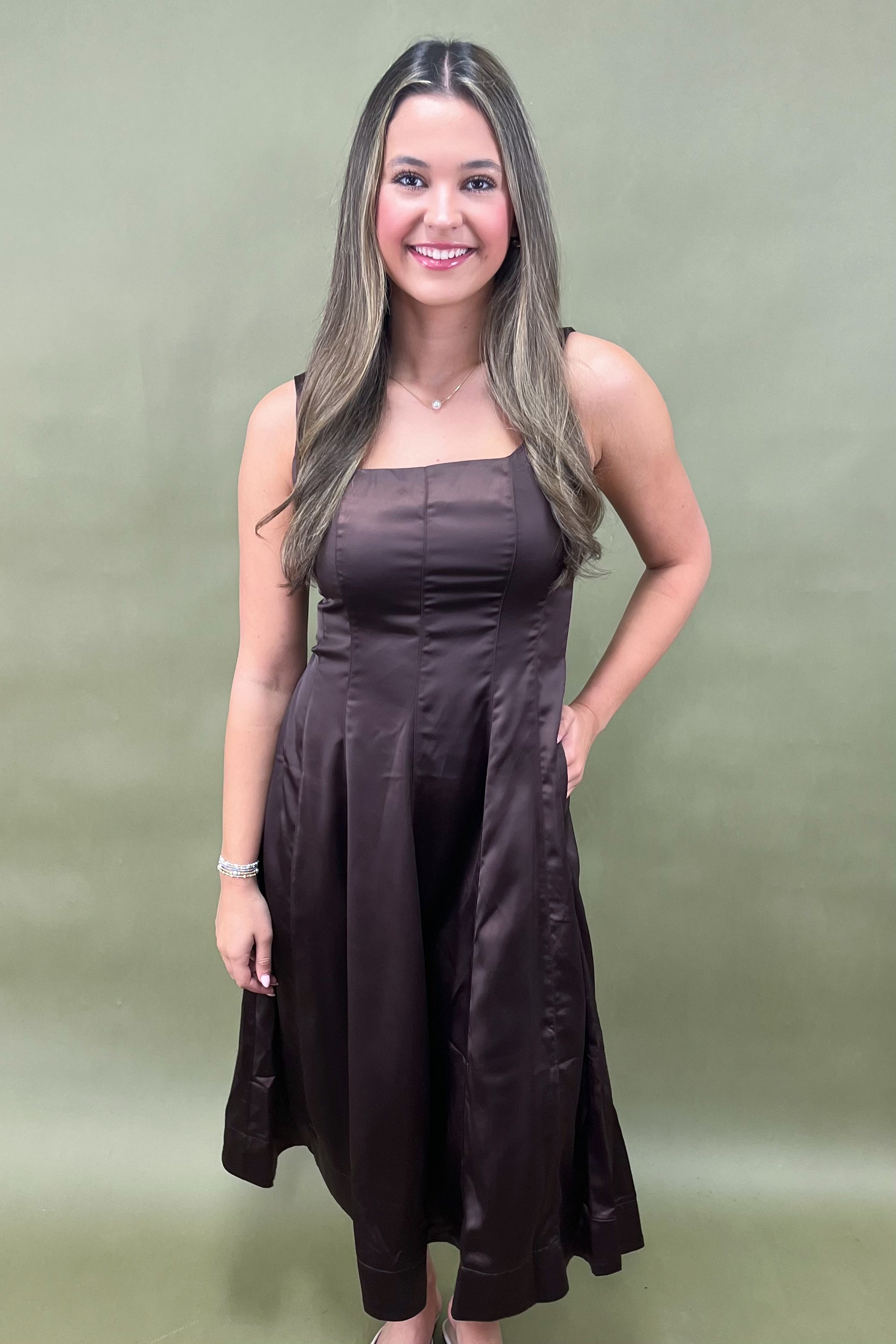 The cut is timeless with a modern edge. Wide straps and a softly scooped neckline flatter your shoulders and décolleté without being too revealing, while the subtle seaming creates a shape that flows effortlessly down the body. The rich autumn-brown shade is the star of the show — bold yet versatile, cozy yet chic, and the perfect alternative to basic black.