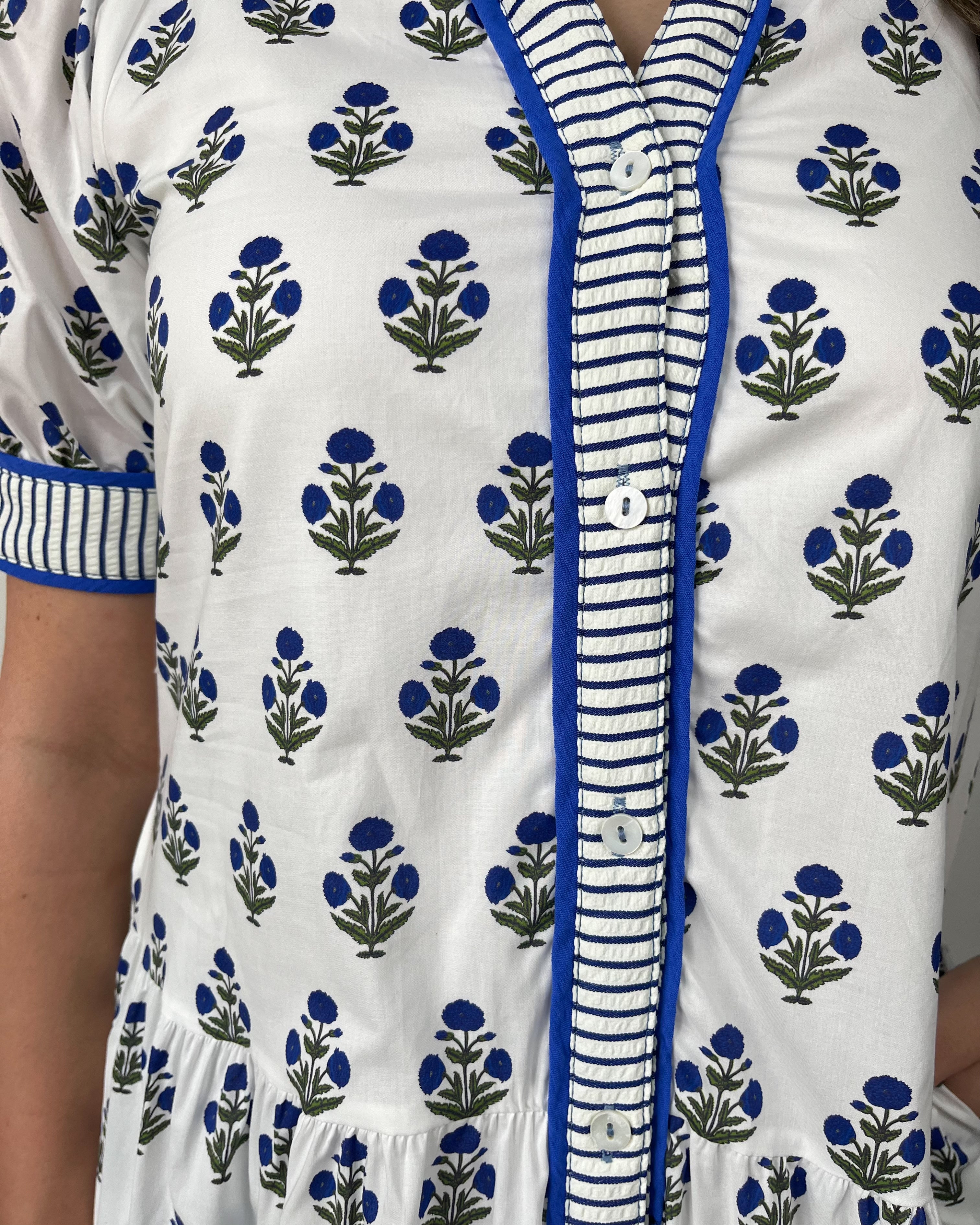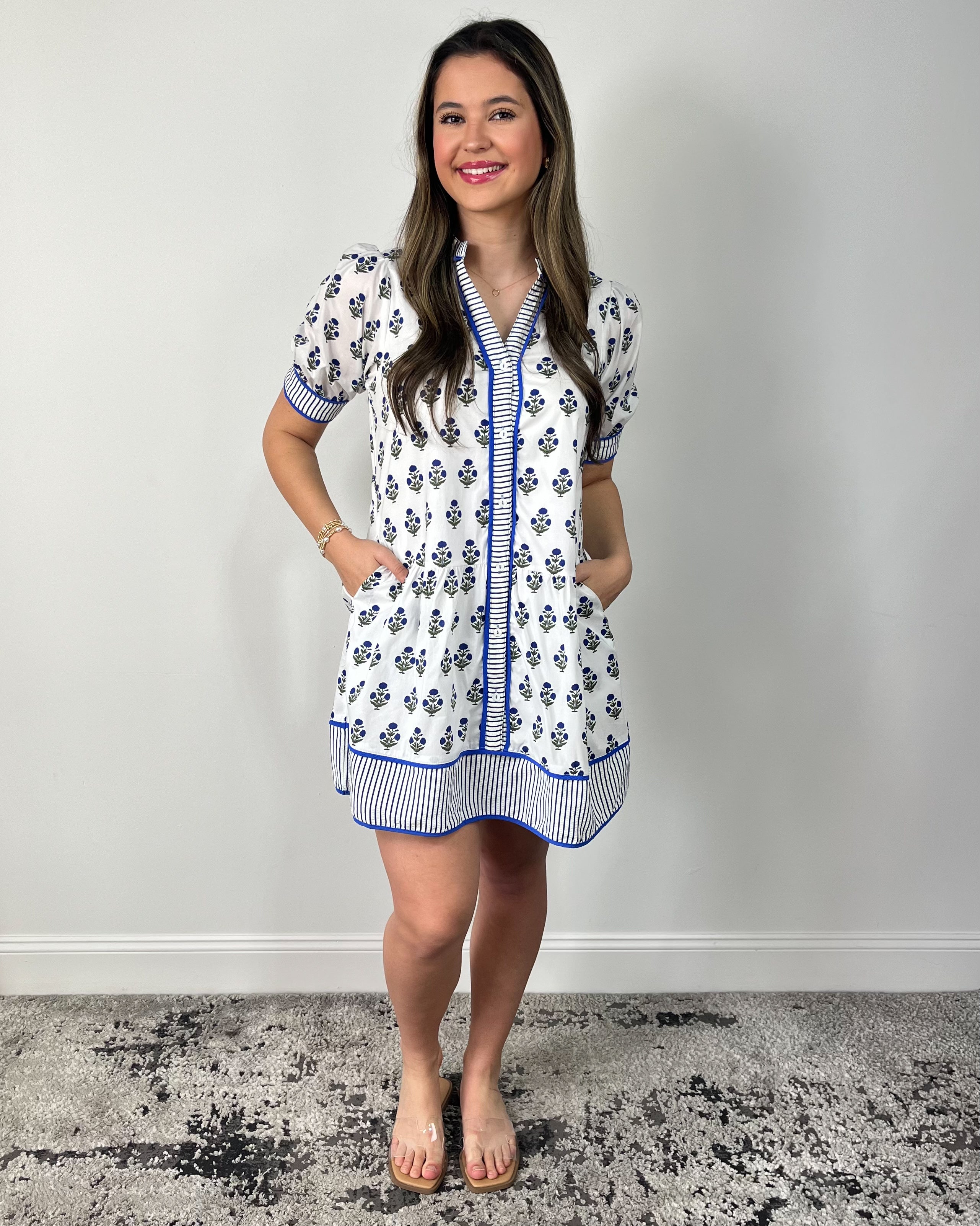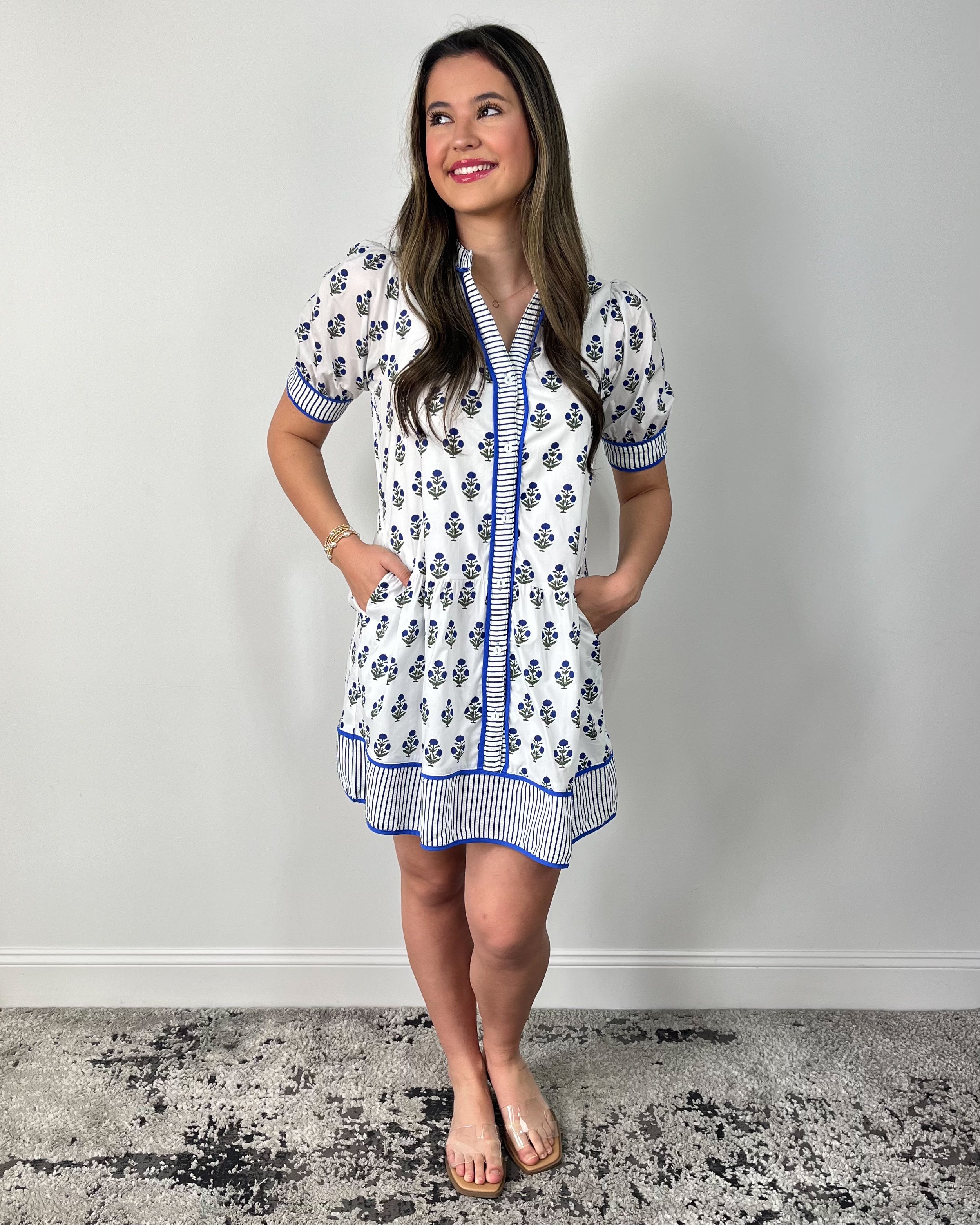 Designed with thoughtful details throughout, this dress showcases a flattering button-front silhouette, a softly structured v-neckline, and contrasting blue trim that adds just the right pop of color. The short puff sleeves bring a romantic touch, while the gently tiered skirt creates beautiful movement with every step.