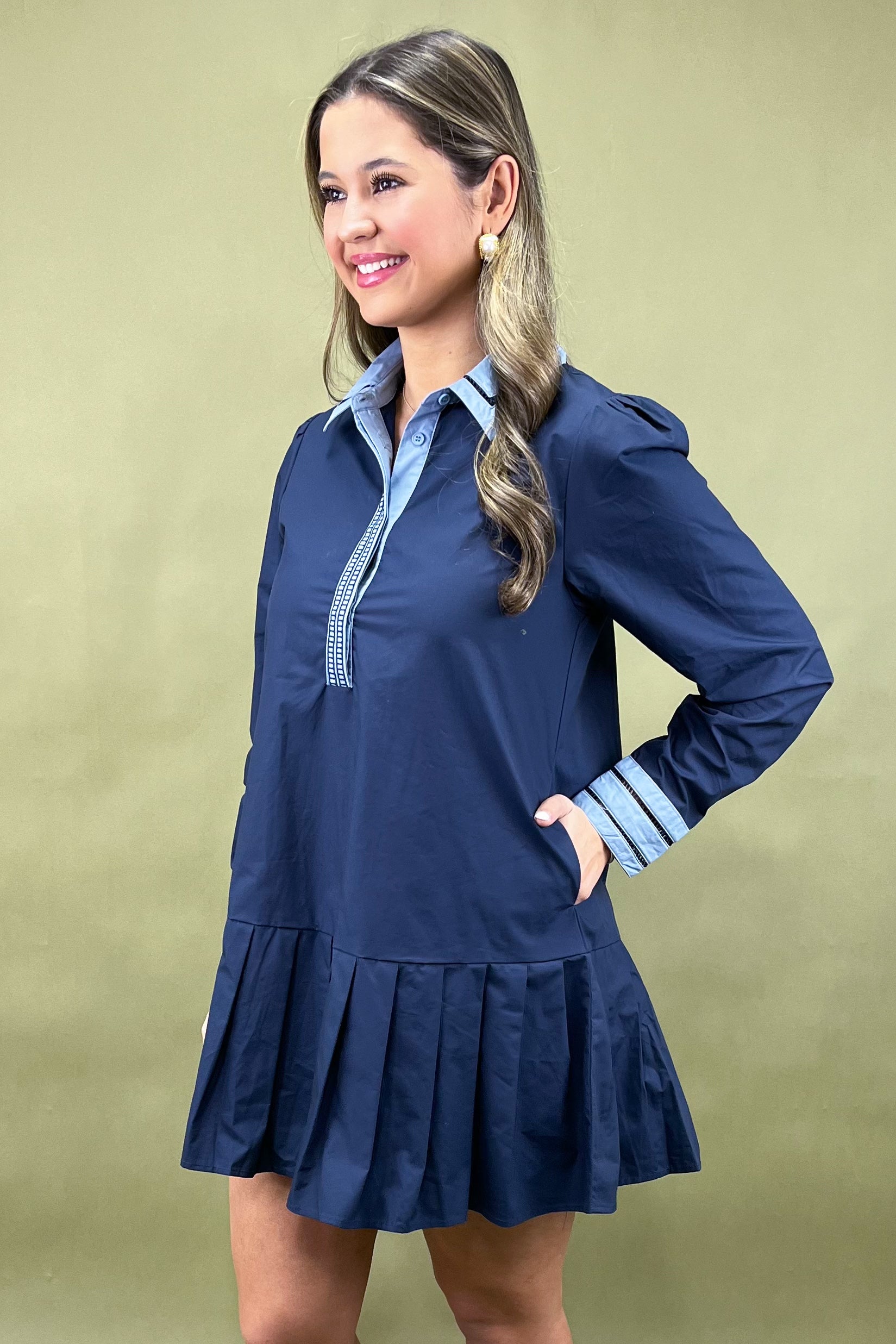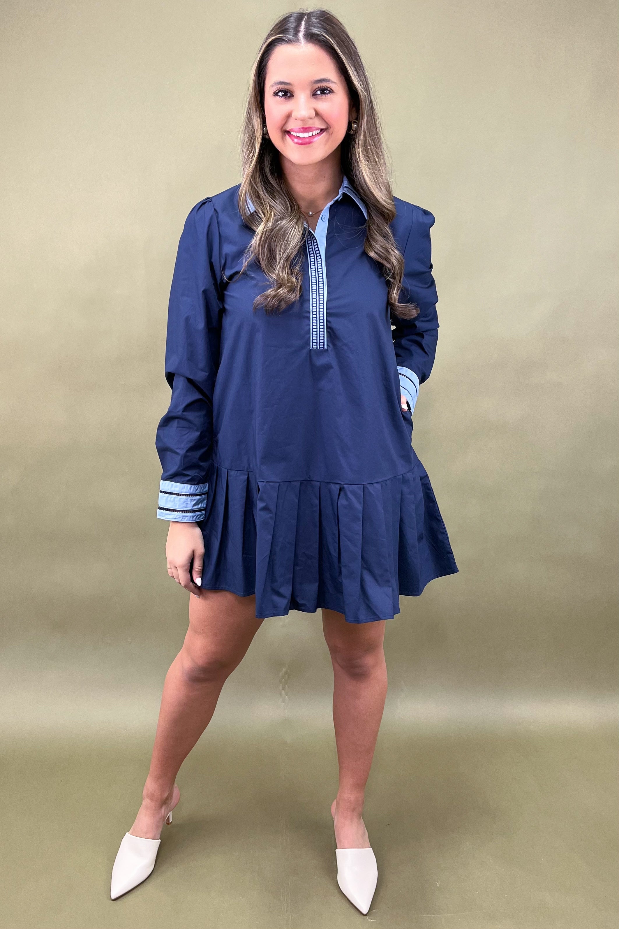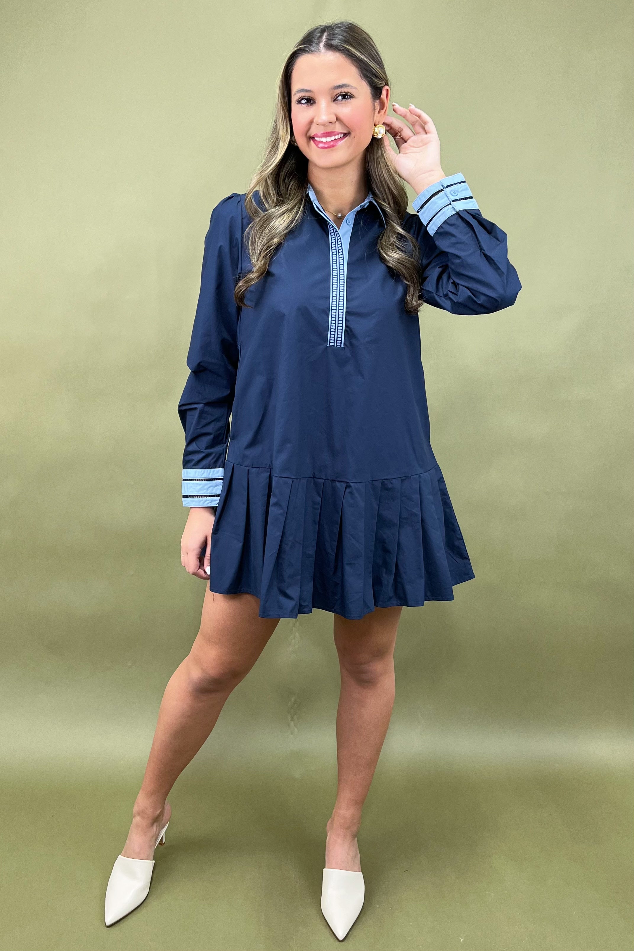 Let’s talk details — because this one is full of them! A classic contrast collar and cuff combo in a soft sky blue instantly pops against the deep navy base. The half-placket front features intricate stitched trim for a subtle designer touch. And that pleated drop hem? It’s flirty, flattering, and gives just the right amount of swing with every step. From seaside brunches to downtown dinners, it’s giving smart, sophisticated, and slightly playful energy.