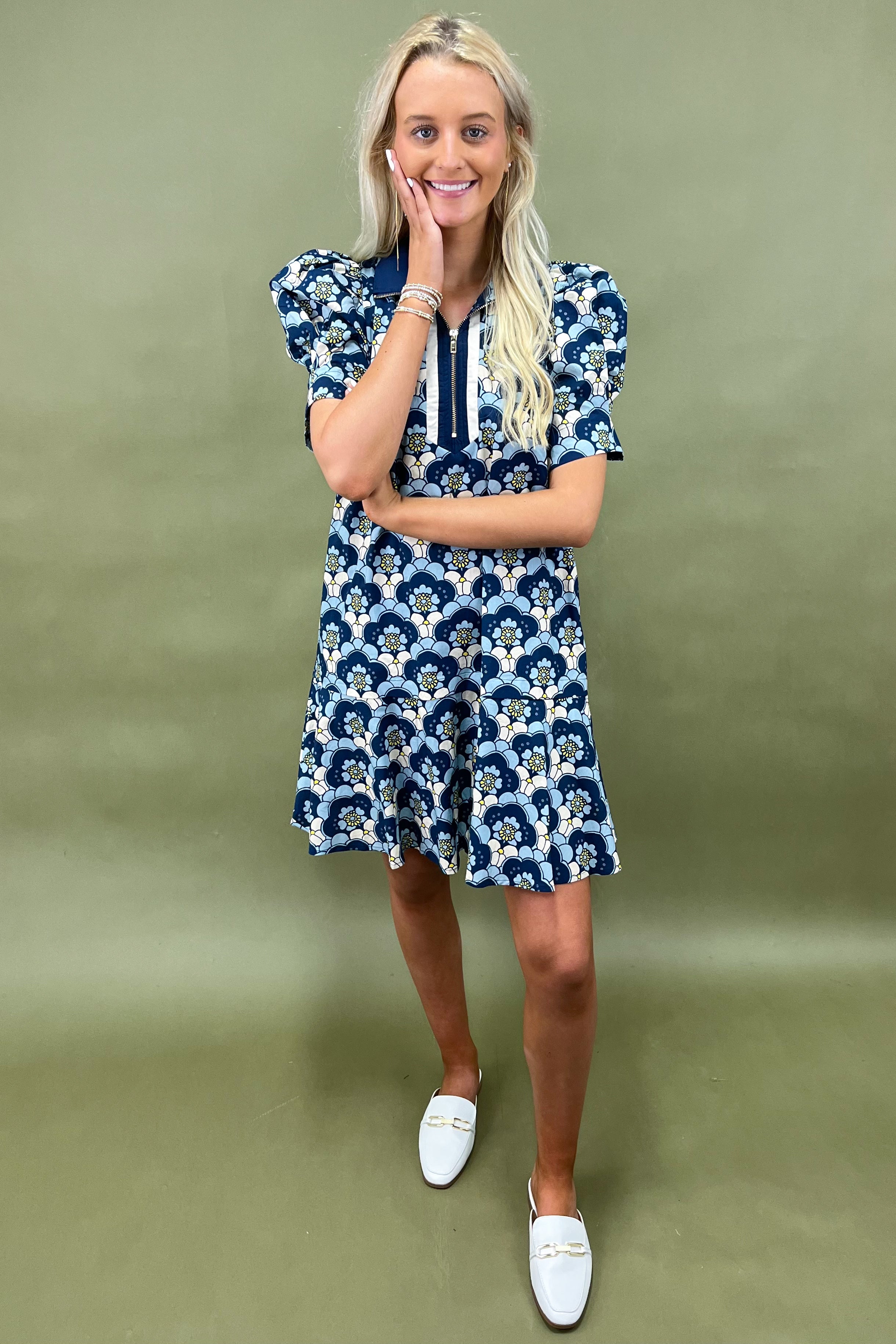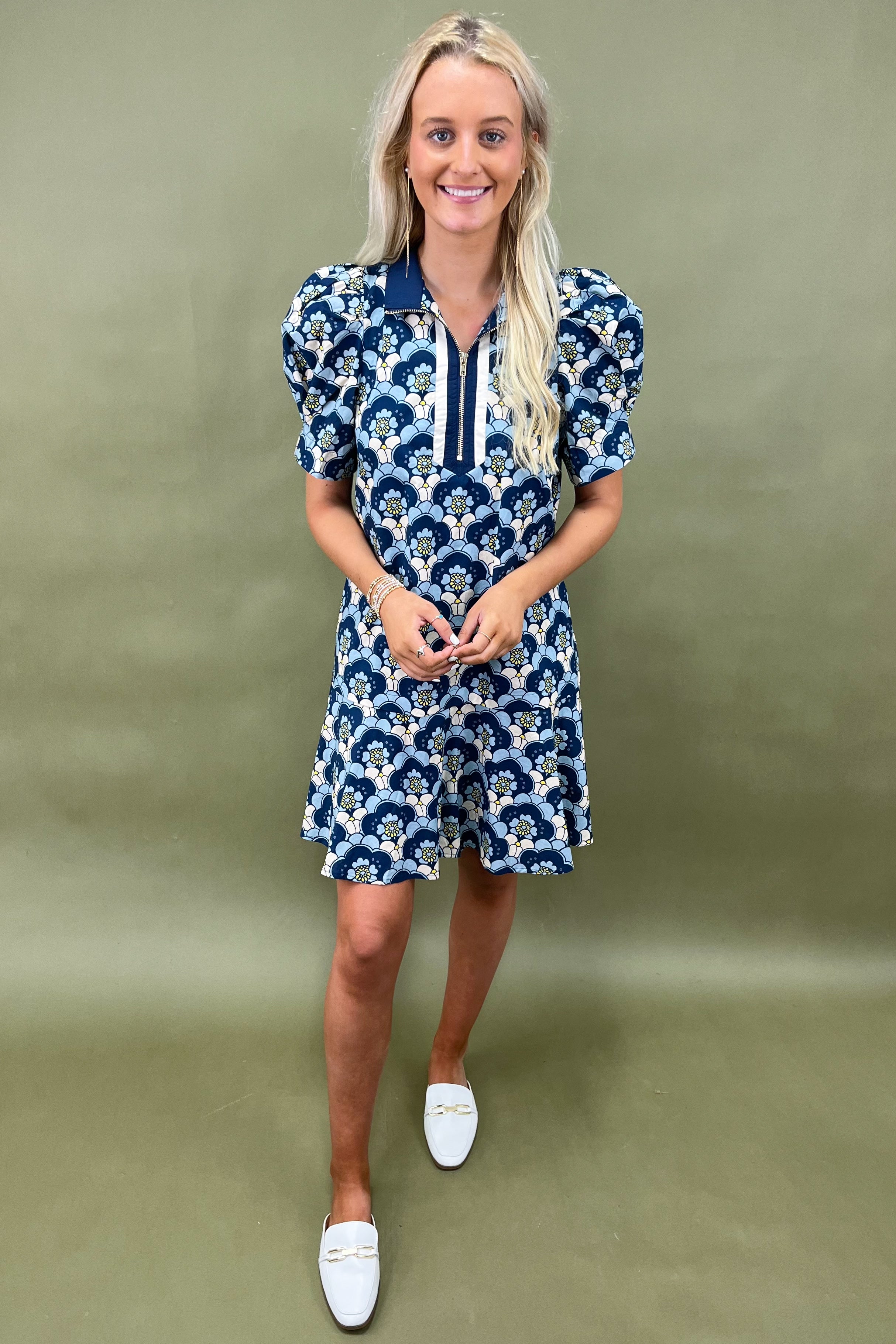 Designed with a vibrant floral print in shades of navy, cream, and sunshine yellow, this dress was made to pop. The playful blossoms dance across a structured silhouette, giving you that effortlessly put-together vibe without trying too hard. The mock neckline paired with the exposed gold zipper detail brings just the right balance of retro flair and modern edge. Short puff sleeves add a hint of drama, while the flattering mini length makes it a versatile style you can dress up or down.
