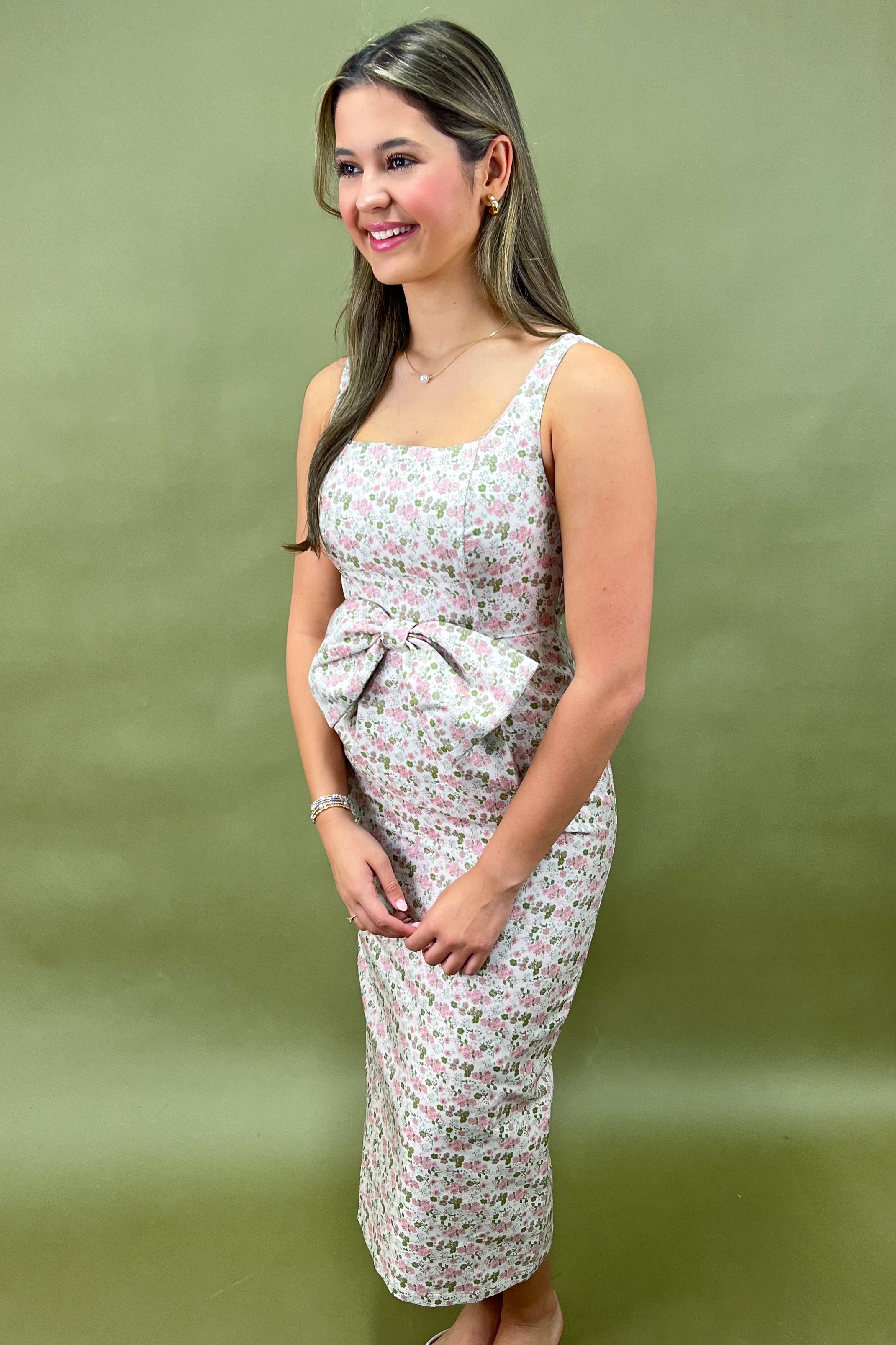 This lined midi beauty is the ultimate blend of feminine charm and classic style. Covered in a soft, ditsy floral print with shades of pinks and greens scattered across a creamy backdrop, it’s basically spring and summer wrapped into one gorgeous piece. The star of the show? That statement bow detail right at the waist 🎀. It cinches you in perfectly while giving your look that playful-yet-polished vibe.