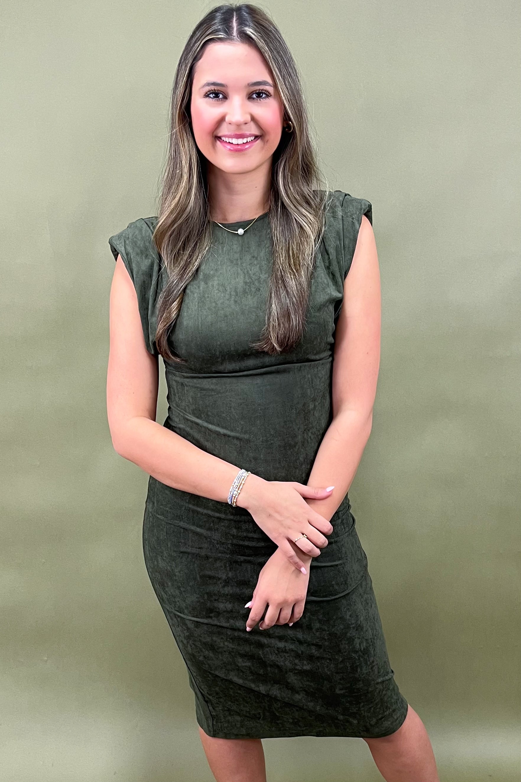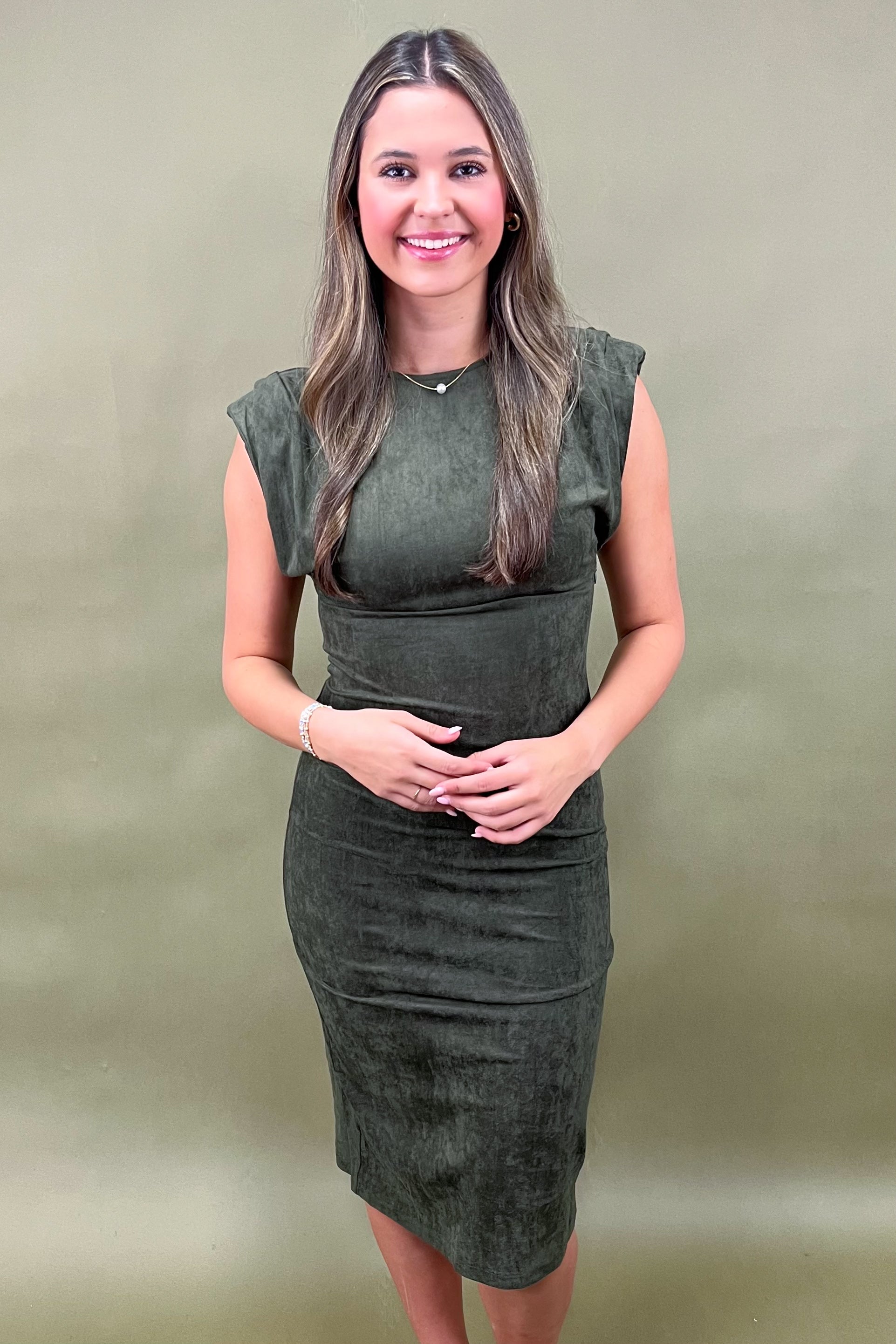 Crisp air, cozy vibes, and your new go-to statement dress—the Falling For Olive Midi Dress. This stunner blends timeless elegance with a touch of edge, thanks to its luxe suede-like texture and power-shoulder silhouette. Draped in the richest earthy olive hue, she’s basically fall fashion wrapped up in one irresistible piece. Whether you’re sipping wine at a vineyard, strolling through the pumpkin patch, or heading out for a chic date night, this dress brings main-character energy every single time. ✨