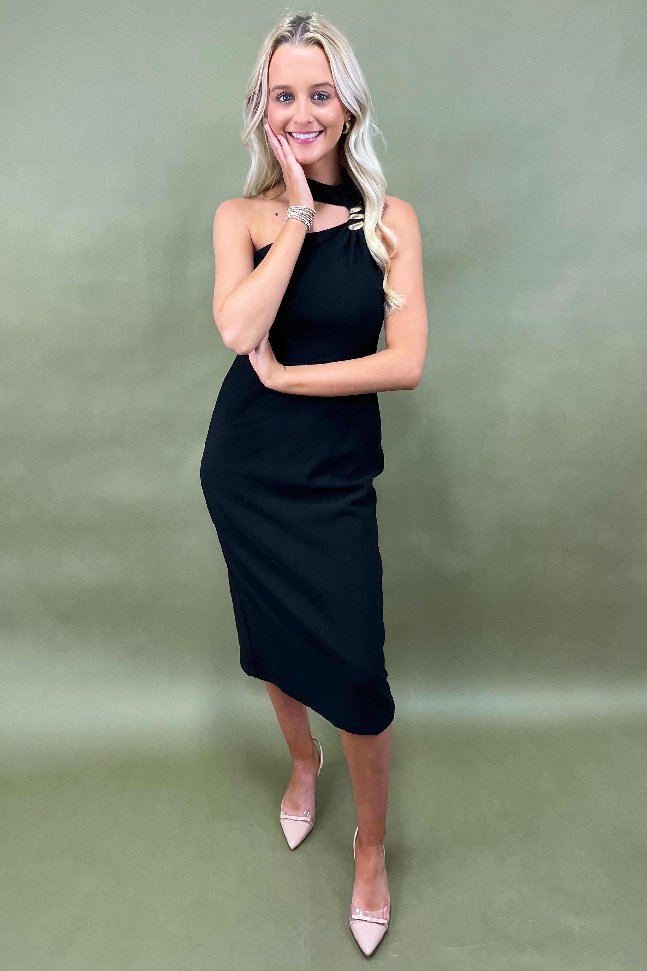 The one-shoulder halter neckline features a chic twist detail, elevated by bold gold hardware accents that add just the right amount of shine đ. The sleek, body-skimming silhouette flows into a graceful midi-to-maxi length, elongating your frame and creating a statuesque look thatâs perfect for any black-tie affair.