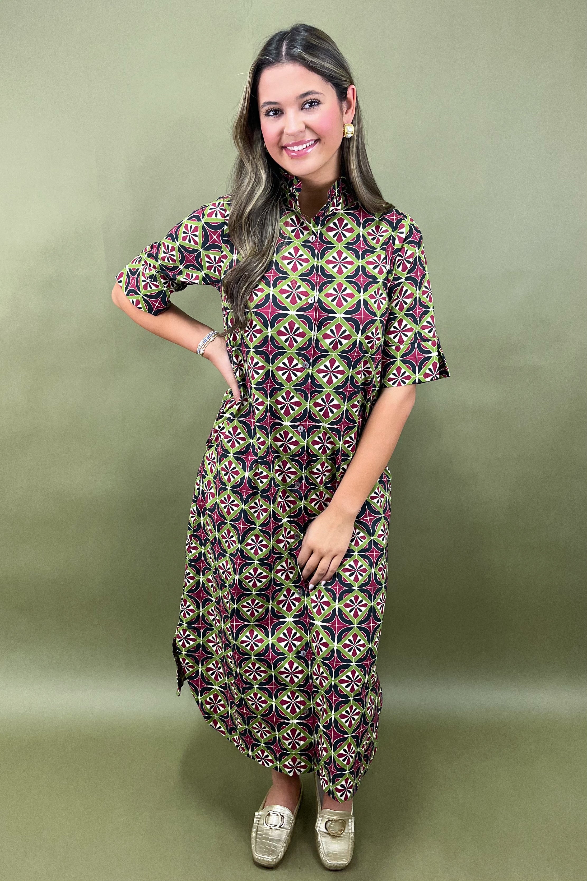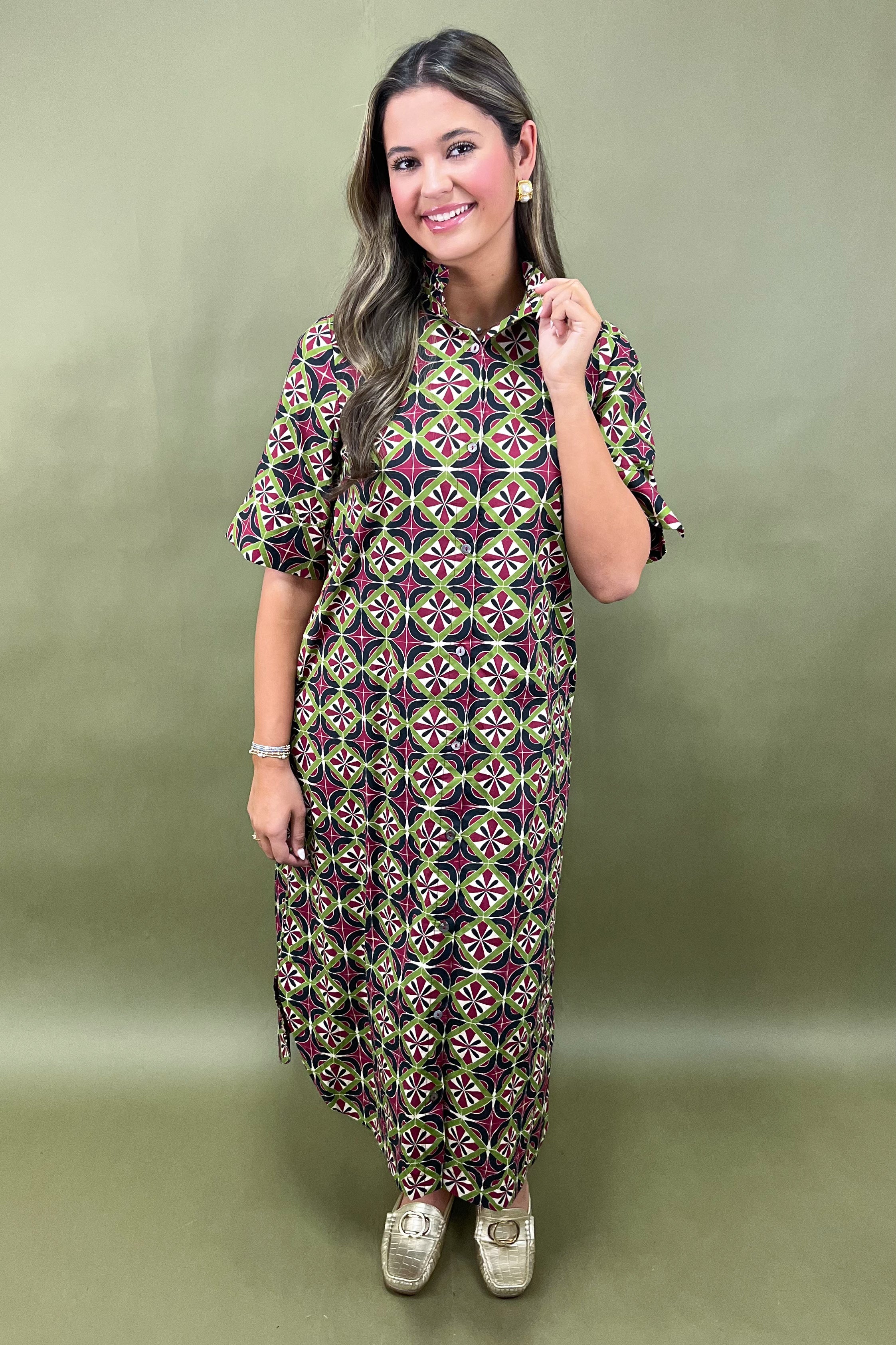 Bold. Bright. Beautifully effortless. Meet the Geometric Blooms Button-Up Dress, the statement-making piece that turns everyday dressing into an art form. đšâš With its kaleidoscope print of plum, fuchsia, olive, and cream, this beauty gives off major retro-chic energy â think vintage mosaic meets modern muse.
