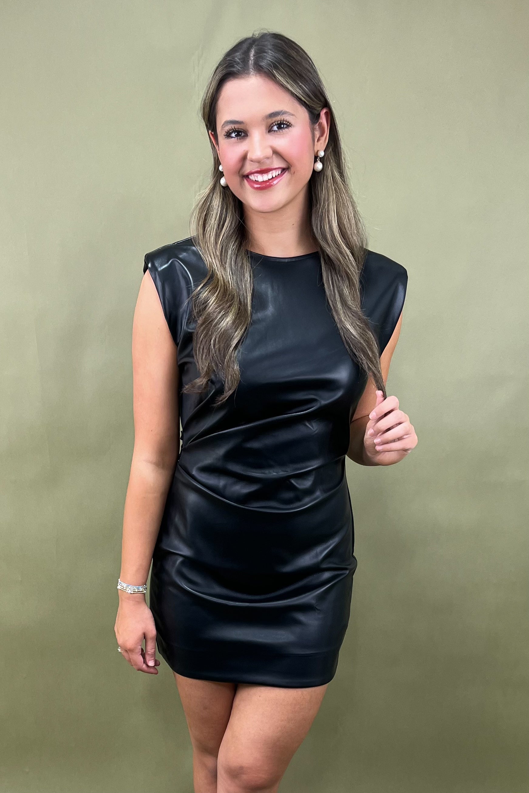 The Onyx Aura Faux Leather Dress captures the perfect balance between refined sophistication and downtown edge. It’s sleek, versatile, and made to make a statement — whether you’re stepping out for a night on the town or styling it up for a chic dinner look. From its rich onyx tone to its sculpted fit, this piece radiates bold energy and timeless appeal.
