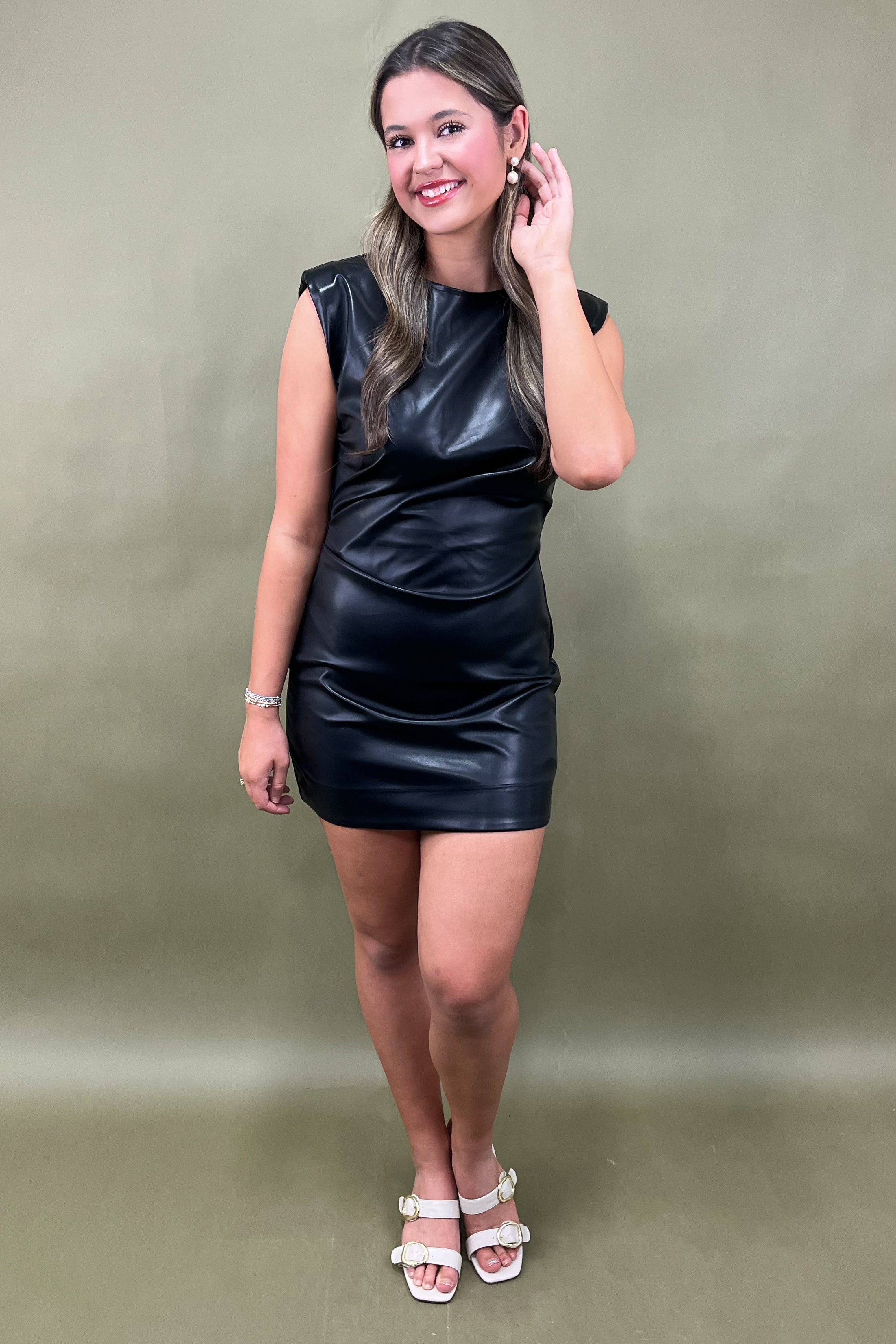 With its smooth, high-shine finish and slightly sculpted fit, this dress embodies elevated minimalism. The sleeveless cut and soft stretch lining ensure comfort without compromising attitude, making it a perfect choice for date nights, rooftop cocktails, or your next evening out. It’s the ultimate wardrobe power move — sleek, strong, and undeniably stylish.
