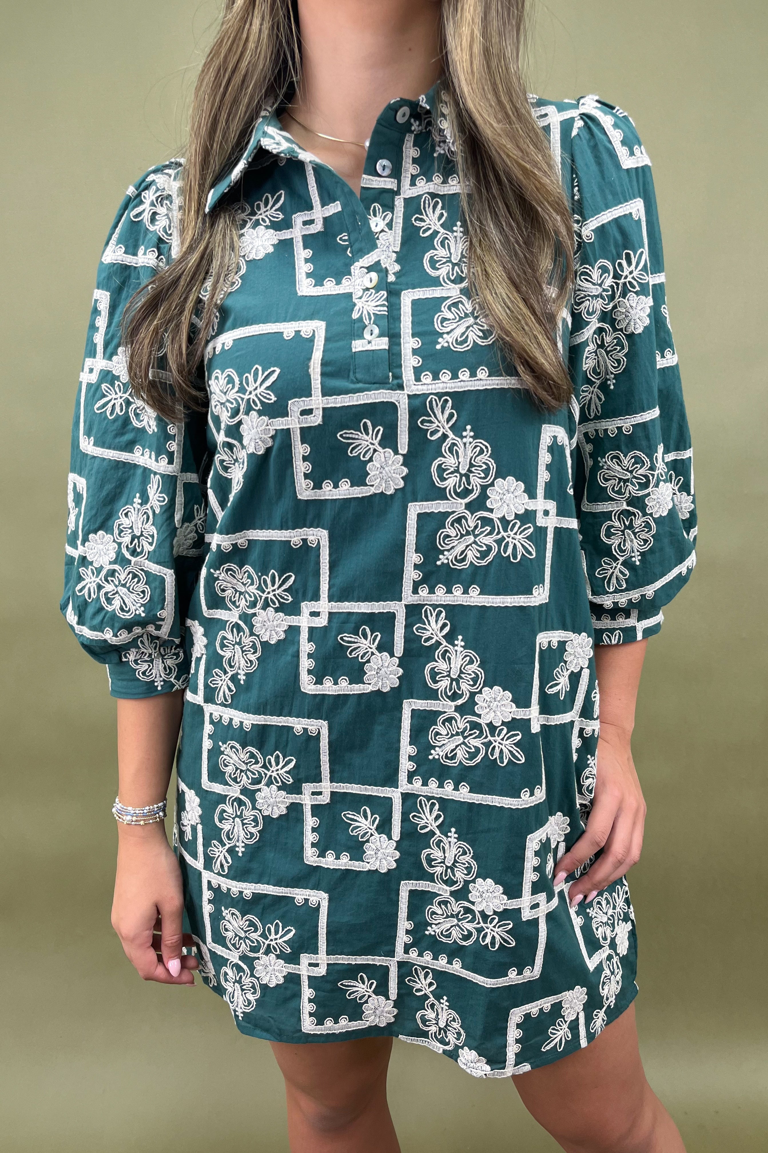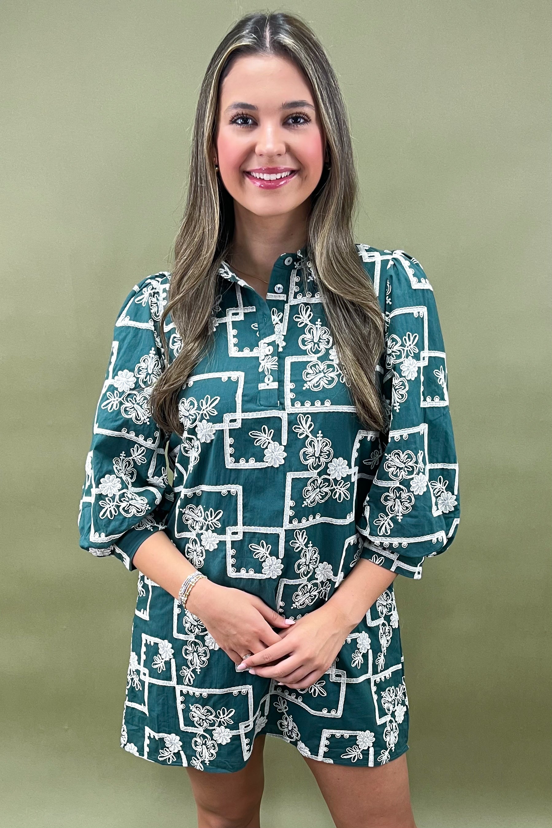 Crafted from 100% cotton and fully lined, it’s as breathable as it is beautiful—perfect for all-day wear no matter the season. The soft hunter-green base serves as the canvas for the true showstopper: delicate ivory embroidery stitched in playful patchwork-style squares filled with blooming floral details. 🌾 It’s a little bit boho, a little bit modern, and a whole lot of fun.