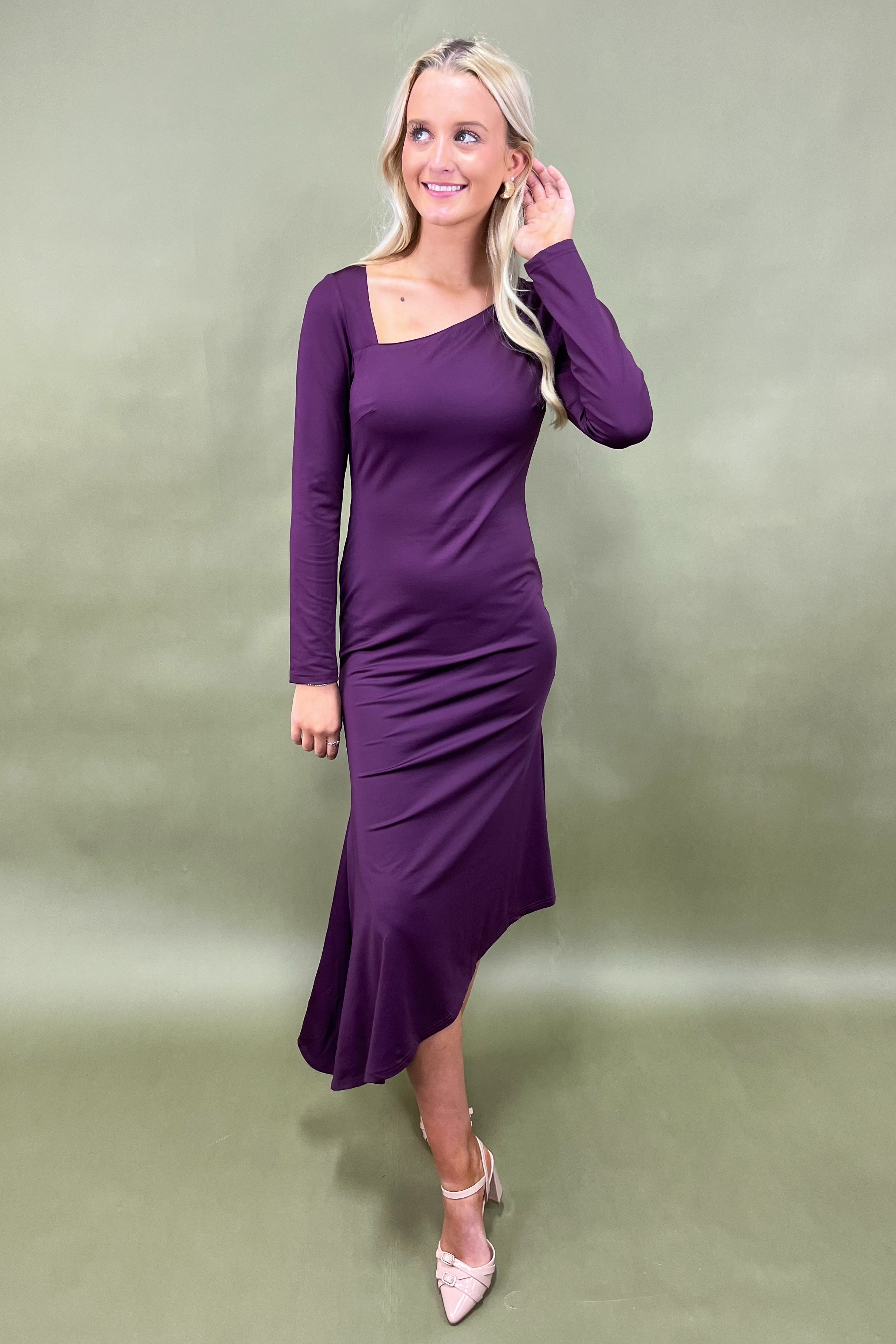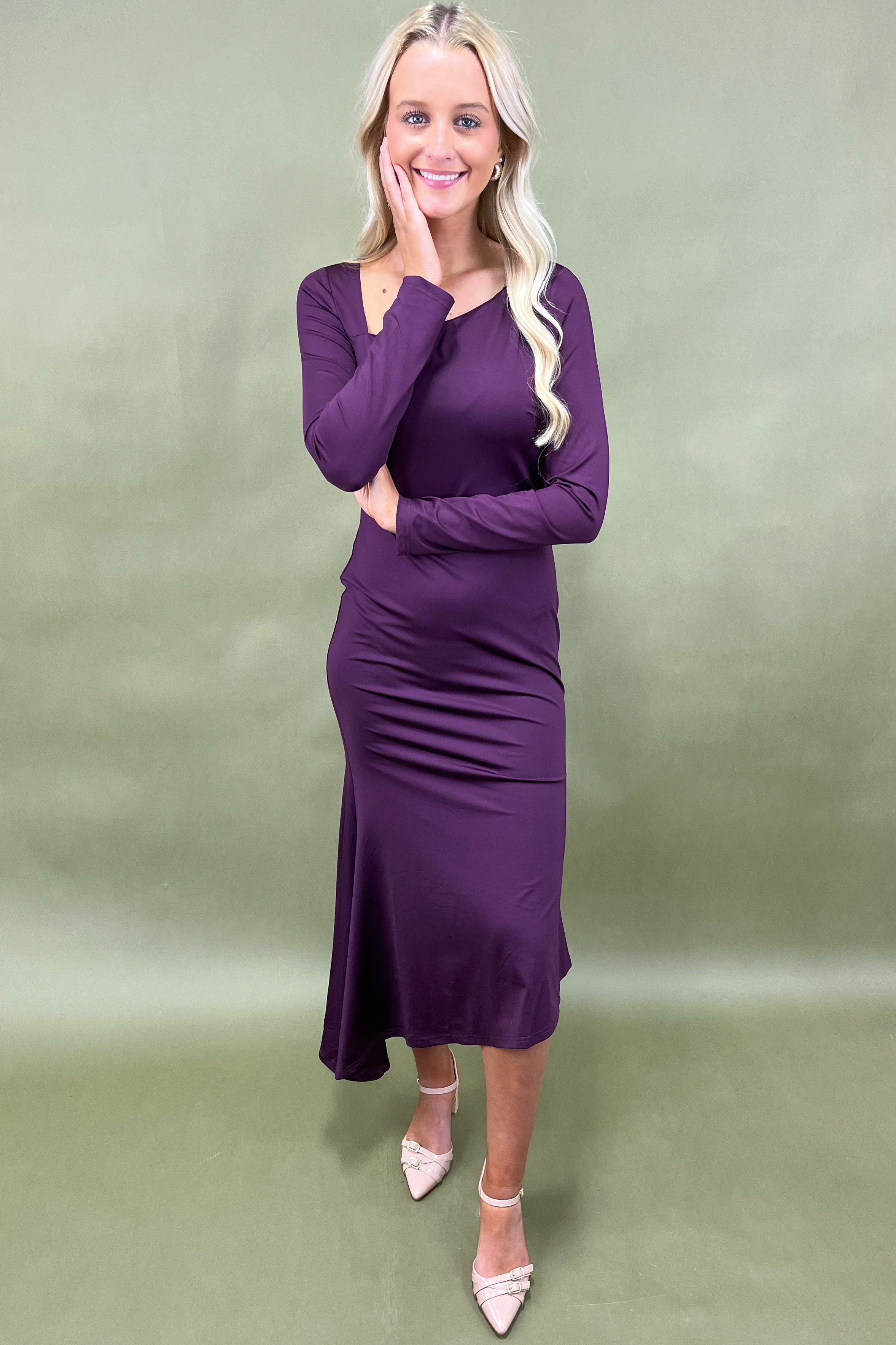 The Plum Enchantress Dress isn’t just about looking amazing—it’s about feeling amazing. That rich plum color is universally flattering, bringing out the warmth in every skin tone and making it a total standout in your closet. The design walks the line between modern chic and timeless elegance, so it’s not just trendy—it’s something you’ll keep reaching for season after season.The asymmetrical neckline sets this dress apart from the rest. It’s not your everyday cut—it’s unique without being over the top, giving it that boutique feel that makes you stand out. Whether you’re slipping into it for a night on the town or pairing it with boots and a statement jacket for a more casual vibe, it’s the kind of piece that always earns compliments.