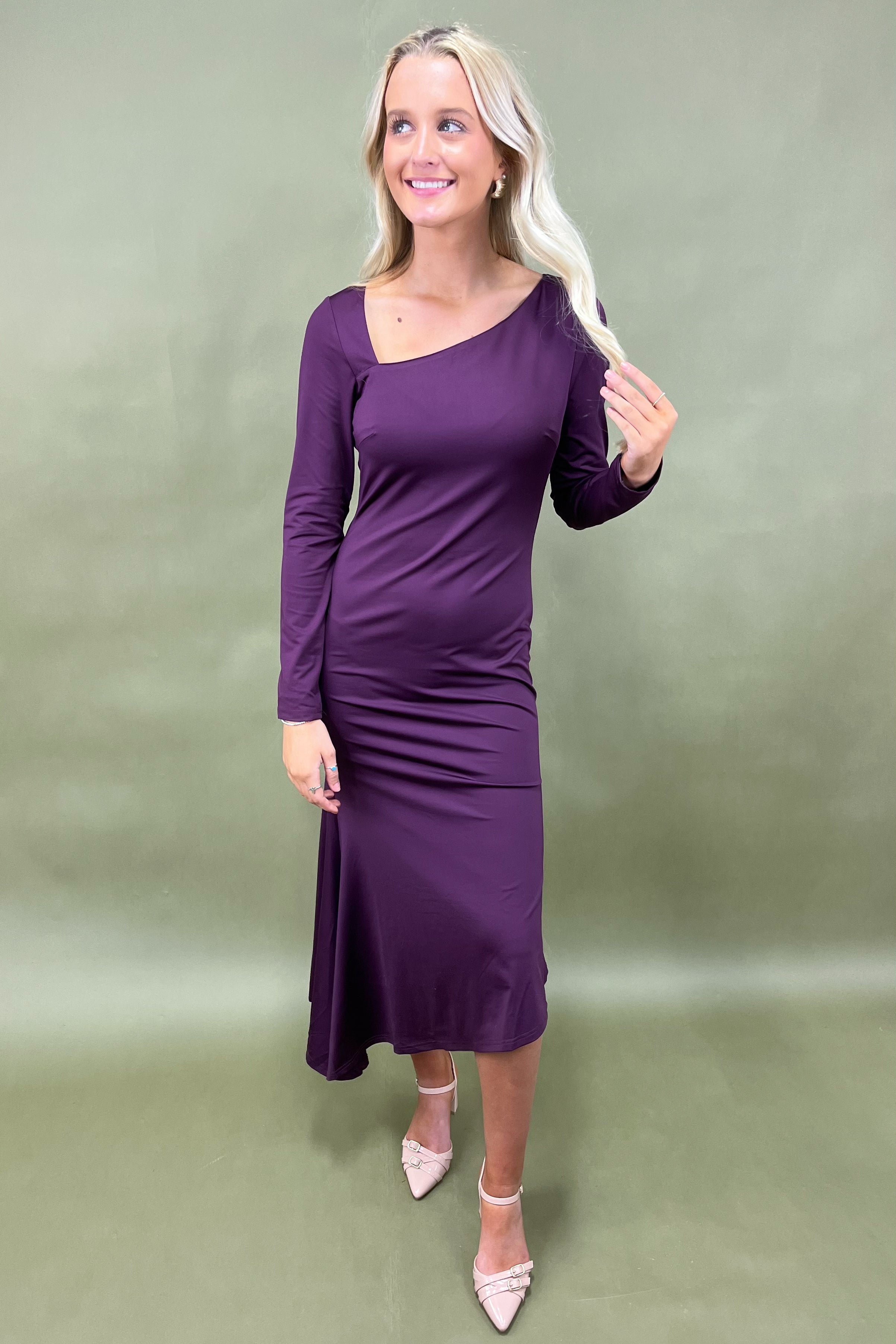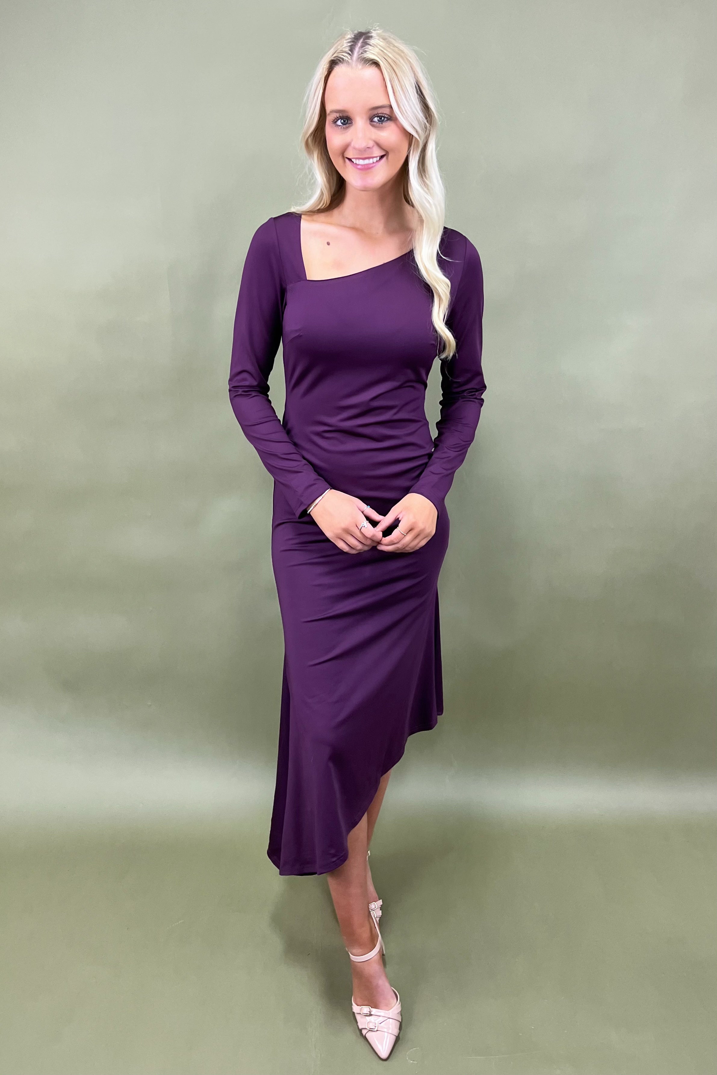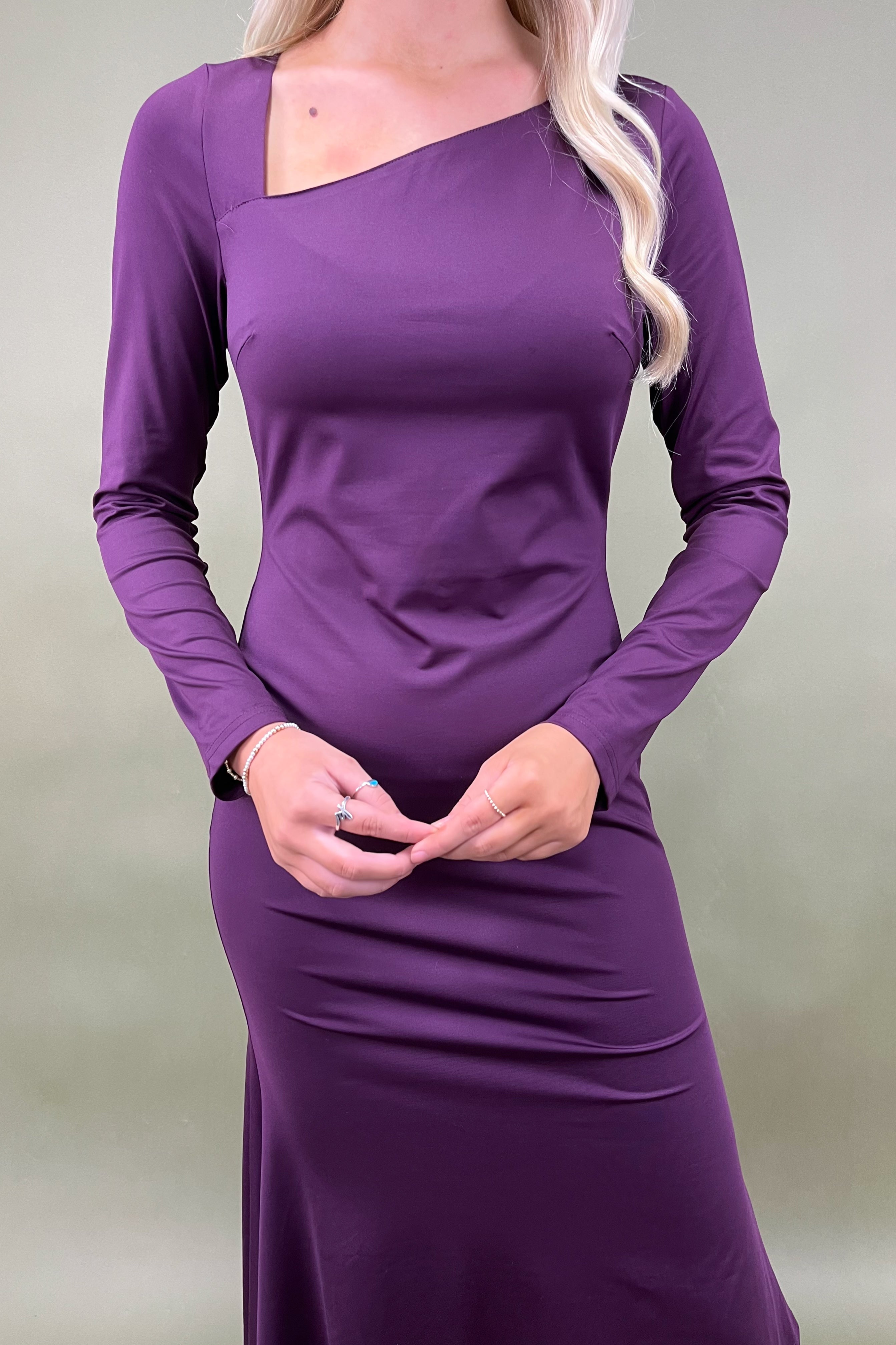 The deep plum shade instantly evokes feelings of romance and allure, making it the perfect choice for evenings out, holiday parties, date nights, or any time you want to feel effortlessly chic. The silhouette is sleek yet comfortable, draping with just the right amount of structure to flatter your figure while allowing ease of movement. And then there’s the neckline—oh, the neckline! With its subtle asymmetrical cut, it’s the kind of detail that whispers style while still making a bold statement. Unexpected, yet so tasteful.