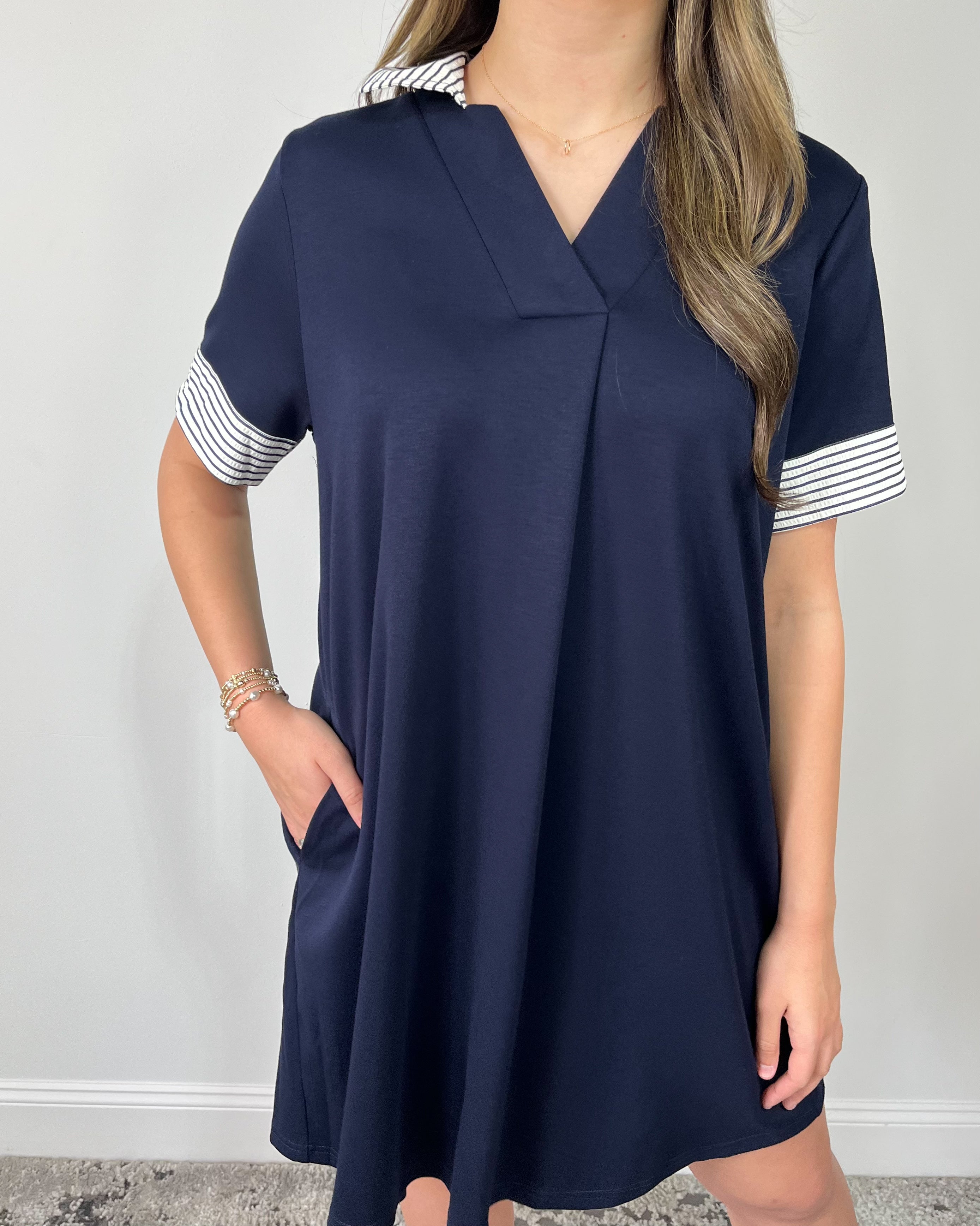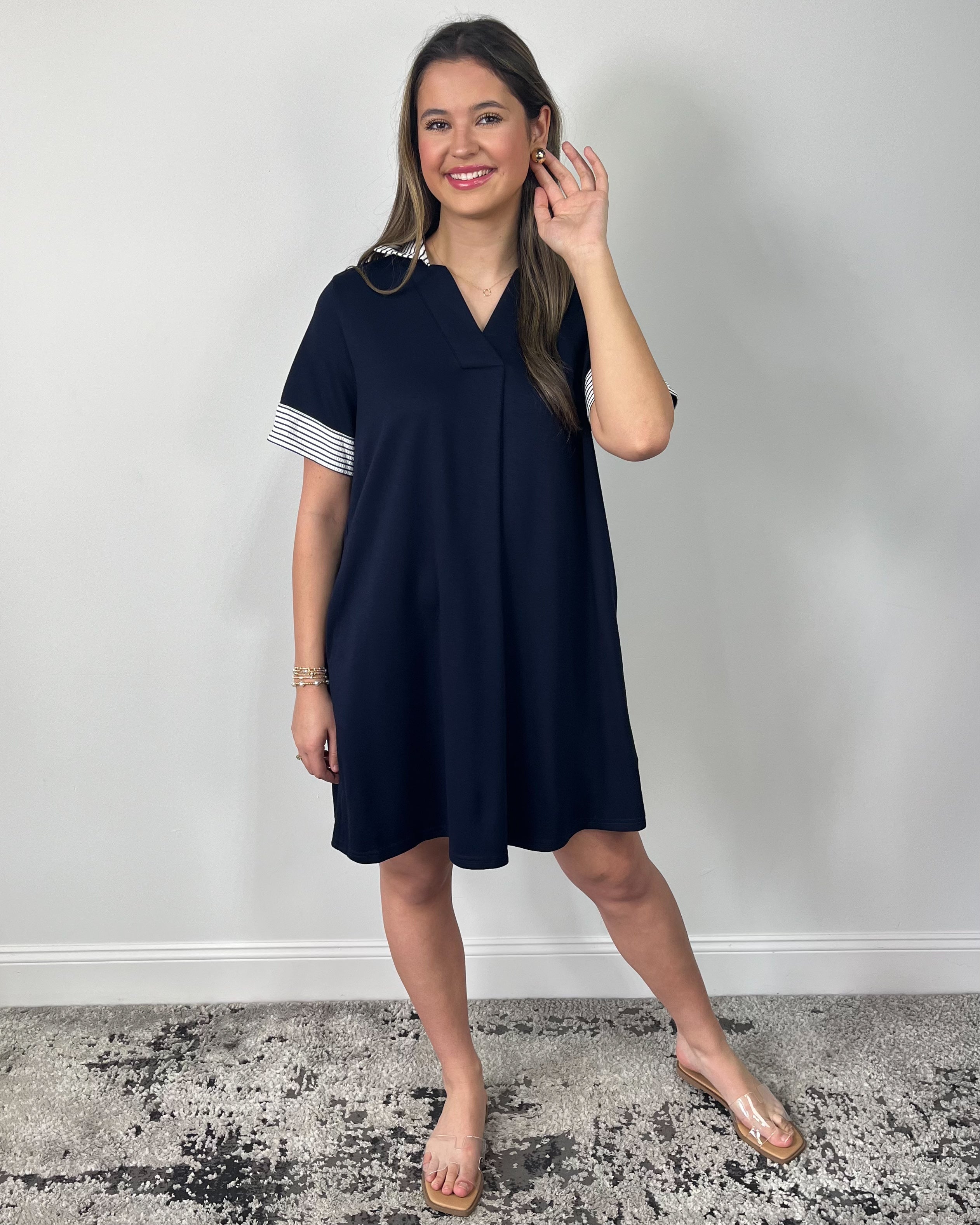 The Prep & Polished Mini Dress is giving effortless sophistication with a playful, polished twist 💙✨ This navy mini is the definition of classic-meets-cute, featuring crisp contrast stripe details at the collar and sleeves for that timeless preppy vibe 👔🤍 Perfect for days when you want to look put-together without even trying, this dress transitions seamlessly from work to weekend plans ☕➡️🍷