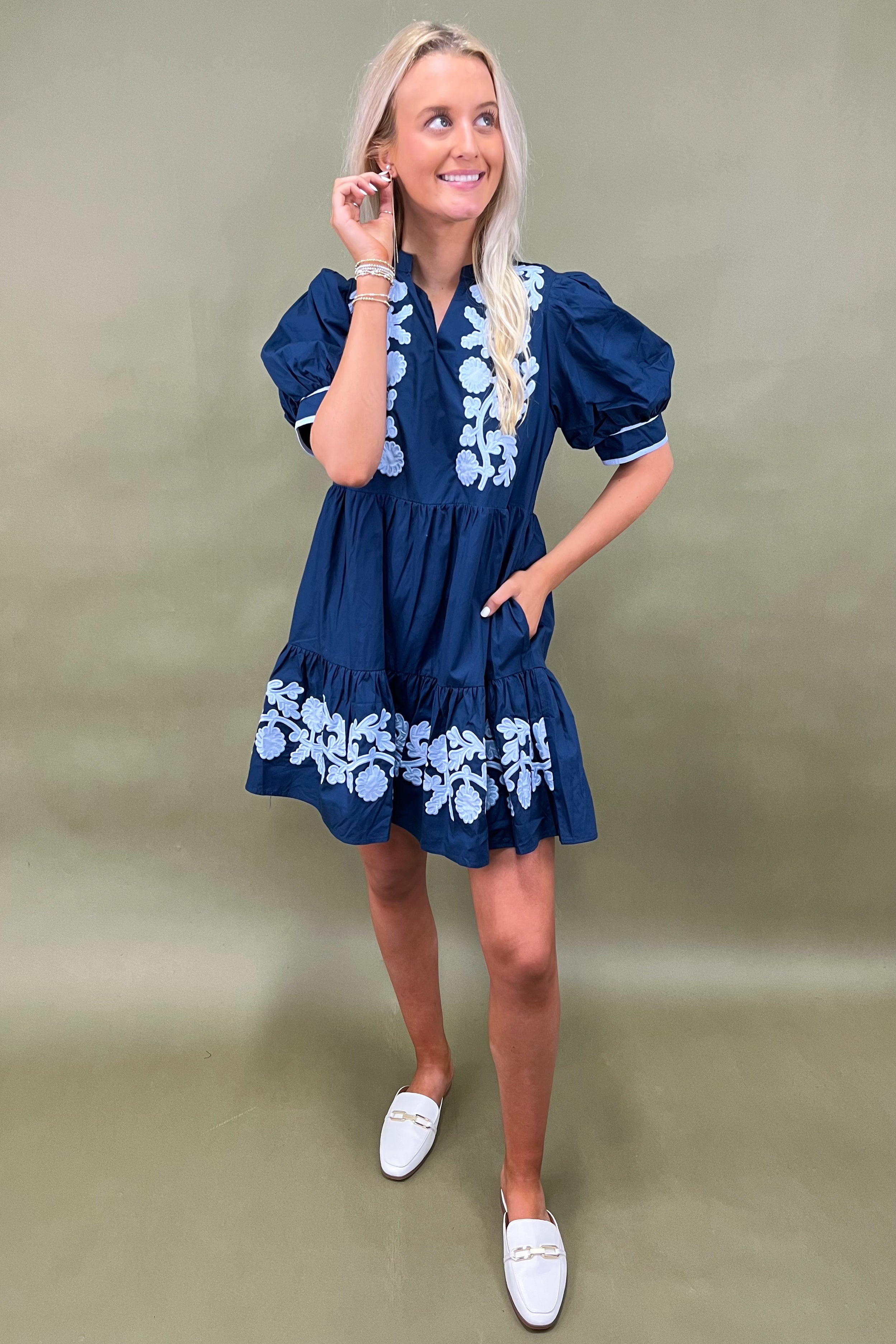 Made from 100% cotton and fully lined for comfort, this beauty gives you breathable wear all day long while still looking luxe. The rich navy base is timeless and universally flattering, but what really sets this piece apart is the stunning white floral embroidery that pops like constellations against the midnight sky. Delicate blooms dance across the chest and hemline, adding texture, dimension, and that perfect “boutique feel” we know you crave.