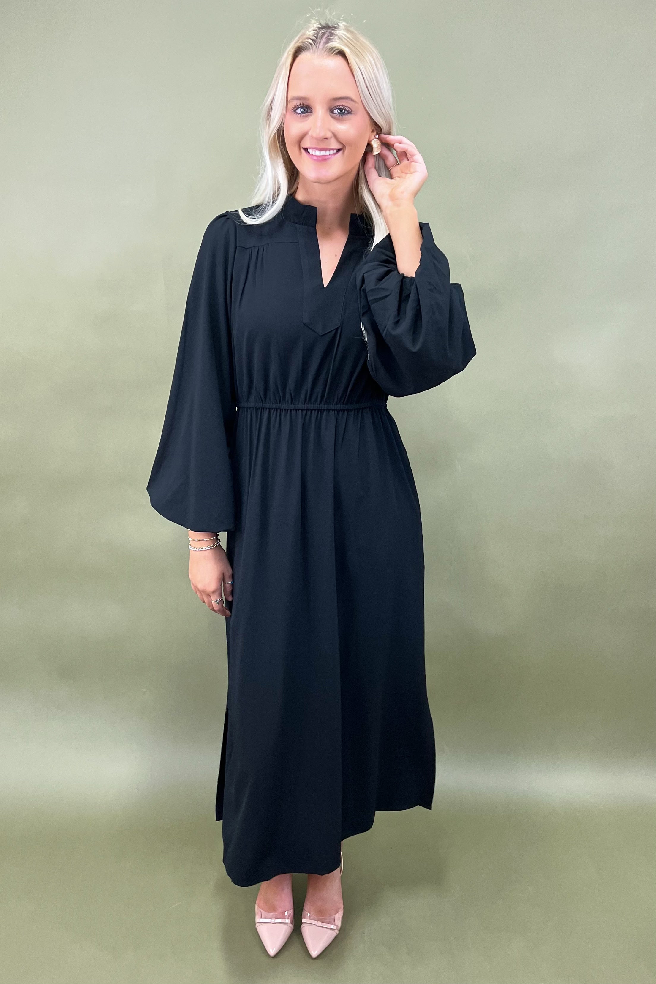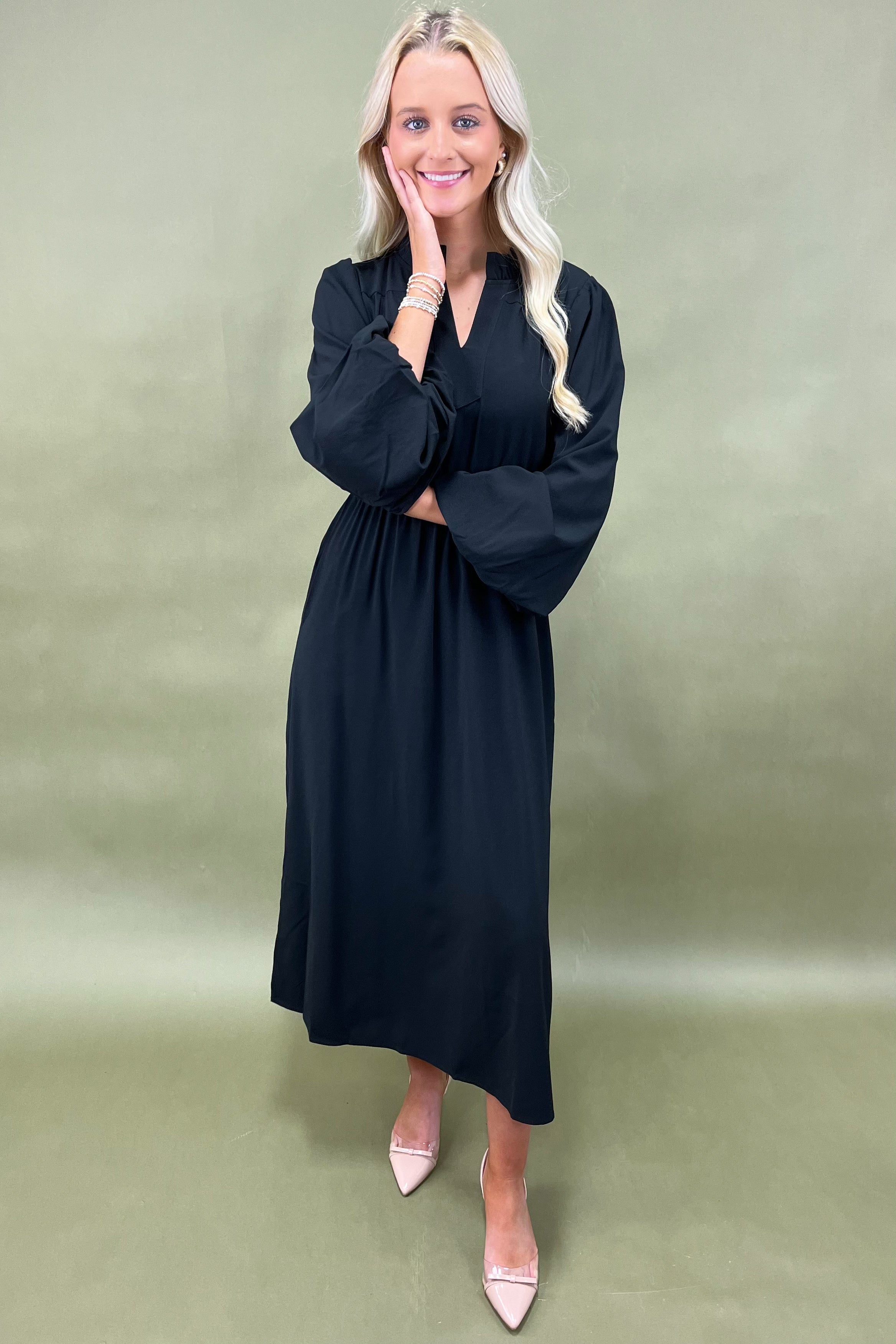 The details are where this maxi really sings. A softly ruffled neckline frames your face with just the right amount of romance, while the button-front placket adds a classic, tailored touch. The cinched waistline pulls everything together, giving you that flattering silhouette that moves gracefully without feeling restricted. And the long sleeves? They balance the length of the dress perfectly, offering coverage with an easy-breezy flow that feels elegant yet relaxed. Think of it as the perfect harmony between sophistication and effortlessness. 🎶