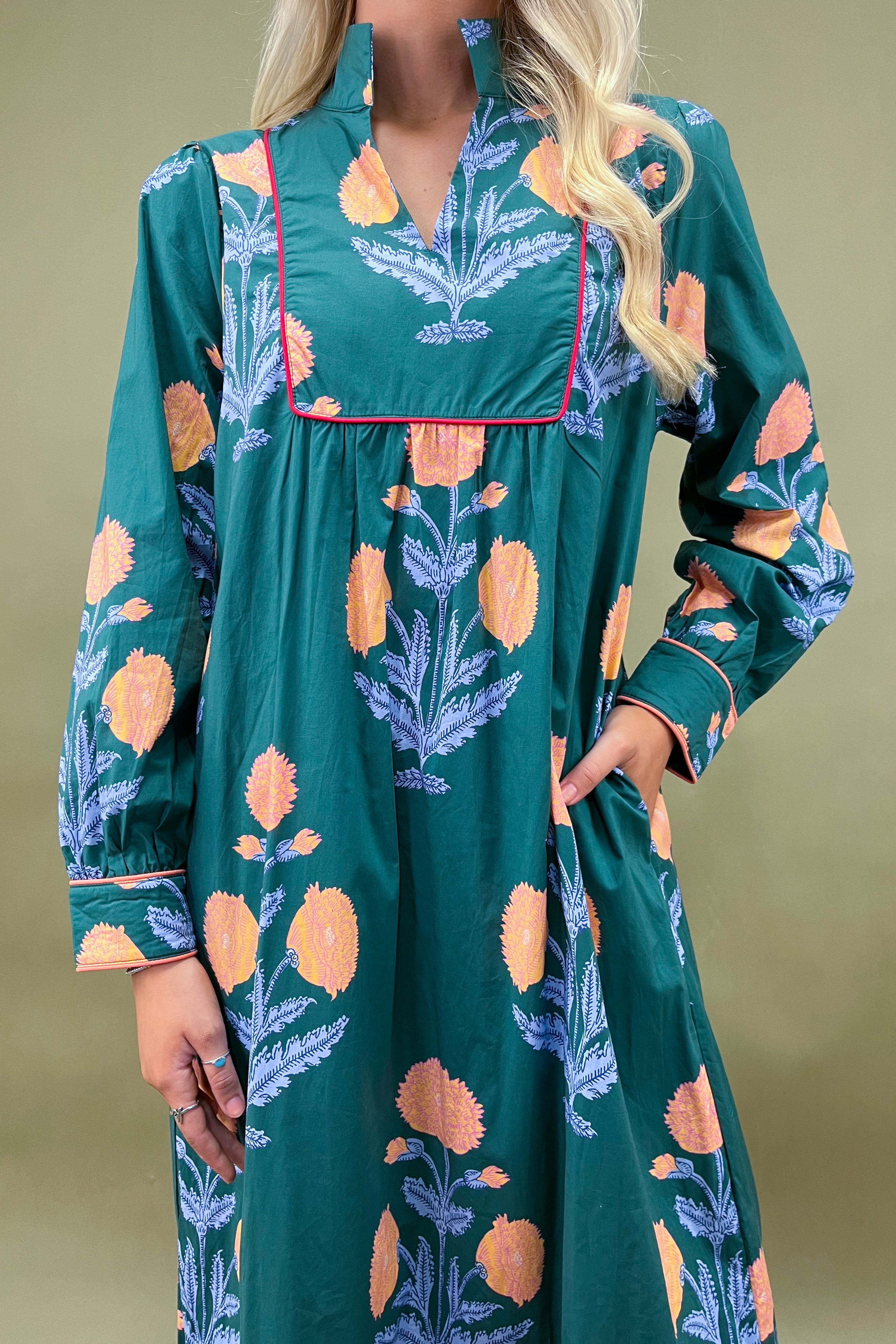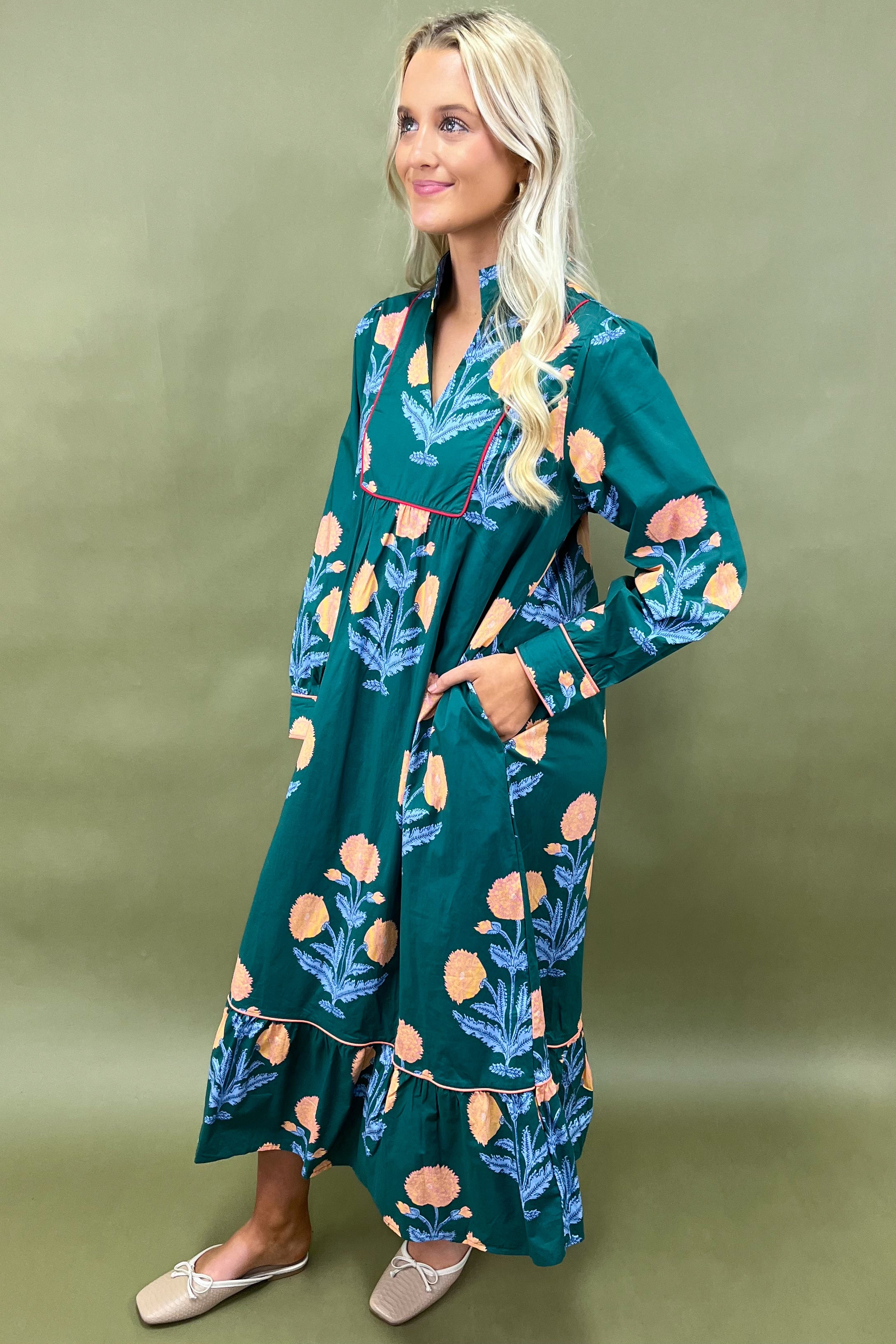 Step into bold, boho beauty with Marigold Meadow. With her deep green base and vibrant floral print in rich sunset orange and lavender blue, this maxi is a walking piece of art. The structured bib-front panel trimmed in contrasting piping adds a vintage touch, while the tiered hem gives her that flowy, feminine movement we all love.