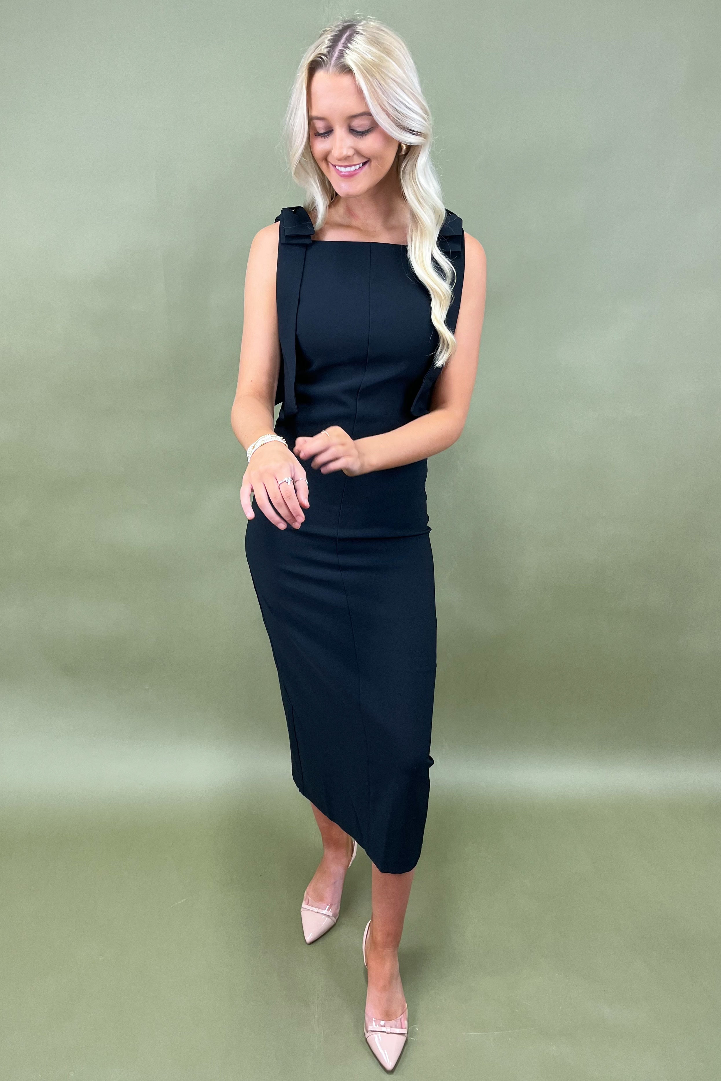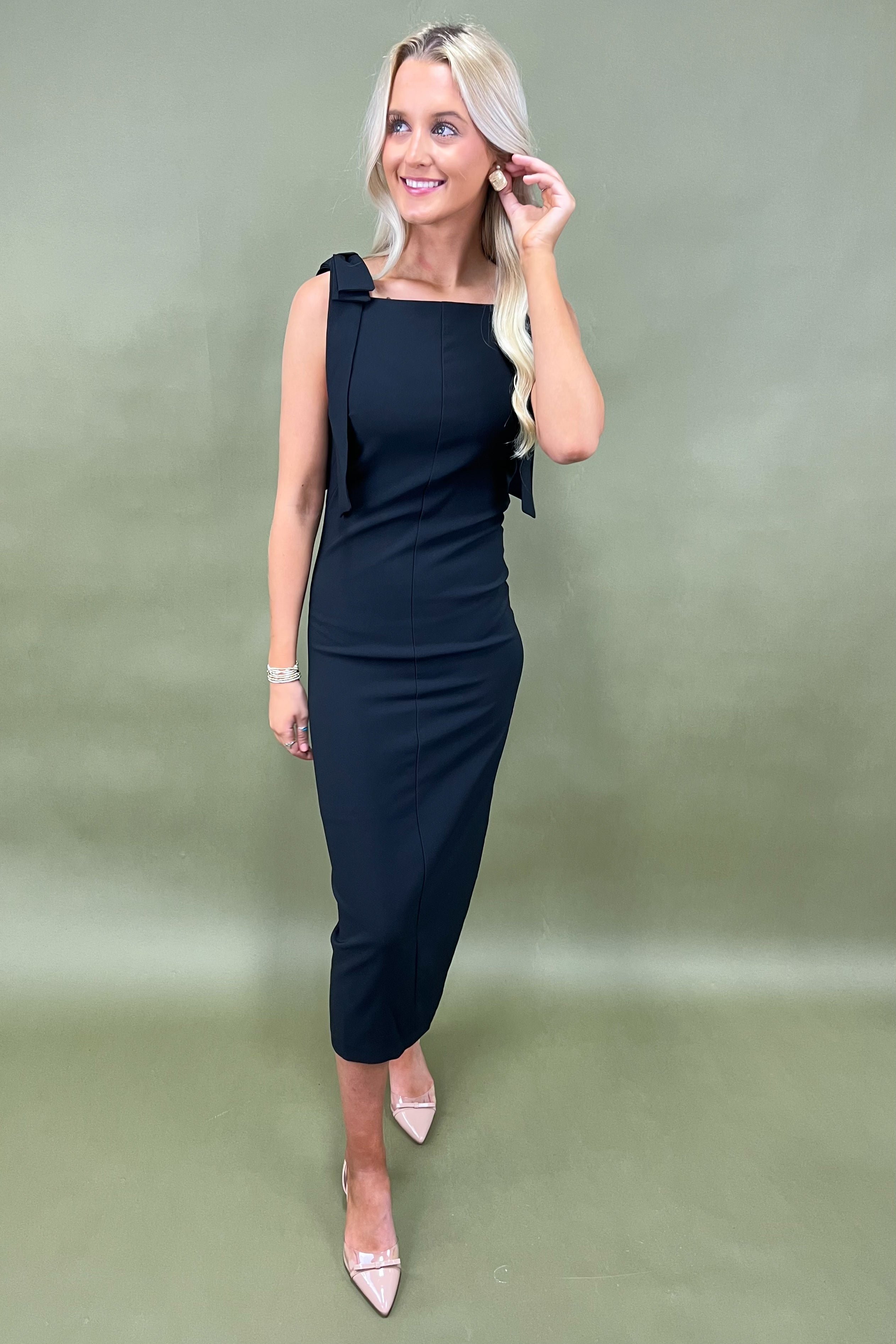 Crafted with a sleek, structured fit, this dress hugs in all the right places while still leaving room to move and dance the night away. The midi length keeps it sophisticated, while the bow-tied straps bring a touch of whimsy and personality. She’s giving timeless Old Hollywood energy — but with a fresh, modern twist.