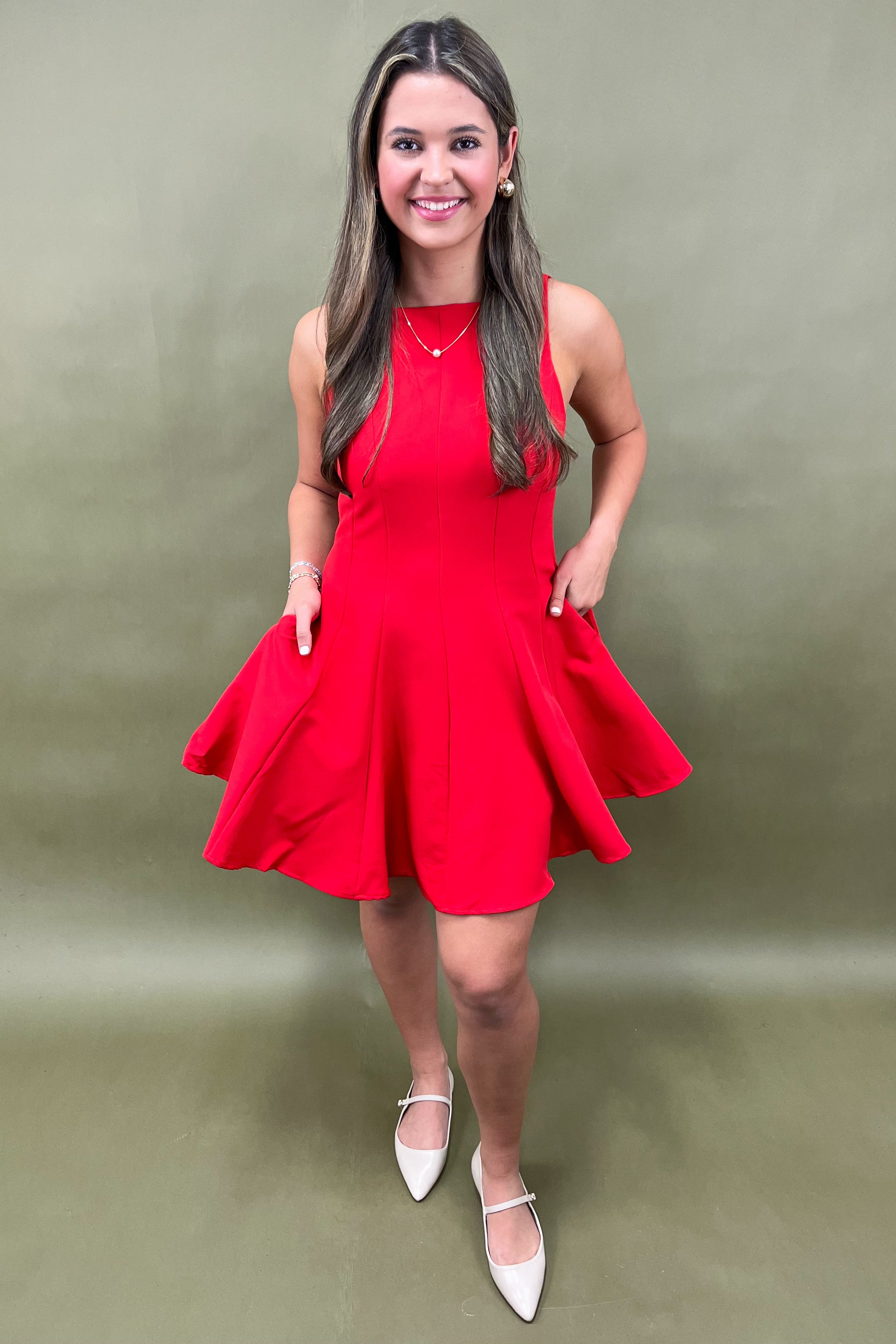 The magic of this dress is in the details. The sleeveless cut gives her a modern edge, while the paneling creates a flattering shape that moves with you. The flared hem adds just the right amount of drama—playful enough for a twirl, yet elegant enough to turn heads at any event. She’s confidence in clothing form, making you feel powerful, feminine, and oh-so-stylish every time you slip her on.