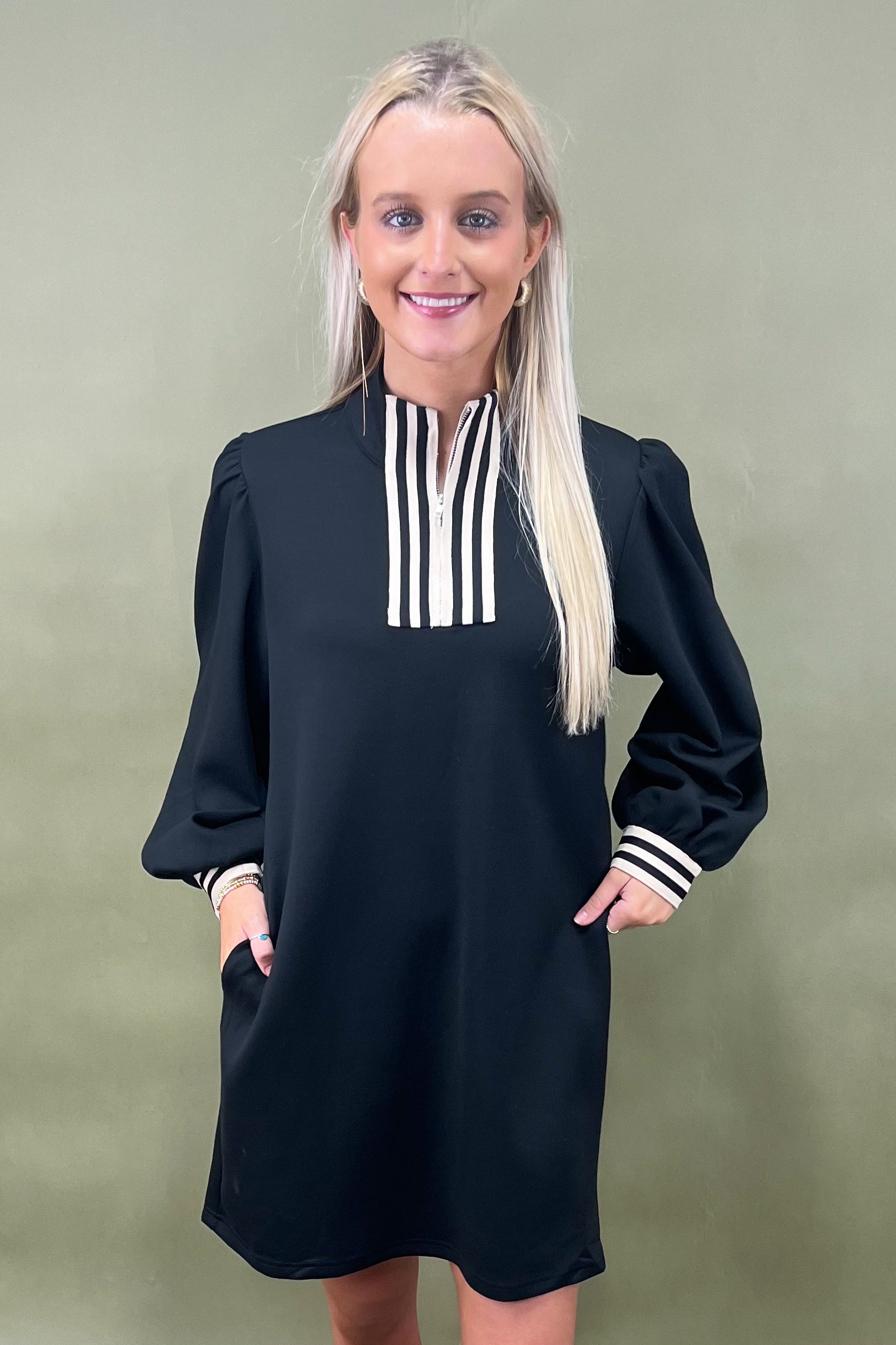 Crafted in timeless black, it’s that wardrobe hero you can wear on repeat and style a hundred different ways. The structured yet comfortable silhouette drapes just right—relaxed enough for ease, but polished enough to give off “I’m put together” vibes. The striped contrast detailing at the neckline and cuffs adds the coolest pop of visual interest, breaking up the black in a way that’s subtle yet chic. Add in the zip-front neckline and you’ve got a look that’s modern, versatile, and just a touch edgy.