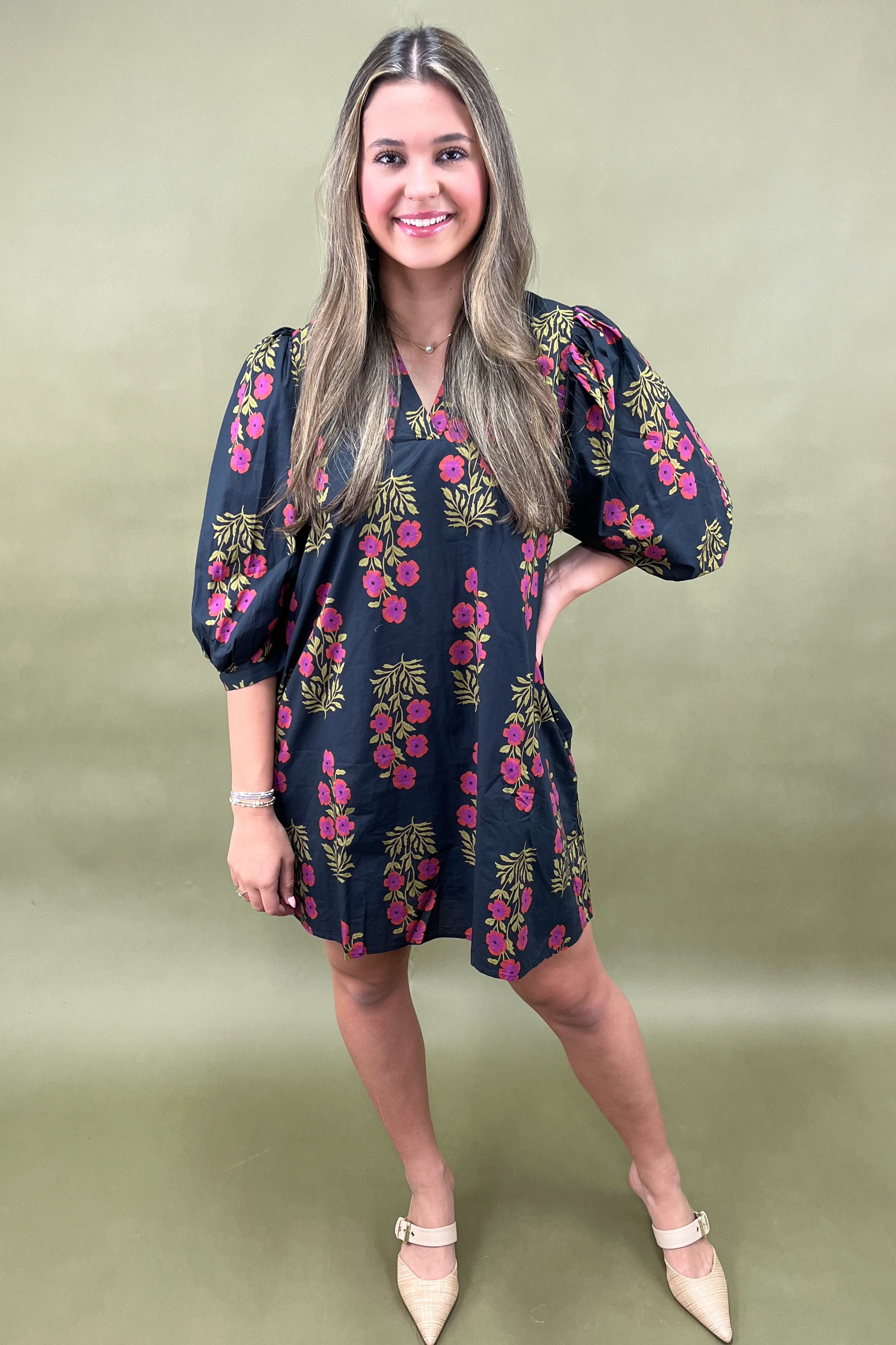 Meet the Whispering Willows Floral Dressâa dreamy mini that captures the romance of wild meadows, twilight skies, and cozy autumn strolls. đžâš With its lush floral print in vivid fuchsia and golden green tones dancing against a deep black canvas, this dress is where elegance meets effortless charm. If youâre looking for a piece that makes a statement while keeping comfort at the forefront, this is the one.
