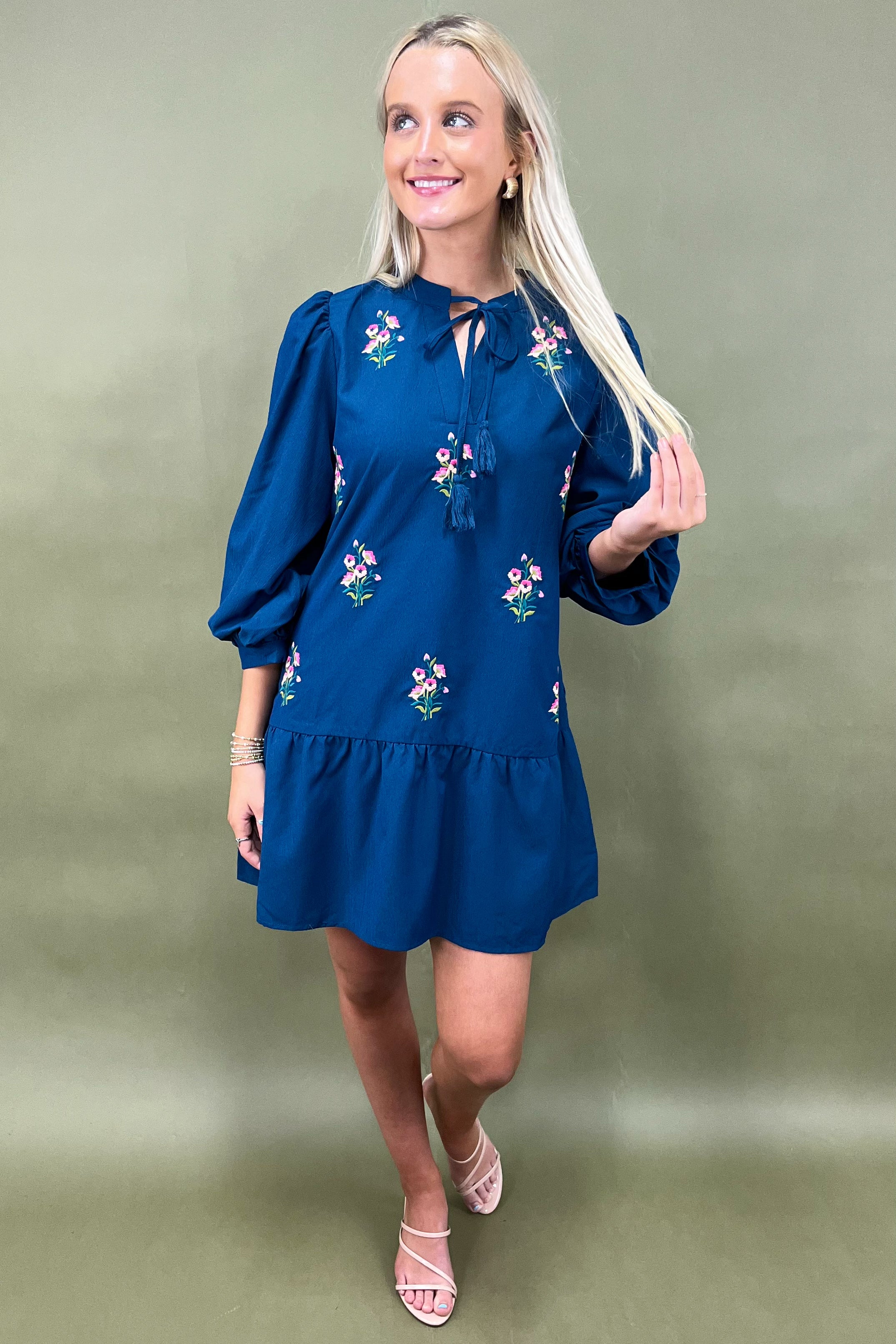 The navy base gives this piece an effortlessly chic backdrop, while the colorful embroidered florals pop with vibrant charm. Think of them as little hand-stitched daydreams scattered across your dress. 🌼🌺🌸 The tassel tie neckline adds a whimsical touch, keeping things playful yet polished, while the flowy long sleeves bring comfort and grace to your every move. And don’t miss that feminine drop waist ruffle detail—it’s flirty, flattering, and perfect for twirling through your day. 💃