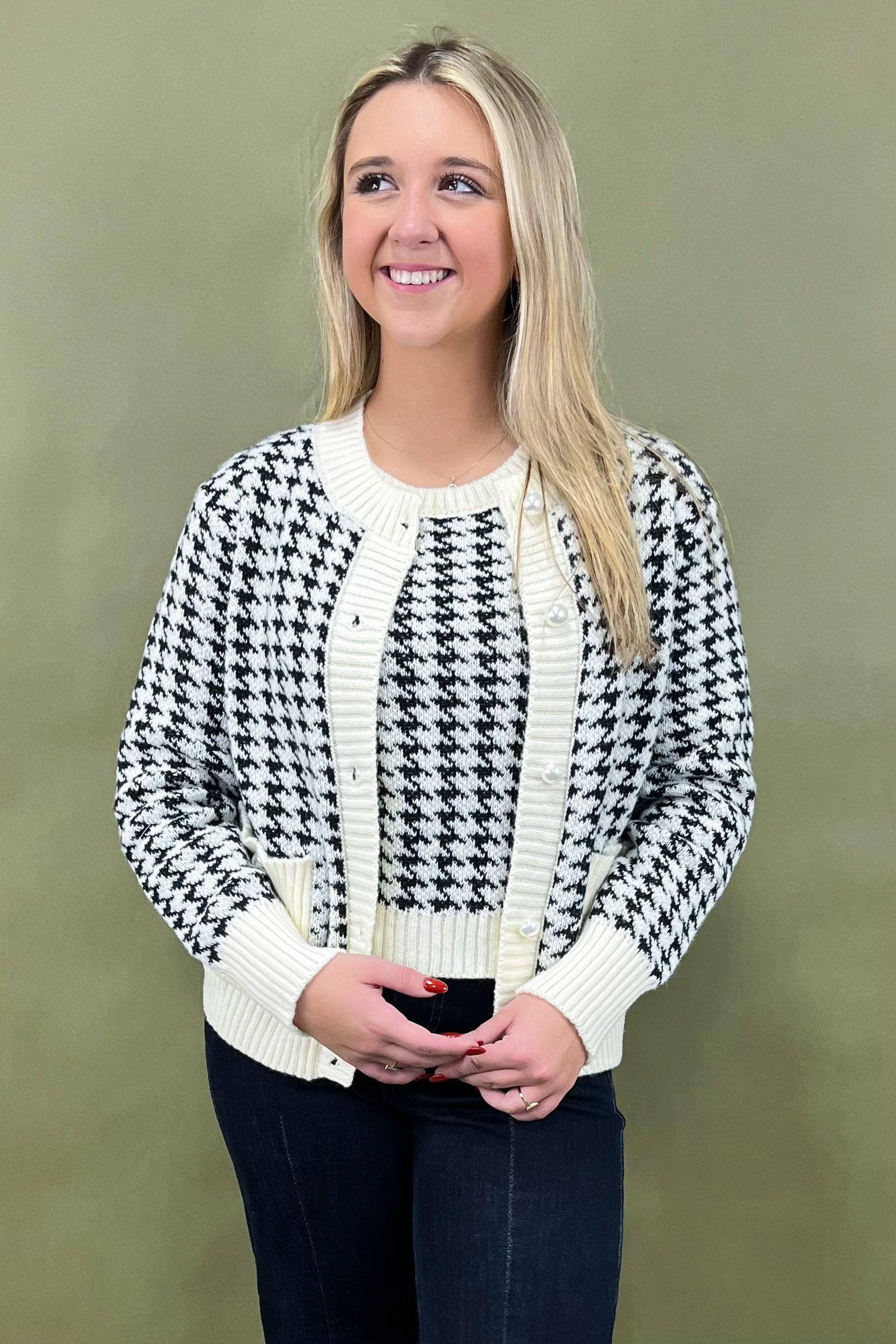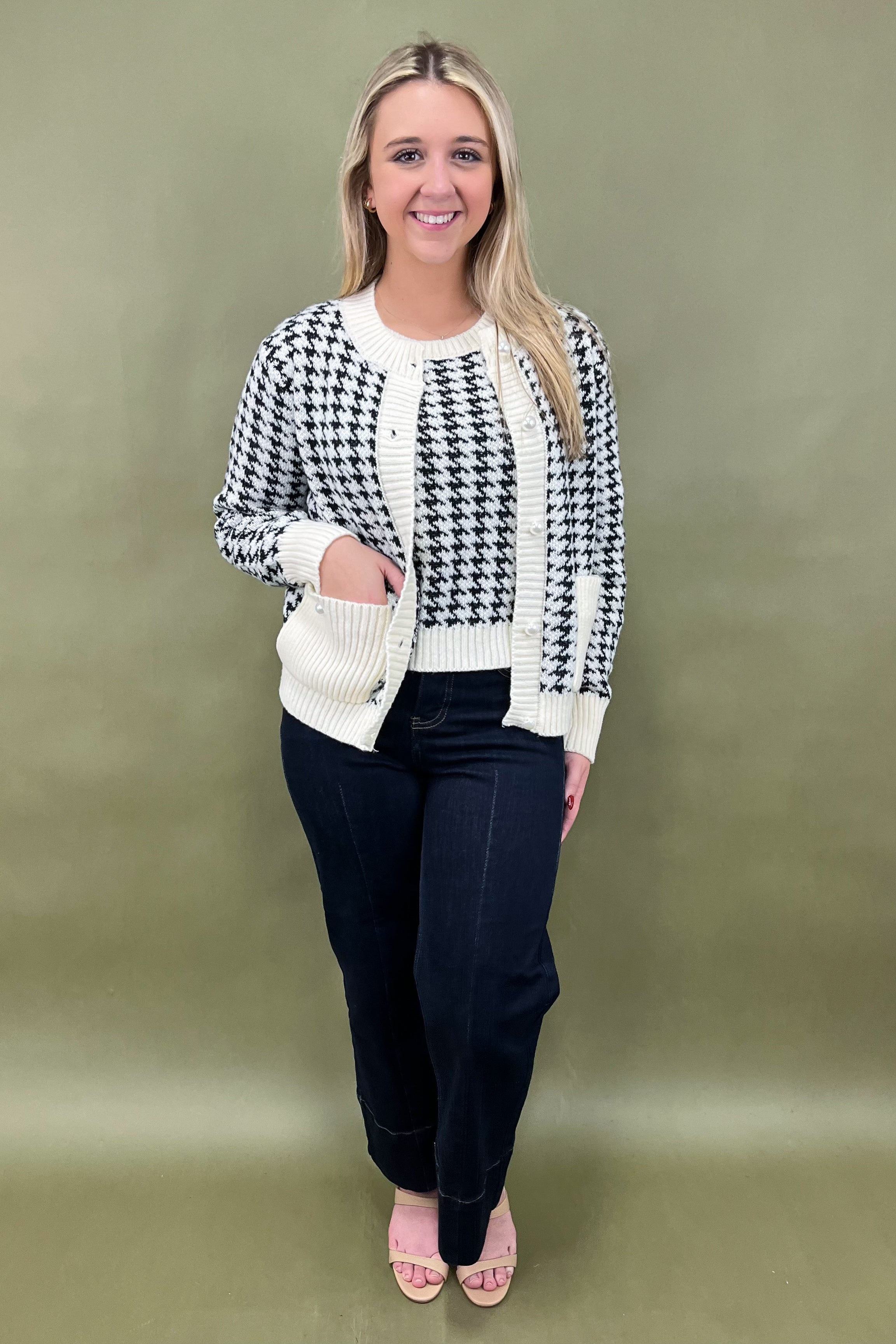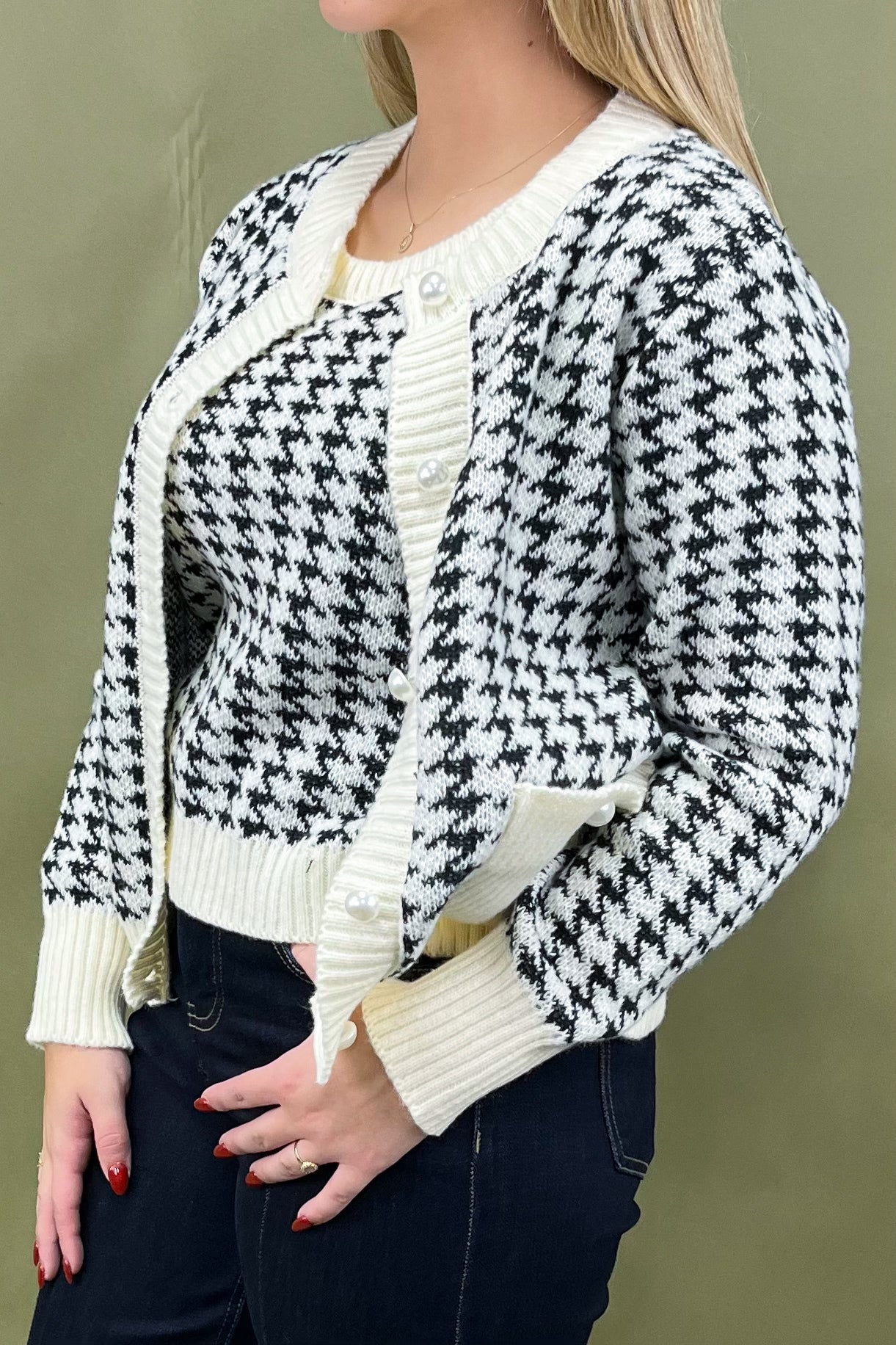 Say hello to your new go-to outfit heroes: the Check Me Out Tank & Cardigan set. This two-piece wonder is the ultimate mix of cozy, classic, and chic—aka everything your closet dreams are made of. From coffee dates to office days, and even those “I want to look cute but don’t want to try too hard” moments, this houndstooth duo has you covered in style. ✨
