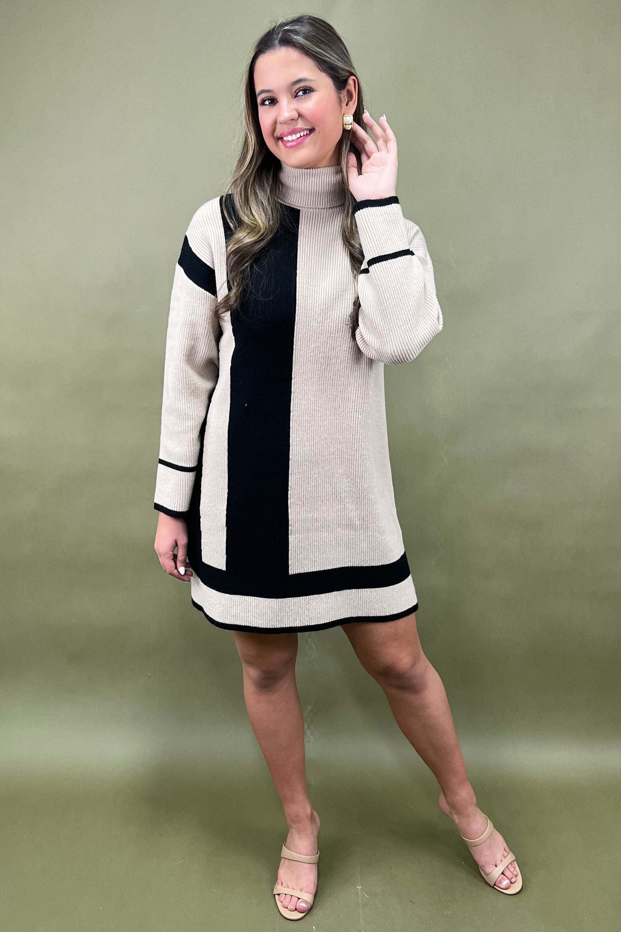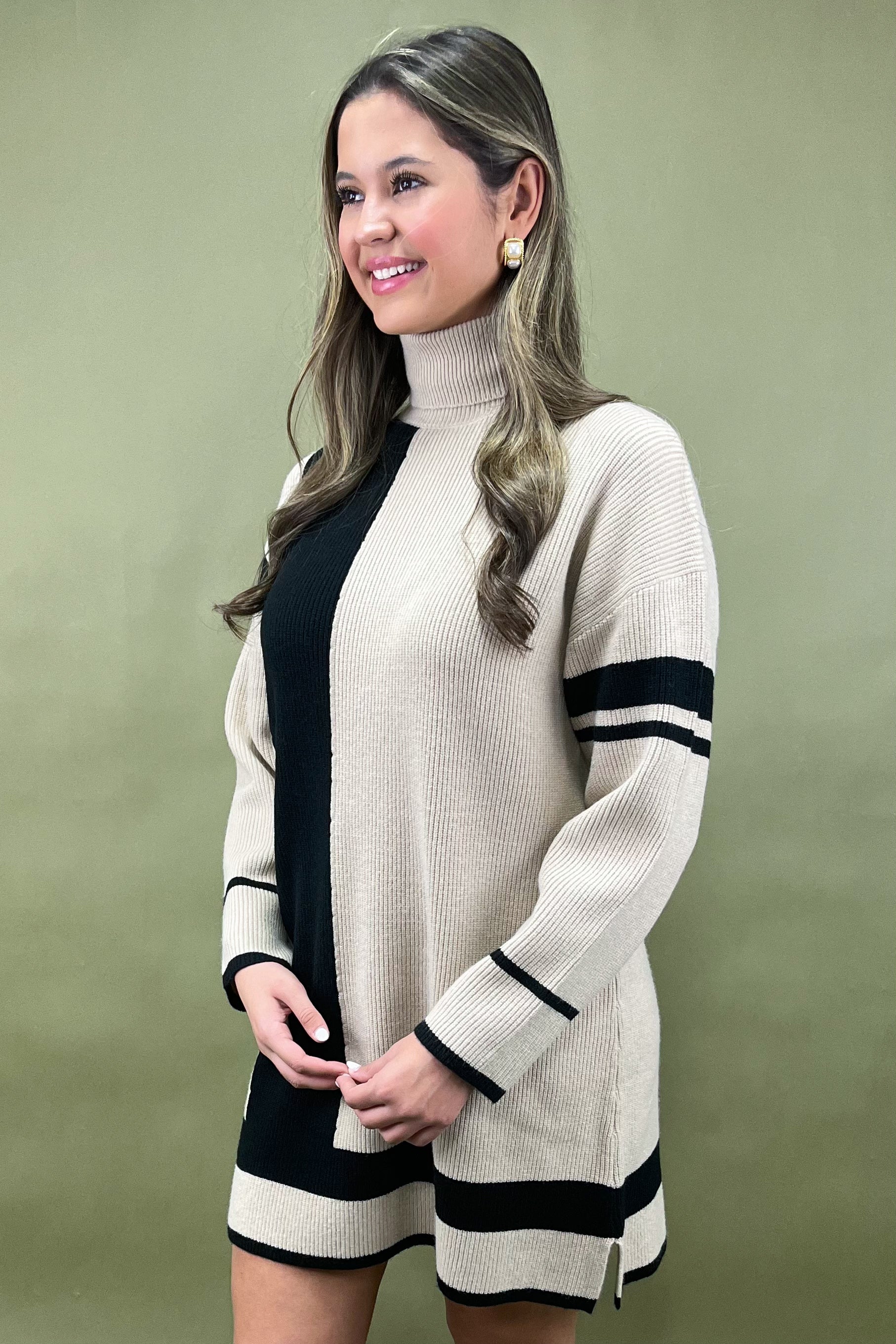 The turtleneck neckline adds an elevated touch â warm, cozy, and sophisticated all at once â while the long sleeves keep things polished and practical. This is one of those âthrow on and goâ pieces that make you look completely styled without even trying. And with its sleek, pocket-free silhouette, the Chic Lines Colorblock Sweater Dress stays smooth and streamlined for that effortlessly tailored finish.