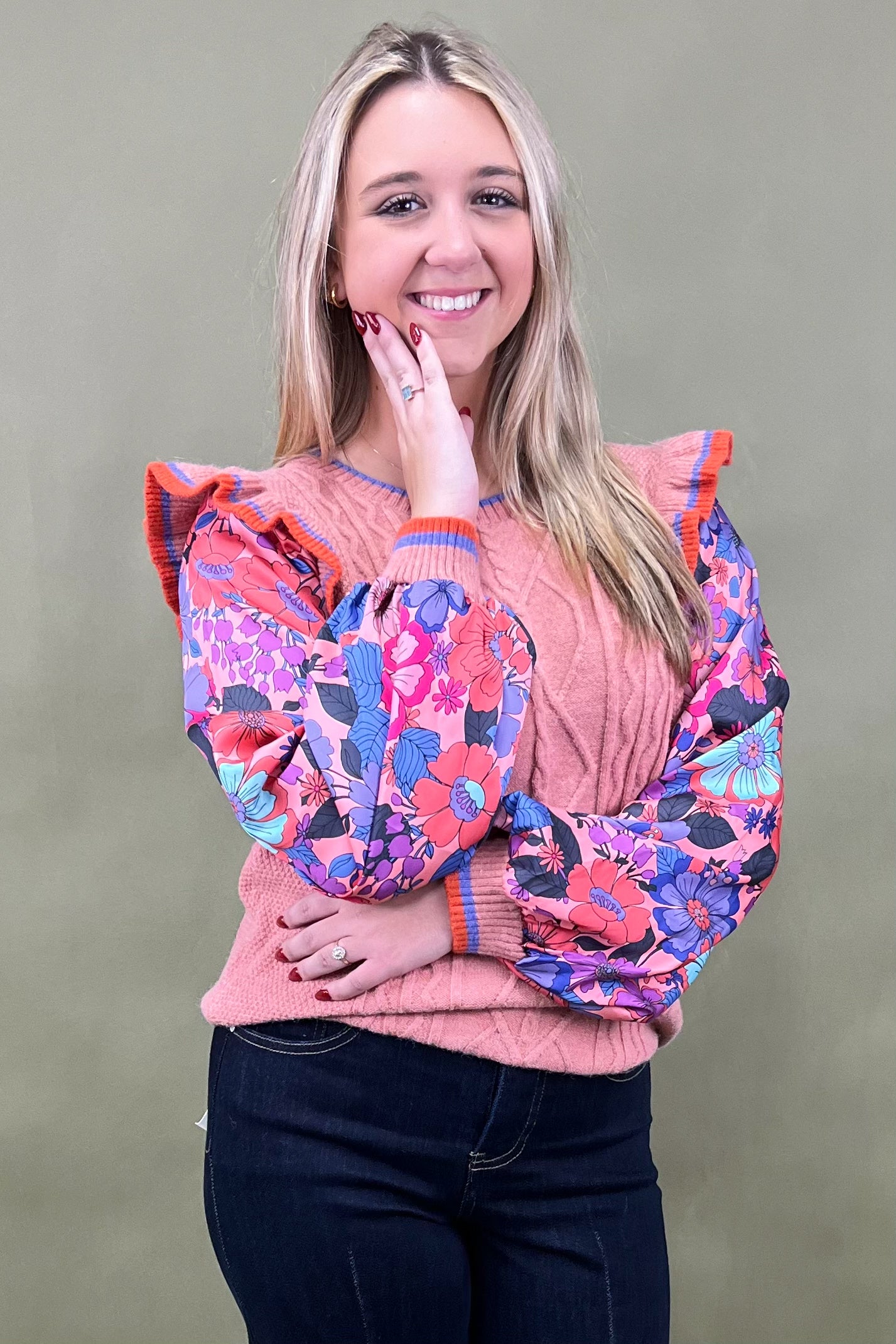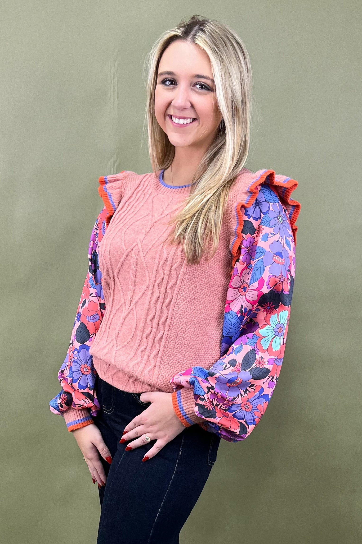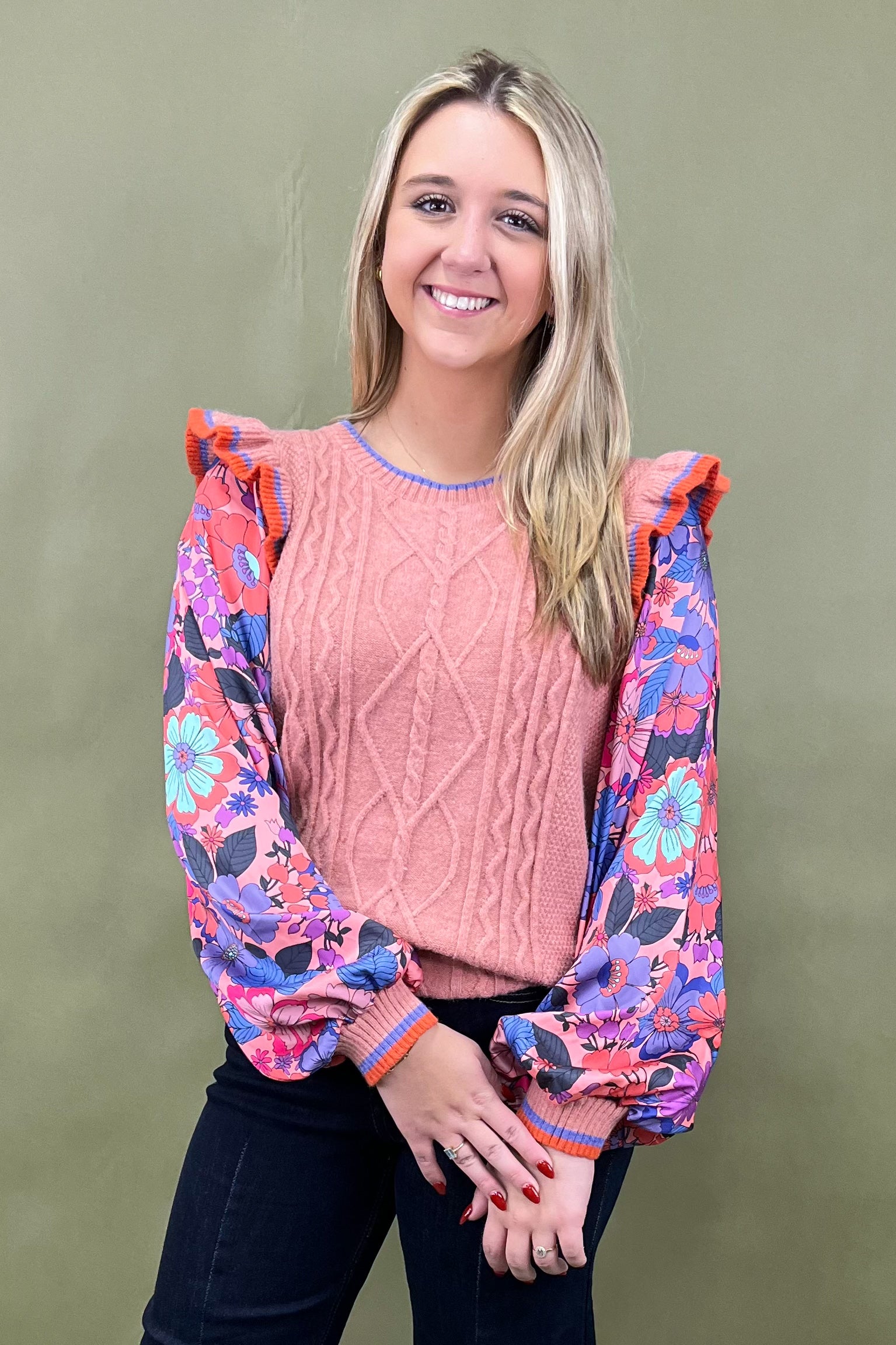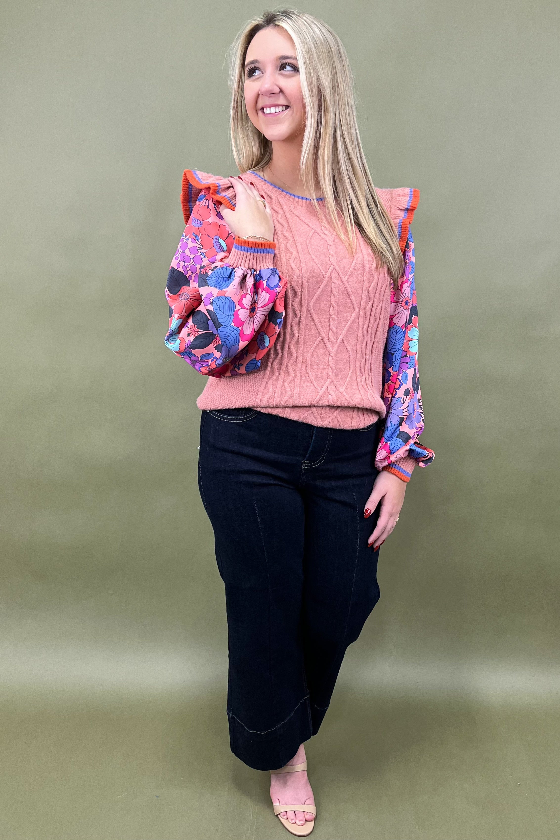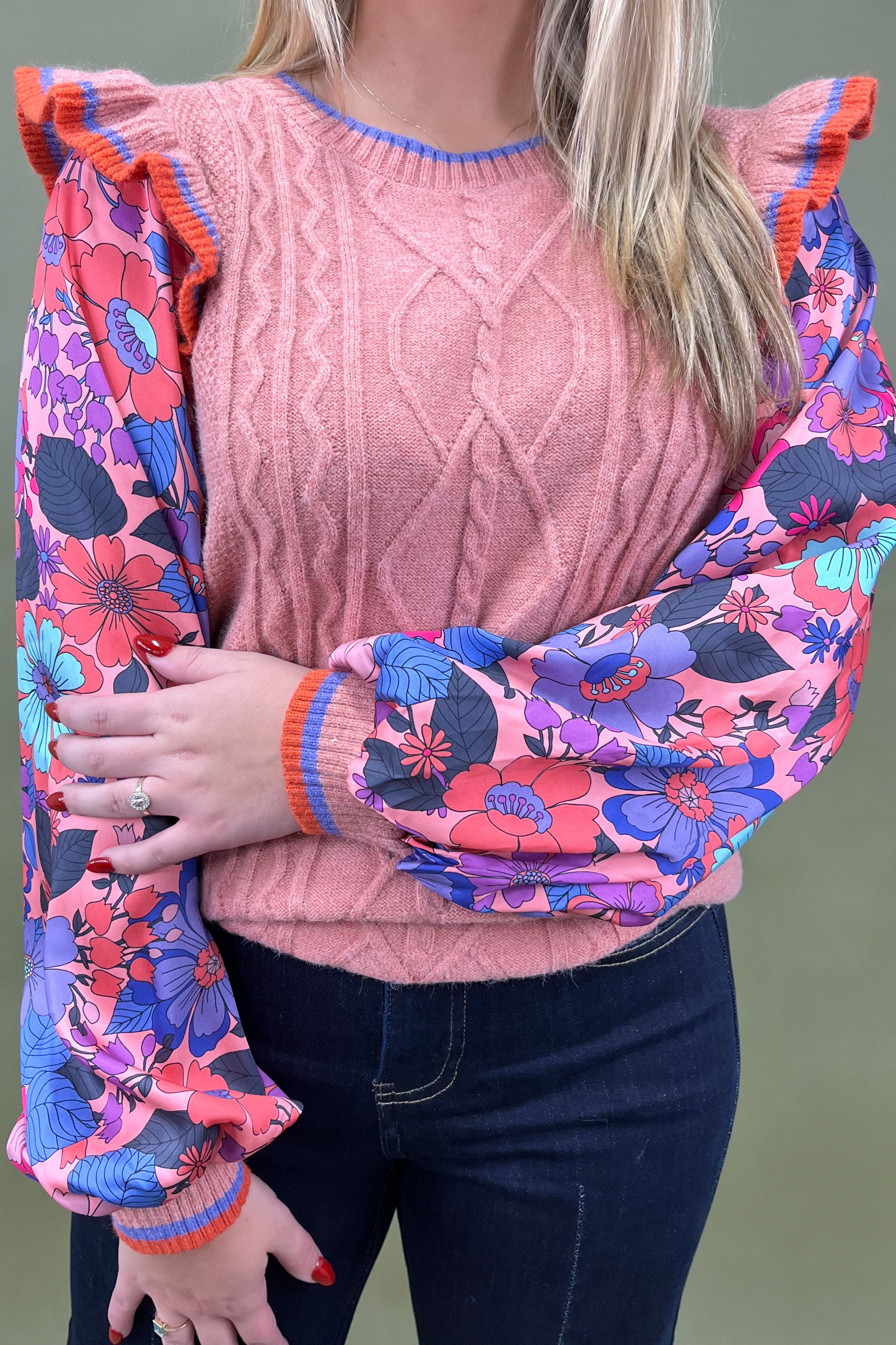 Say hello to your new “let’s grab coffee and catch up” sweater—the Cozy Conversation Top. With its cable knit texture, playful ruffle cap sleeves, and colorful trim details, this top is giving us all the warm-and-fuzzy feels. It’s sweet, chic, and just the right amount of quirky to stand out without trying too hard. ☕💖