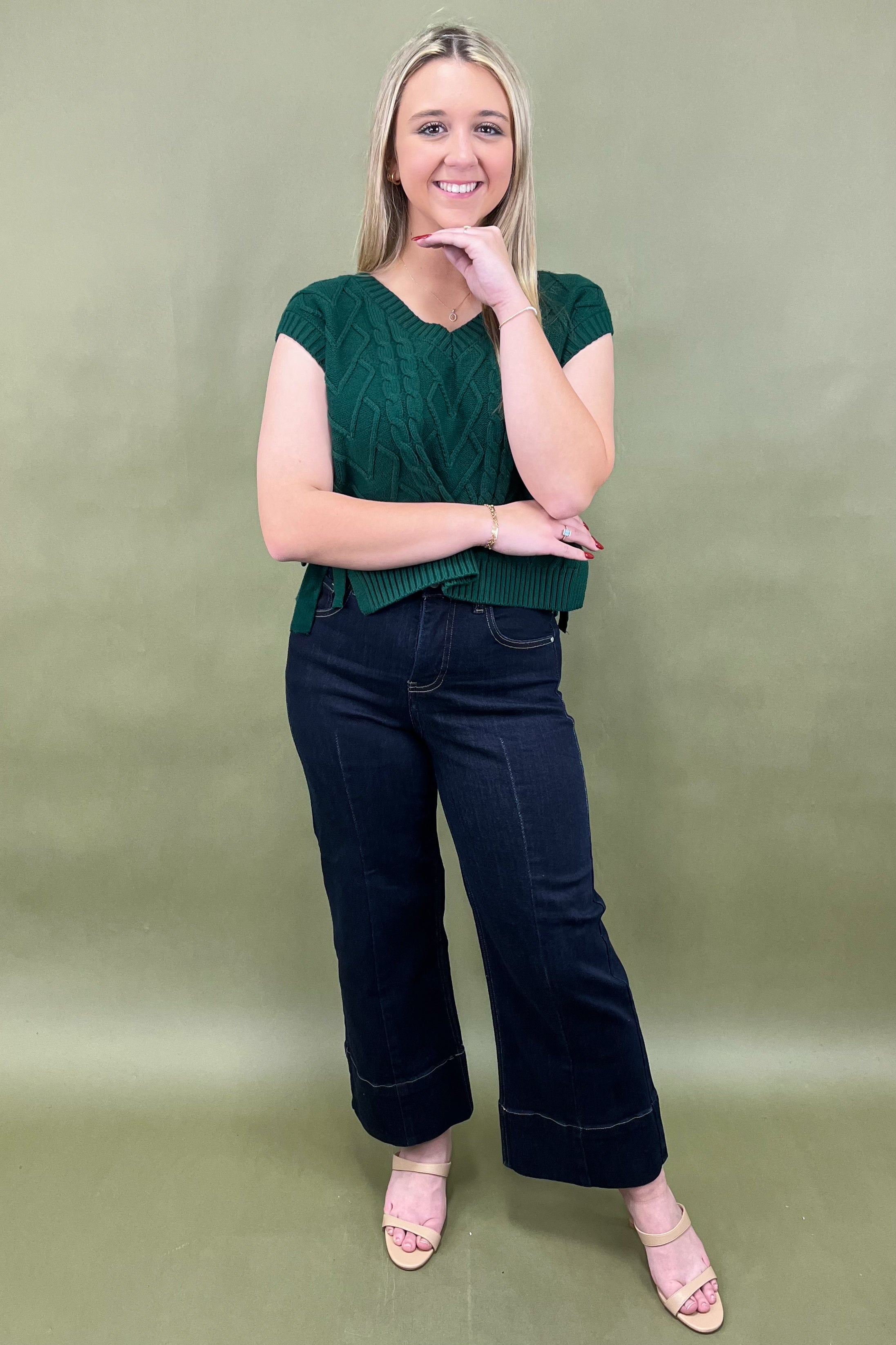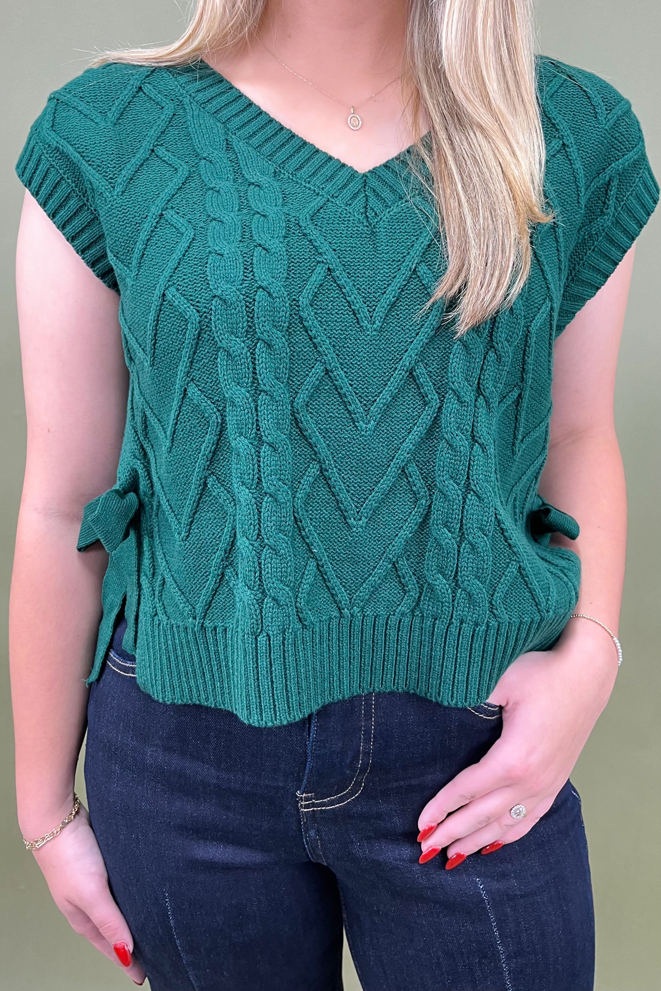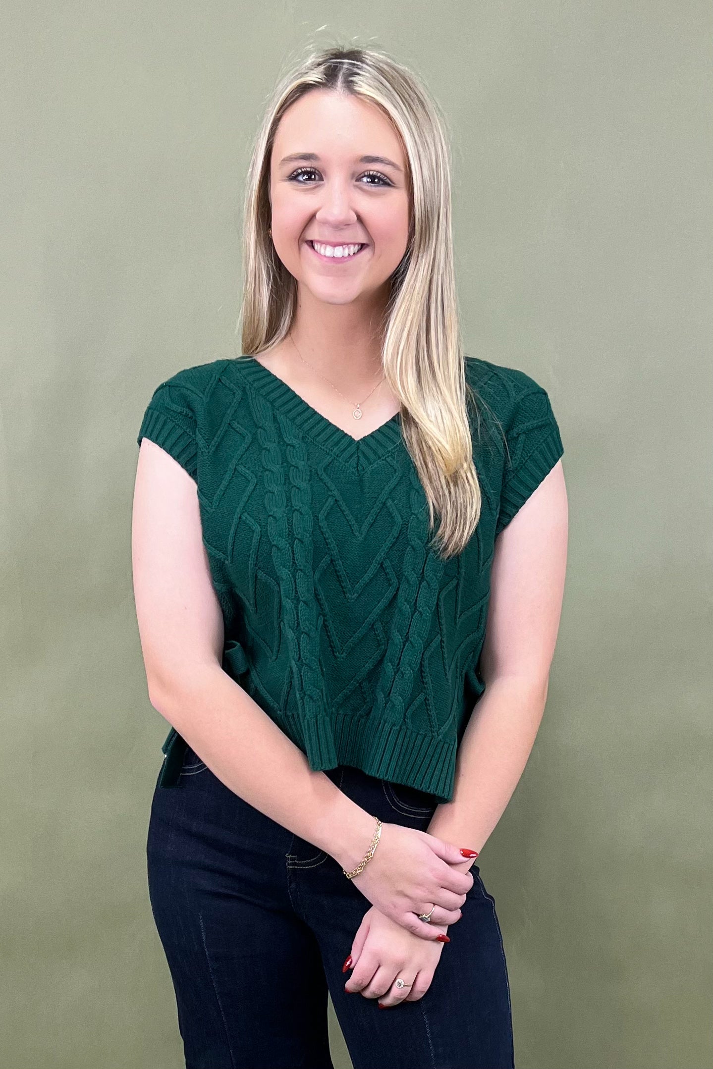 Crafted from a soft, midweight knit, this vest is full of texture and personality. The cable-knit pattern adds timeless dimension while the rich green hue gives your outfit a pop of seasonal color that’s still totally wearable year-round. Featuring a V-neckline that flatters every silhouette and a slightly cropped, boxy fit, it’s the perfect balance between laid-back and put-together.