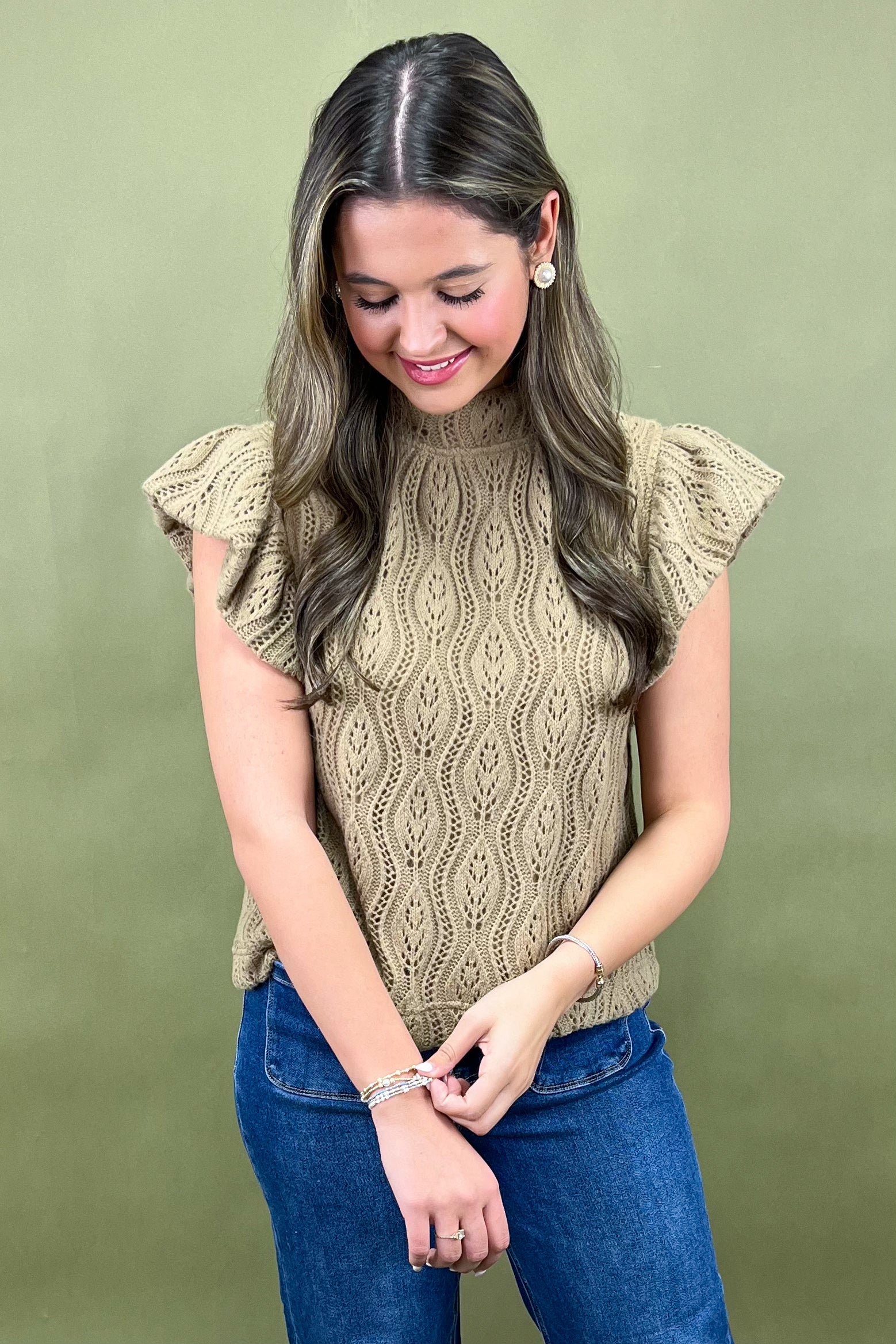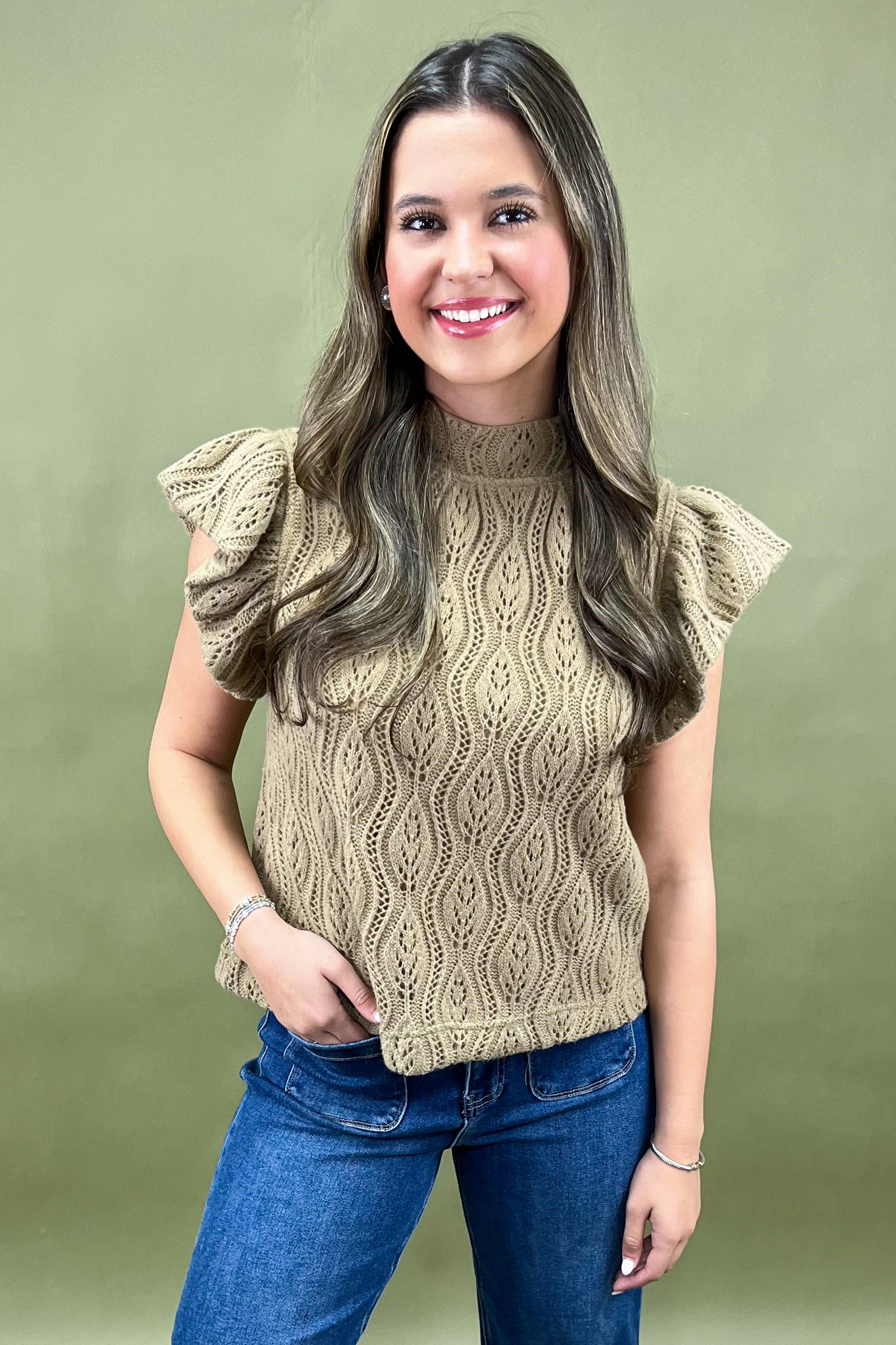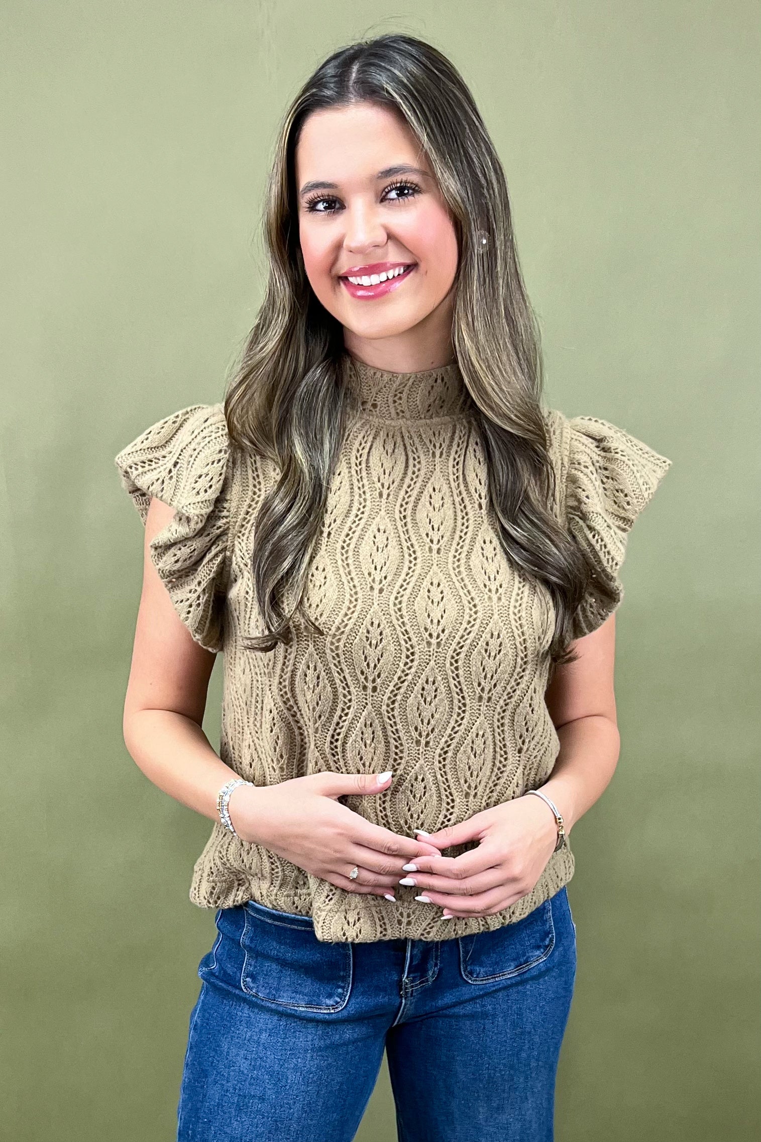 The high mock neckline adds a touch of structure and polish, while the flutter puff sleeves give it that romantic, feminine flair we canât resist. The open-knit wavy texture brings subtle movement and visual depth, making it a standout piece for transitioning between seasons. Whether youâre heading to brunch, the office, or a casual dinner out, this top makes you feel chic, soft, and a little bit golden âš.
