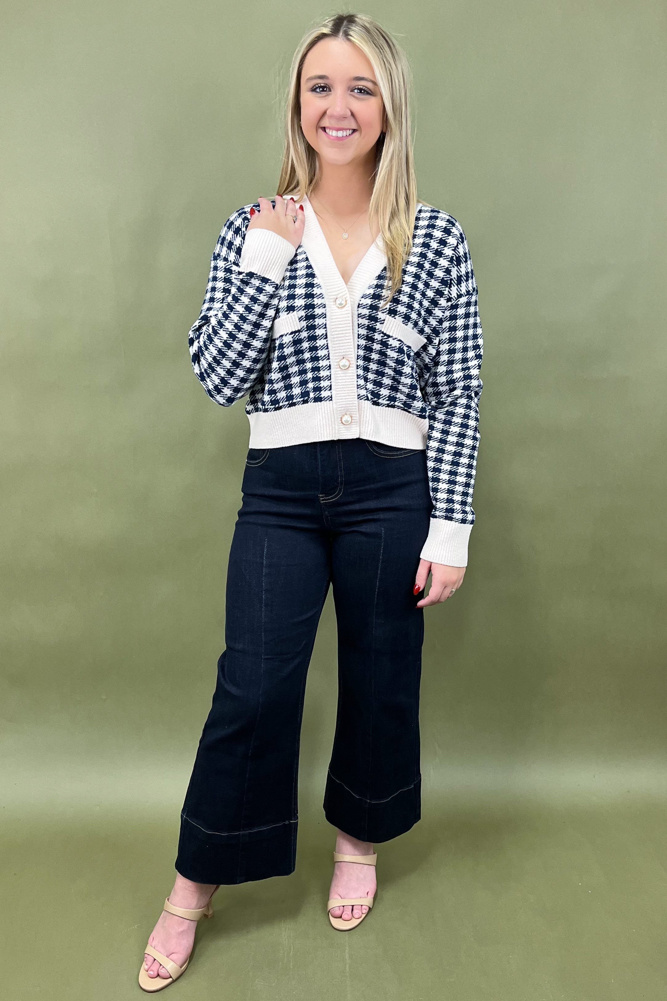 The navy-and-cream plaid pattern is classic, elevated, and endlessly versatile — think old-school charm with a chic, contemporary feel. The cream trim and ribbed hem create that perfect contrast that makes the design pop, while the soft ribbed cuffs add a cozy finish. And can we take a second for the buttons?! ✨ Each one is finished with pearl detailing framed in gold — the ultimate touch of glam that takes this cardigan from everyday to effortlessly elegant.